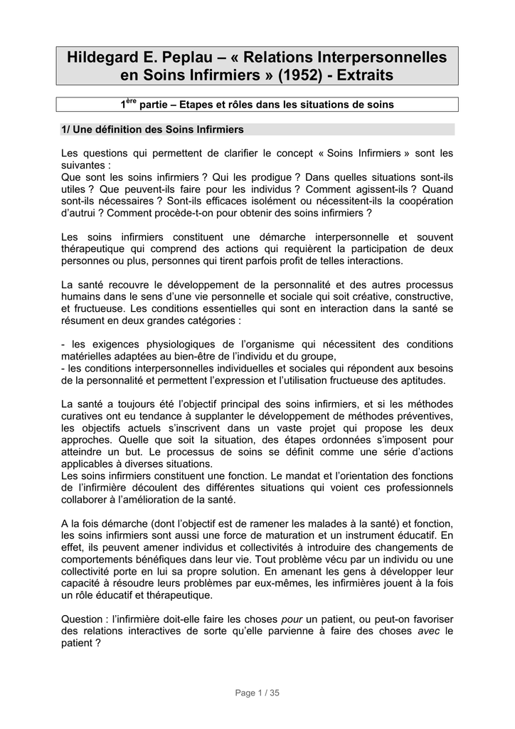 Hildegard E. Peplau – « Relations Interpersonnelles en Soins Infirmiers » (1952) - Extraits 1ère partie – Etapes et rôles dans les situations de soins 1/ Une définition des Soins Infirmiers Les questions qui permettent de clarifier le concept « Soins Infirmiers » sont les suivantes : Que sont les soins infirmiers ? Qui les prodigue ? Dans quelles situations sont-ils utiles ? Que peuvent-ils faire pour les individus ? Comment agissent-ils ? Quand sont-ils nécessaires ? Sont-ils efficaces isolément ou nécessitent-ils la coopération d’autrui ? Comment procède-t-on pour obtenir des soins infirmiers ? Les soins infirmiers constituent une démarche interpersonnelle et souvent thérapeutique qui comprend des actions qui requièrent la participation de deux personnes ou plus, personnes qui tirent parfois profit de telles interactions. La santé recouvre le développement de la personnalité et des autres processus humains dans le sens d’une vie personnelle et sociale qui soit créative, constructive, et fructueuse. Les conditions essentielles qui sont en interaction dans la santé se résument en deux grandes catégories : - les exigences physiologiques de l’organisme qui nécessitent des conditions matérielles adaptées au bien-être de l’individu et du groupe, - les conditions interpersonnelles individuelles et sociales qui répondent aux besoins de la personnalité et permettent l’expression et l’utilisation fructueuse des aptitudes. La santé a toujours été l’objectif principal des soins infirmiers, et si les méthodes curatives ont eu tendance à supplanter le développement de méthodes préventives, les objectifs actuels s’inscrivent dans un vaste projet qui propose les deux approches. Quelle que soit la situation, des étapes ordonnées s’imposent pour atteindre un but. Le processus de soins se définit comme une série d’actions applicables à diverses situations. Les soins infirmiers constituent une fonction. Le mandat et l’orientation des fonctions de l’infirmière découlent des différentes situations qui voient ces professionnels collaborer à l’amélioration de la santé. A la fois démarche (dont l’objectif est de ramener les malades à la santé) et fonction, les soins infirmiers sont aussi une force de maturation et un instrument éducatif. En effet, ils peuvent amener individus et collectivités à introduire des changements de comportements bénéfiques dans leur vie. Tout problème vécu par un individu ou une collectivité porte en lui sa propre solution. En amenant les gens à développer leur capacité à résoudre leurs problèmes par eux-mêmes, les infirmières jouent à la fois un rôle éducatif et thérapeutique. Question : l’infirmière doit-elle faire les choses pour un patient, ou peut-on favoriser des relations interactives de sorte qu’elle parvienne à faire des choses avec le patient ? Page 1 / 35 La relation infirmière - patient peut être représentée sur un continuum. A une extrémité se situent deux individus aux objectifs et aux intérêts différents. A l’autre, deux personnes qui travaillent ensemble à la résolution d’une difficulté qu’elles appréhendent de la même manière : Patient : buts personnels PATIENT Buts, intérêts entièrement séparés. Ils sont étrangers l’un à l’autre. Idées individuelles préconçues de la signification du problème médical, du rôle de chacun dans la situation problématique. Compréhension partiellement mutuelle et individuelle de la nature du problème médical. Compréhension mutuelle de la nature du problème, des rôles de l’infirmière et du patient, et des exigences respectives pour résoudre le problème. Buts de santé communs et partagés. Efforts de collaboration pour résoudre le problème ensemble de façon efficace. INFIRMIERE Infirmière : buts professionnels 2/ Les étapes de la relation infirmière - patient Quatre étapes interreliées se chevauchent dans la relation infirmière – patient : orientation, identification, exploitation et résolution. Chacune est caractérisée par une imbrication de rôles et de tâches relatifs au problème de santé posé. A mesure que l’infirmière et le patient apprennent à travailler en coopération pour résoudre les difficultés, ces rôles et tâches se redéfinissent. Ces quatre étapes incontournables s’imposent comme les composantes de toute relation complète de soins infirmiers. A l’admission Durant la période intensive de traitement Orientation Identification Exploitation Résolution Convalescence et réhabilitation Congé Page 2 / 35 L’étape d’Orientation La première, dite étape « d’orientation » est la période au cours de laquelle le patient identifie à la fois son problème de santé et les personnes ressources qu’il peut mettre à contribution pour gérer ce problème. Dans sa démarche de recherche d’une aide professionnelle, il exprime un besoin « ressenti » : un problème de santé est apparu dont il comprend plus ou moins la nature. La recherche d’aide constitue alors une situation d’apprentissage dynamique qui pourra donner lieu à une prochaine étape constructive de son évolution personnelle et sociale. Le patient veut trouver un sens à ce qu’il vit. Le rôle des soins infirmiers est d’aider à ce processus de clarification afin que le patient intègre sa maladie comme une expérience riche d’enseignement. Durant cette phase, le soignant et le soigné sont deux étrangers l’un pour l’autre. Ils n’ont pas encore conscience d’avoir quelque chose en commun. Pour autant, dés ce moment, l’infirmière met en œuvre quatre types de rôles infirmiers : - Personne ressource : elle donne au patient les informations nécessaires à la compréhension de son problème et de sa nouvelle situation, - Conseillère, assistante psychosociale : elle écoute le patient s’exprimer sur ses sentiments nés des évènements liés à sa maladie,