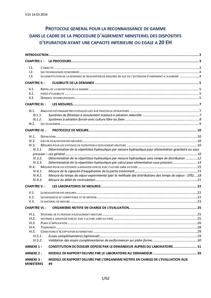 V13 14 03 2014 PROTOCOLE GENERAL POUR LA RECONNAISSANCE DE GAMME DANS LE CADRE DE LA PROCEDURE D'AGREMENT MINISTERIEL DES DISPOSITIFS D'EPURATION AYANT UNE CAPACITE INFERIEURE OU EGALE A 20 EH INTRODUCTION ............................................................................................................................................. 2 CHAPITRE I. : I.1. I.2. I.3. L’OBJECTIF........................................................................................................................................................................... 3 LES TECHNOLOGIES CO NCERNEES ............................................................................................................................................ 4 LA CONSTITUTION DE LA DEMANDE DE REALISATION DE MESURES EN VUE DE L’ EXTENSION D’AGREMENT A LA GAMME ....................... 4 CHAPITRE II. : II.1. II.2. II.3. LA PROCEDURE........................................................................................................................ 3 ELIGIBILITE DE LA DEMANDE .................................................................................................. 5 RAPPEL DE LA DEFINITION DE LA GAMME ................................................................................................................................. 5 PHASE D’ELIGIBILITE .............................................................................................................................................................. 5 DONNEES TECHNO LOGIQUES .................................................................................................................................................. 5 CHAPITRE III. : LES MESURES....................................................................................................................... 7 III.1. ANALYSES DES PARAMETRES PHYSIQUES LIES AUX PROCESSUS EPURATOIRES ................................................................................. 7 III.1.1. Systèmes de filtration à écoulement insaturé à aération naturelle ................................................................... 7 III.1.2. Systèmes à aération forcée avec culture libre ou fixée ....................................................................................... 8 III.2. LES TO LERANCES ................................................................................................................................................................... 9 CHAPITRE IV. : PROTOCOLE DE MESURE...................................................................................................... 10 IV.1. DEFINITIONS ......................................................................................................................................................................10 IV.2. LIEU DE REALISATION DES MESURES .......................................................................................................................................10 IV.3. MESURES PO UR LES SYSTEMES DE FILTRATION A ECOULEMENT INSATURE ...................................................................................10 IV.3.1. Détermination de la répartition hydraulique par mesure hydraulique pour alimentation gravitaire ou sous pression – cas général............................................................................................................................................................10 IV.3.2. Détermination de la répartition hydraulique par mesure hydraulique sans rampe de distribution ..............12 IV.3.3. Détermination de la répartition hydraulique par calcul pour alimentation sous pression .............................14 IV.4. MESURES PO UR LES SYSTEMES A AERATION FORC EE AVEC CULTURE LIBRE O U FIXEE ......................................................................15 IV.4.1. Mesure de la capacité d'oxygénation de la partie traitement..........................................................................15 IV.4.2. Mesure du temps de séjour expérimental (par la méthode des distributions des temps de séjour : DTS) ....18 IV.4.3. Mesure du débit de recirculation ........................................................................................................................21 CHAPITRE V. : V.1. V.2. V.3. LES LABORATOIRES DE MESURES .......................................................................................... 22 LA REALISATION DES MESURES ..............................................................................................................................................22 LES EXIGENCES DE COMPETENCE ET DE MOYENS ......................................................................................................................22 LE MATERIEL DE MESURE .....................................................................................................................................................23 CHAPITRE VI. : ORGANISME NOTIFIE EN CHARGE DE L’EVALUATION................................................................ 25 VI.1. SYSTEMES DE FILTRATION A ECO ULEMENT INSATURE ................................................................................................................25 VI.2. SYSTEMES A AERATION FORCEE AVEC CULTURE LIBRE O U FIXEE ..................................................................................................25 VI.3. PLAGE D’ APPLICATION .........................................................................................................................................................26 VI.4. TOLERANCES ......................................................................................................................................................................28 VI.5. CONDITIONS D’ACCEPTATION ALTERNATIVES ..........................................................................................................................29 VI.5.1. Essais complémentaires (optionnel) ...............