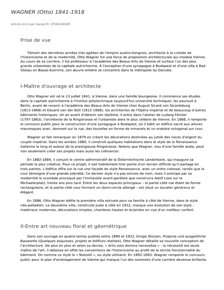 WAGNER (Otto) 1841-1918 Article écrit par Harald R. STÜHLINGER Prise de vue Témoin des dernières années très agitées de l'empire austro-hongrois, architecte à la croisée de l'historicisme et de la modernité, Otto Wagner fut une force de proposition architecturale qui modela Vienne. Au cours de sa carrière, il fut professeur à l'académie des Beaux-Arts de Vienne et surtout l'un des plus grands urbanistes de la capitale autrichienne. À l'exception d'une synagogue à Budapest et d'une villa à Bad Vöslau en Basse-Autriche, son œuvre entière se concentre dans la métropole du Danube. I-Maître d'ouvrage et architecte Otto Wagner est né le 13 juillet 1841, à Vienne, dans une famille bourgeoise. Il commence ses études dans la capitale autrichienne à l'Institut polytechnique (aujourd'hui université technique), les poursuit à Berlin, avant de revenir à l'académie des Beaux-Arts de Vienne chez August Sicard von Sicardsburg (1813-1868) et Eduard van der Nüll (1812-1868), les architectes de l'Opéra impérial et de beaucoup d'autres bâtiments historiques. Un an avant d'obtenir son diplôme, il entre dans l'atelier de Ludwig Förster (1797-1863), l'architecte de la Ringstrasse et l'urbaniste alors le plus célèbre de Vienne. En 1868, il remporte le concours public pour la construction d'une synagogue à Budapest, où il bâtit un édifice sacré aux allures mauresques avec, donnant sur la rue, des tourelles en forme de minarets et un oratoire octogonal sur cour. Wagner se fait remarquer en 1879 en créant les décorations destinées au jubilé des noces d'argent du couple impérial. Dans les années 1880, il construit quelques habitations dans le style de la Renaissance italienne le long et autour de la prestigieuse Ringstrasse. Notons que Wagner, issu d'une famille aisée, peut non seulement créer ses projets mais aussi les cofinancer. En 1882-1884, il conçoit le centre administratif de la Österreichische Länderbank, qui inaugure sa période la plus créative. Pour ce projet, il sait habilement tirer partie d'un terrain difficile qu'il partage en trois parties. L'édifice offre sur la rue une façade de style Renaissance, avec un ordre colossal, tandis que la cour témoigne d'une grande sobriété. Ce dernier style n'a pas encore de nom, mais il anticipe par sa modernité le scandale provoqué par l'immeuble avant-gardiste que construira Adolf Loos sur la Michaelerplatz, trente ans plus tard. Entre les deux espaces principaux – la partie côté rue étant de forme rectangulaire, et la partie côté cour formant un demi-cercle allongé – est situé un escalier généreux et élégant. En 1886, Otto Wagner édifie la première villa estivale pour sa famille à côté de Vienne, dans le style néo-palladien. La deuxième villa, construite juste à côté en 1912, marque une évolution de son style : matériaux modernes, décorations simples, chambres hautes et éclairées en vue d'un meilleur confort. II-Entre art nouveau floral et géométrique Dans son ouvrage en quatre tomes publiés entre 1890 et 1922, Einige Skizzen, Projecte und ausgeführte Bauwerke (Quelques esquisses, projets et édifices réalisés), Otto Wagner détaille sa nouvelle conception de l'architecture. De plus en plus et selon sa devise, « Artis sola domina necessitas » : la nécessité est seule maître de l'art, il délaisse en effet les conventions de l'historicisme au profit de la stricte fonctionnalité du bâtiment. On nomme ce style le « Nutzstil », ou style utilitaire. En 1892-1893, Wagner remporte le concours public pour le plan d'aménagement de Vienne qui marque l'un des sommets d'une carrière devenue brillante. En 1894, il est nommé professeur d'architecture à l'académie des Beaux-Arts et il est chargé, à la même époque, de deux projets majeurs : la régulation du canal du Danube et la construction de la plus grande infrastructure de la métropole, le métro de Vienne. Étant donné l'importance de ces chantiers entrepris entre 1894 et 1901, Otto Wagner va associer ses collaborateurs, Joseph Maria Olbrich et Joseph Hoffmann, et ses étudiants les plus doués à son travail. L'architecte conçoit le réseau de transport viennois avec ses trente stations, ses voies, ses ponts, dans un style utilitaire simple et fonctionnel privilégiant la clarté technique. Une attention particulière est cependant apportée aux « stations clés » qui sont parées de décorations : la station pour la cour impériale à Hietzing, près du château de Schönbrunn et, plus encore, celle de la Karlsplatz (1898), deviennent ainsi les emblèmes publics de l'Art nouveau viennois. La décoration composée de courbes végétales, caractéristique familière à l'Art nouveau de l'Europe de l'Ouest – par exemple chez Victor Horta – revêt ici des formes plus géométriques et leur association à la luxueuse élégance de motifs classiques font sensation. Otto Wagner devient ainsi l'architecte le plus représentatif du style Sécession à Vienne, la variante autrichienne de l'Art nouveau, qui regroupe ces artistes autour de son ami Gustav Klimt. Cette même année 1898, Otto Wagner édifie deux immeubles sur la Linke Wienzeile, un boulevard reliant le centre de Vienne à Schönbrunn. Dans le premier d'entre eux, l'accent est mis sur l'abstraction formelle au service d'un style clair et intemporel. Les étages supérieurs sont dépourvus de décorations sculptées, et les surfaces restent planes, mais Wagner y applique des majoliques, ces carreaux à motif floral, qui ont donné son nom à l'immeuble : « Maison des majoliques ». L'immeuble voisin, construit également par l'architecte, offre quant à lui une façade de crépi sobre et fluide, mais décorée avec fantaisie de gerbes dorées et de plumes de paon stylisées. Wagner innove également par le traitement de l'angle du bâtiment, auquel il donne une forme arrondie. Le point culminant du style Art nouveau de l'architecte est atteint ave
