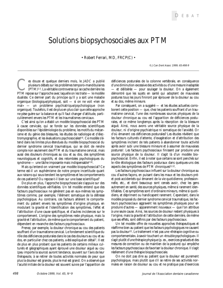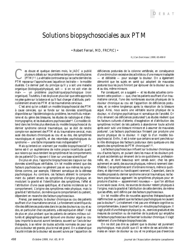 D É B A T Solutions biopsychosociales aux PTM • Robert Ferrari, MD, FRCP(C) • © J Can Dent Assoc 1999; 65:498-9 C es douze et quelque derniers mois, le JADC a publié plusieurs débats sur les problèmes temporo-mandibulaires (PTM)1-3. La véritable controverse qui se cache derrière les PTM repose sur l’approche avec laquelle on les traite — le modèle dualiste. Ce dernier part du principe qu’il y a soit une maladie organique (biologique/physique), soit — si on ne voit «rien de mal» — un problème psychiatrique/psychologique (non organique). Toutefois, il est de plus en plus clair que cette approche ne pèse guère sur la balance et qu’il faut changer d’attitude, particulièrement envers les PTM et les traumatismes cervicaux. C’est ainsi qu’on a établi un modèle biopsychosocial des PTM à cause cervicale, qui se fonde sur les données scientifiques disponibles sur l’épidémiologie du problème, les motifs du mécanisme et du génie des blessures, les études de radiologie et d’électromyographie, et les évaluations psychosociales4-6. Ce modèle s’étend dans les limites plus étendues du modèle biopsychosocial du dernier syndrome cervical traumatique, qui se doit de rendre compte non seulement des PTM et du traumatisme cervical, mais aussi des douleurs chroniques au cou et au dos, des symptômes neurologiques et cognitifs, et des retombées psychologiques du syndrome — une tâche imposante mais indispensable7-10. Mais qu’entend-on vraiment par modèle biopsychosocial? Ce terme est-il un euphémisme de notre propre incertitude quant aux raisons qui sous-tendent les symptômes et les comportements de ces patients? Ou repose-t-il bien sur une base scientifique? De plus en plus, l’approche biopsychosociale s’appuie sur des données scientifiques vérifiables. Un tel modèle entend que des facteurs psychosociaux ne génèrent pas en eux-mêmes les symptômes comme, par exemple, l’élément somatique de la détresse psychologique. Au contraire, ces facteurs altèrent le comportement du patient envers les symptômes d’origine physique, en modulant la gravité et l’identification des symptômes, l’effet et l’attribution d’une cause spécifique, et d’autres incidences sur le comportement. L’origine des symptômes reste physique, mais la gravité et l’attribution, de même que le comportement du patient, dépendent en revanche des facteurs psychosociaux. Prenez, par exemple, la douleur chronique au cou des patients souffrant d’un traumatisme cervical. Le fondement scientifique du rôle des déficiences posturales dans le cas des douleurs au cou et au dos, en particulier chez ces patients, a été expliqué en détail7. Il est de plus en plus probant que les patients de certains milieux culturels et géographiques ayant éprouvé une douleur aiguë au cou (peu importe la source) auront tendance, souvent sur l’avis de leur thérapeute, à se retirer de toutes activités normales de peur que plus la douleur est grande, plus le mal est grand. On a observé que l’acuité initiale de la douleur est souvent suivie par l’apparition de 498 Octobre 1999, Vol. 65, No 9 déficiences posturales de la colonne vertébrale, en conséquence d’une diminution excessive des activités ou d’une mesure inadaptée — et délibérée — pour soulager la douleur. On a également démontré que les sujets en santé qui adoptent de mauvaises postures tous les jours finiront par éprouver de la douleur au cou et au dos, même mineure. Par conséquent, on a suggéré — et les études actuelles corroborent cette position — que, chez les patients souffrant d’un traumatisme cervical, l’une des nombreuses sources physiques de la douleur chronique au cou est l’apparition de déficiences posturales, et ce même longtemps après la résorption de la blessure aiguë. Ainsi, nous avons une véritable source physique de la douleur, ni d’origine psychiatrique ni somatique de l’anxiété. Or d’où émanent ces déficiences posturales? Les études révèlent que les facteurs culturels d’attente, d’exagération et d’attribution des symptômes incitent de tels patients à abandonner toute activité après avoir subi une blessure mineure et à assumer de mauvaises postures7. Les facteurs psychosociaux finissent par produire une source physique de la douleur. Il s’agit là d’un modèle biopsychosocial. Enfin, il est à noter que certains se sont penchés sur le rôle étiologique des facteurs posturaux dans quelques-uns des aspects des symptômes de PTM chroniques11,12. Les facteurs psychosociaux influent sur la douleur chronique au cou d’autres façons, en puisant dans les maux et les douleurs préet post-accidentels qui émanent de la vie quotidienne, professionnelle, etc., et dont beaucoup sont censés avoir, chez les gens autrement en santé, des sources physiques, même si rarement identifiables. Ces symptômes sont d’ordinaire mineurs, même si quotidiens, et dépriment ou handicapent rarement. Cependant, dans le modèle proposé du dernier syndrome cervical traumatique, les facteurs psychosociaux aggravent les symptômes physiques pour en produire d’autres — apparemment nouveaux — que l’on attribue à une seule cause. Ainsi, les sources de douleur restent physiques à l’origine, mais la gravité et l’attribution de cette dernière, de même que ses effets, sont définis par des facteurs psychosociaux. Un tel modèle offre de nouvelles approches thérapeutiques et réaffirme bien au patient que les facteurs psychologiques ne causent pas la douleur13. Le traitement n’est pas une «thérapie cognitive ou comportementale», à savoir touchant un «trouble psychologique». Il s’agit plutôt d’une thérapie physique (p. ex., exercices graduels et des mesures de correction ou de maintien de la posture) qui empêche les facteurs psychosociaux de favoriser la douleur chronique. Il s’agit réellement d’une thérapie b