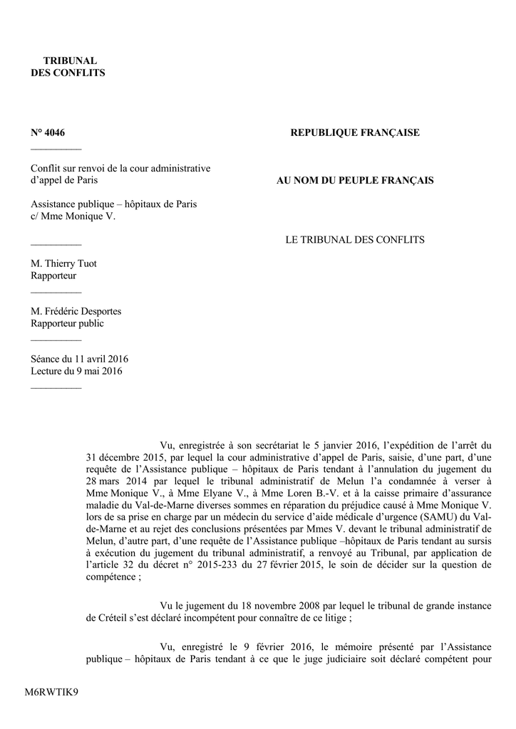 TRIBUNAL DES CONFLITS REPUBLIQUE FRANÇAISE N° 4046 __________ Conflit sur renvoi de la cour administrative d’appel de Paris AU NOM DU PEUPLE FRANÇAIS Assistance publique – hôpitaux de Paris c/ Mme Monique V. LE TRIBUNAL DES CONFLITS __________ M. Thierry Tuot Rapporteur __________ M. Frédéric Desportes Rapporteur public __________ Séance du 11 avril 2016 Lecture du 9 mai 2016 __________ Vu, enregistrée à son secrétariat le 5 janvier 2016, l’expédition de l’arrêt du 31 décembre 2015, par lequel la cour administrative d’appel de Paris, saisie, d’une part, d’une requête de l’Assistance publique – hôpitaux de Paris tendant à l’annulation du jugement du 28 mars 2014 par lequel le tribunal administratif de Melun l’a condamnée à verser à Mme Monique V., à Mme Elyane V., à Mme Loren B.-V. et à la caisse primaire d’assurance maladie du Val-de-Marne diverses sommes en réparation du préjudice causé à Mme Monique V. lors de sa prise en charge par un médecin du service d’aide médicale d’urgence (SAMU) du Valde-Marne et au rejet des conclusions présentées par Mmes V. devant le tribunal administratif de Melun, d’autre part, d’une requête de l’Assistance publique –hôpitaux de Paris tendant au sursis à exécution du jugement du tribunal administratif, a renvoyé au Tribunal, par application de l’article 32 du décret n° 2015-233 du 27 février 2015, le soin de décider sur la question de compétence ; Vu le jugement du 18 novembre 2008 par lequel le tribunal de grande instance de Créteil s’est déclaré incompétent pour connaître de ce litige ; Vu, enregistré le 9 février 2016, le mémoire présenté par l’Assistance publique – hôpitaux de Paris tendant à ce que le juge judiciaire soit déclaré compétent pour M6RWTIK9 N° 4046 -2connaître de ce litige par les motifs que les actes de soins et de diagnostic accomplis par les médecins libéraux dans le cadre de la permanence des soins relèvent de leur activité libérale habituelle et ne participent pas à une activité de service public, de sorte qu’ils sont de nature à engager leur responsabilité personnelle, et que le législateur a délibérément exclu ces actes du régime de la responsabilité administrative bénéficiant aux médecins régulateurs ; Vu, enregistrées le 11 février 2016, les observations du ministre des affaires sociales, de la santé et des droits des femmes qui, pour les mêmes motifs, tendent à ce que le juge judiciaire soit déclaré compétent pour connaître du litige ; Vu, enregistré le 24 mars 2016, le mémoire présenté pour Mme Monique V., Mme Loren V. et Mme Elyane V. par la SCP Hémery, Thomas-Raquin, tendant à ce que le juge administratif soit déclaré compétent pour connaître du litige, par les motifs que les médecins intervenant à la demande du SAMU au titre de la permanence de soins doivent être regardés comme des collaborateurs occasionnels du service public ; qu’aucune différence de situation ne justifie qu’ils ne soient pas considérés ainsi à l’instar des médecins dits régulateurs gérant les appels reçus par le SAMU ; qu’alors même que la loi du 21 juillet 2009 ne place pas leur responsabilité sous le contrôle du juge administratif, seul ce régime de responsabilité favoriserait la participation des médecins libéraux aux services d’urgence ; Vu les autres pièces du dossier ; Vu la loi des 16-24 août 1790 et le décret du 16 fructidor an III ; Vu la loi du 24 mai 1872 ; Vu le décret n° 2015-233 du 27 février 2015 ; Vu le code de la santé publique ; Vu le code de la sécurité sociale ; Vu le décret n° 87-1005 du 16 décembre 1987 ; Après avoir entendu en séance publique : - le rapport de M. Thierry Tuot, membre du Tribunal, - les observations de la SCP Didier, Pinet pour l’Assistance publique – hôpitaux de Paris, - les conclusions de M. Frédéric Desportes, rapporteur public ; N° 4046 -3- Considérant qu’en raison des séquelles d’une thrombose et d’un infarctus qu’elle estime dues aux insuffisances de sa prise en charge par le médecin de permanence que lui a adressé sur son appel le service d’aide médical d’urgence (SAMU) le 16 mars 2005, Mme Monique V., sa mère et sa fille ont recherché la responsabilité du médecin ayant assuré cette prise en charge devant le tribunal de grande instance de Créteil puis, après que ce dernier se fut déclaré incompétent, devant le tribunal administratif de Melun ; que, sur l’appel formé par l’Assistance publique-hôpitaux de Paris, la cour administrative d’appel de Paris a renvoyé au Tribunal, en application de l’article 32 du décret du 27 février 2015, le soin de décider sur la question de la compétence ; Considérant que les fautes commises par un praticien à l’occasion d’actes accomplis dans le cadre du service public engagent la responsabilité de ce service public ; qu’en revanche, il appartient au patient de rechercher devant le juge judiciaire la responsabilité d’un médecin à raison des actes médicaux accomplis à titre de praticien libéral ; Considérant que les dispositions de l’article L. 6112-5 du code de la santé publique alors en vigueur, aujourd’hui reprises à l’article L. 6311-2 du même code, organisent un service d’aide médical d’urgence dont les missions, alors fixées par le décret du 16 décembre 1987 et aujourd’hui décrites à l’article R. 6311-2, sont d’assurer un accueil téléphonique permanent des patients et de déterminer et déclencher, dans les meilleurs délais, la réponse médicale adéquate aux appels reçus ; que ce service public, dont le fonctionnement relève du juge administratif, dispose, à cette fin, le cas échéant, de la possibilité de recourir à l’intervention des médecins qui, en application des dispositions de l’article R. 733 du code de la santé publique, devenu R. 6315-4 du même code, se sont portés volontaire