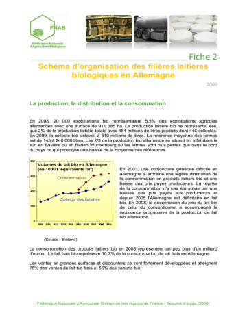 ____________________________________________________________________ Fiche 2 Schéma d'organisation des filières laitières biologiques en Allemagne 2009 La production, la distribution et la consommation En 2008, 20 000 exploitations bio représentaient 5,5% des exploitations agricoles allemandes avec une surface de 911 385 ha. La production laitière bio ne représente, elle, que 2% de la production laitière totale avec 484 millions de litres produits dont 446 collectés. En 2009, la collecte bio s'élevait à 510 millions de litres. La référence moyenne des fermes est de 145 à 240 000 litres. Les 2/3 de la production bio allemande se situent en effet dans le sud en Bavière ou en Baden Wurttemberg où les fermes sont plus petites que dans le nord du pays ce qui provoque une baisse de la moyenne des références. En 2003, une conjoncture générale difficile en Allemagne a entrainé une légère diminution de la consommation en produits laitiers bio et une baisse des prix payés producteurs. La reprise de la consommation n'a pas été suivie par une hausse des prix payés aux producteurs et depuis 2005 l'Allemagne est déficitaire en lait bio. En 2008, la déconnexion du prix du lait bio de celui du conventionnel a accompagné la croissance progressive de la production de lait bio allemande. (Source : Bioland) La consommation des produits laitiers bio en 2008 représentent un peu plus d'un milliard d'euros. Le lait frais bio représente 10,7% de la consommation de lait frais en Allemagne. Les ventes en grandes surfaces et discounters se sont fortement développées et atteignent 75% des ventes de lait bio frais et 56% des yaourts bio. Fédération Nationale d’Agriculture Biologique des régions de France - Résumé d’étude (2009) Schéma d'organisation des filières laitières biologiques en Allemagne ___________________________________________________________________ Fiche 2 Les acteurs En Allemagne, 9 associations de producteurs bio gèrent un cahier des charges spécifique associé à une marque. Bioland est l'une des plus anciennes associations bio et regroupent 50% de la production laitière bio. 44% du lait bio est produit selon les cahiers des charges Demeter ou Naturland et seulement 6% selon le cahier de charges européens. Bioland Les adhérents de Bioland sont les producteurs bio toutes productions confondues mais l'association entretient des liens étroits avec ses partenaires commerciaux transformateurs ou distributeurs bio. Parmi ceux-ci, 22 laiteries. En 2003, Bioland a créé un bureau de coordination des filières laitières bio allemandes avec pour missions : de coordonner un centre de rencontre et d'information pour les représentants du lait bio, d’apporter un soutien commercial aux groupes de producteurs dans les négociations des prix et contrats de livraisons, d’accompagner les producteurs dans la création de groupements de producteurs de lait bio, de réunir tous les représentants des groupes d'éleveurs laitiers bio régionaux, d’organiser les échanges entre toutes les associations bio sur la filière lait (Bioland, Demeter, Naturland, ...), de mettre en place un système d’échange d’information à travers l'Europe. Bioland apporte donc un soutien aux éleveurs laitiers bio pour s'organiser collectivement et leur fournit des informations de marché régulièrement. Bioland réalise notamment un observatoire mensuel des prix payés producteurs par laiterie. Les groupes d'éleveurs bio Il existe une cinquantaine de groupes d'éleveurs laitiers bio dont 14 sont formalisés soit en GIE (MEGwV) soit en groupe de livraison. Ces groupes rassemblent de 20 à 300 producteurs. Chaque groupe négocie avec une ou deux laiteries. Dans la majorité des coopératives collectant du lait bio, les producteurs bio sont organisés en groupes plus ou moins formels. L’une d’elle a, par exemple, un bureau des producteurs bio. Une tendance nouvelle est que certains producteurs bio choisissent de sortir de la coopérative et de former ou non un groupe de livraison en lien avec la coopérative de façon à récupérer un peu d’indépendance vis-à-vis de leur laiterie. Fédération Nationale d’Agriculture Biologique des régions de France - Résumé d’étude (2009) 2 Schéma d'organisation des filières laitières biologiques en Allemagne ___________________________________________________________________ Fiche 2 L’objectif des MEGwV est d’adapter la production et la vente du lait venant des exploitations membres aux besoins/exigences du marché. Pour cela il assume les fonctions suivantes : un suivi sur la qualité du lait, l’élaboration des règles communes concernant la commercialisation, la conclusion de contrats d’achat et de livraison du lait au nom des adhérents et la facturation du lait des adhérents à la laiterie de livraison. Le bureau a le pouvoir de signer et de résilier les contrats de lait. La liste des producteurs fournisseurs est annexée au contrat, elle peut être modifiée par consensus entre la laiterie et les groupements. Les bureaux des groupes de livraison ont un mandat plus restreint. Ils représentent les producteurs adhérents pour la négociation des prix mais ne peuvent pas signer de contrat au nom des producteurs. Les laiteries Quarante laiteries collectent la production laitière bio allemande. 15 d’entres elles représentent 80% du volume et collectent chacune plus de 10 millions de litre de lait bio. Parmi ces 15 principales laiteries, 10 sont des coopératives mixtes, 5 des laitiers privées dont 3 ne travaillent que le bio. 22 laiteries utilisent la marque Bioland, 7 la marque Demeter, 5 la marque Naturland. Exemple d'une réalisation coordonnée par Bioland Cette déclaration commune en janvier 2009 et la communication qui l'a accompagnée a eu un effet positif sur les consommateurs et a permis de faire pression sur la grande distribution pour limiter la baisse des prix du lait bio due aux importations. F
