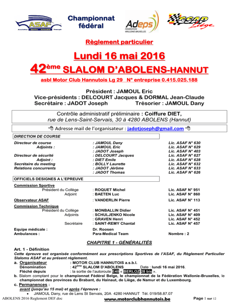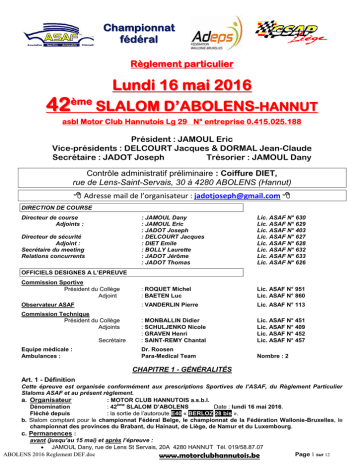 Ch am p i o n n at féd ér al R è g l e m e nt p a rt i c ul i e r Lund i 16 mai 2016 4 2 èm e S L A L O M D ’ A B O L E N S - H A N N U T asbl Motor Club Hannutois Lg 29 N° entreprise 0.415.025.188 Président : JAMOUL Eric Vice-présidents : DELCOURT Jacques & DORMAL Jean-Claude Secrétaire : JADOT Joseph Trésorier : JAMOUL Dany Contrôle administratif préliminaire : Coiffure DIET, rue de Lens-Saint-Servais, 30 à 4280 ABOLENS (Hannut) Adresse mail de l’organisateur : [email protected] DIRECTION DE COURSE Directeur de course Adjoints : : JAMOUL Dany : JAMOUL Eric : JADOT Joseph : DELCOURT Jacques : DIET Emile : BOLLY Laurette : JADOT Jérôme : JADOT Thomas Lic. ASAF N° 630 Lic. ASAF N° 629 Lic. ASAF N° 403 Lic. ASAF N° 627 Lic. ASAF N° 628 Lic. ASAF N° 632 Lic. ASAF N° 633 Lic. ASAF N° 626 Commission Sportive Président du Collège Adjoint : ROQUET Michel : BAETEN Luc Lic. ASAF N° 951 Lic. ASAF N° 860 Observateur ASAF : VANDERLIN Pierre Lic. ASAF N° 113 : MONBALLIN Didier : SCHULJENKO Nicole : GRAVEN Henri : SAINT-REMY Chantal Lic. ASAF N° 451 Lic. ASAF N° 409 Lic. ASAF N° 452 Lic. ASAF N° 457 Dr. Roosen Para-Medical Team Nombre : 2 Directeur de sécurité Adjoint : Secrétaire du meeting Relations concurrents OFFICIELS DESIGNES A L’EPREUVE Commission Technique Président du Collège Adjoints Secrétaire Equipe médicale : Ambulances : CHAPITRE 1 - GÉNÉRALITÉS Art. 1 - Définition Cette épreuve est organisée conformément aux prescriptions Sportives de l’ASAF, du Règlement Particulier Slaloms ASAF et au présent règlement. a. Organisateur : MOTOR CLUB HANNUTOIS a.s.b.l. ème Dénomination : 42 SLALOM D’ABOLENS Date : lundi 16 mai 2016. Fléché depuis : la sortie de l’autoroute E40 « BERLOZ 28 bis ». b. Slalom comptant pour le championnat Fédéral Belge, le championnat de la Fédération Wallonie-Bruxelles, le championnat des provinces du Brabant, du Hainaut, de Liège, de Namur et du Luxembourg. c. Permanences : avant (jusqu’au 15 mai) et après l’épreuve : JAMOUL Dany, rue de Lens St Servais, 20A 4280 HANNUT Tél. 019/58.87.07 ABOLENS 2016 Reglement DEF.doc Page 1 sur 12 www.motorclubhannutois.be JADOT Joseph, rue Neuve, 135, 4860 – PEPINSTER 087/703.721 – 0471/205.702 Email : [email protected] Site : www.motorclubhannutois.be pendant l’épreuve : Coiffure Diet, rue de Lens-Saint-Servais, 30 à Hannut - ABOLENS 0471/205.702 (J. Jadot) d. Timing – 5 avril 2016 : parution du règlement, début des inscriptions 13 mai 2016 : fin des inscriptions à droit simple Le lundi 16 mai 2016 (lundi de Pentecôte) 08 h 30: début des vérifications administratives, 08 h 45: début des vérifications techniques 09 h 00: début de la reconnaissance pédestre 10 h 30: fin des inscriptions 10 h 35: fin des vérifications administratives 10 h 45: fin des vérifications techniques 11 h 15: affichage de la liste des voitures, pilotes et passagers qualifiés 11 h 30: fin de la reconnaissance pédestre et briefing 12 h 00: PREMIER DEPART Art. 2 - Modalité d’inscription des voitures et des pilotes a. PILOTES ADMIS: tous les pilotes majeurs, détenteurs d’une licence « concurrent » ASAF ou VAS d’un niveau suffisant et d’un permis de conduire (minimum catégorie B) valable en Belgique. Pour tous les concurrents, le retour au parc se fera OBLIGATOIREMENT par une voirie à usage privatif (fermée à la circulation normale). Catégorie PROMO : Cette catégorie est réservée aux pilotes de la division 1 (classes 1 à 3), n’ayant jamais été classés dans un championnat (slalom ou autre). Division 5 – "ACCESS" Les participants à cette Division ne seront pas chronométrés et leur classement sera établi sur base des seules pénalités encourues (Voir Art. 3.1 et 3.2, du RP Slalom). Ce classement sera édité séparément de celui des autres Divisions (les participants devront, toutefois, être repris sur la liste officielle des qualifiés, comme tous les autres participants). Admission des voitures Cette Division est accessible à toutes les voitures en règle d’immatriculation (Attention : plaques « Z. » interdites), comportant au moins deux places et strictement conformes à leur P.V.A. (voitures de Show-Room, non pourvues d’attributs de compétition). Les véhicules « Tout Terrain » ne sont, toutefois, pas admis. Aucune autre condition de participation n’est imposée aux voitures, si ce n’est le respect des règles générales édictées au point 2.2.1 et 2.2.6, du RP Slalom. Dans cette Division, il n’y aura pas de répartition par classes de cylindrée (parcours non chronométré). Le départage entre les éventuels ex aequo sera opéré sur base des dimensions de la voiture (Voir Art. 2.2.6.4 du RP Slalom) PASSAGERS ADMIS:. Ils devront être en possession, au minimum, d'une licence "C" ou "1J-C" L'âge minimum est de 18 ans. Ce point sera de stricte application, même en cas de filiation entre le passager et le conducteur. Le pilote accueillant un « passager » devra obligatoirement avoir, d'une part, atteint l'âge de 21 ans et, d'autre part, avoir été classé dans un championnat « pilote » antérieur à 2016. Un pilote ne pourra accueillir qu’un seul et même passager durant toute l’épreuve et un passager ne pourra participer qu’avec un seul pilote. (Décision de la C.S.A.P. Liège en date du 7 mars 2016.) b. VOITURES ADMISES : voir art. 2 du règlement particulier SLALOM ASAF. c. NUMEROS : une liste des numéros attribués pour l’année est disponible sur le site de l’A.S.A.F Art. 3 - Participation a. La demande d’engagement et la fiche de vérifications techniques dûment complétées devront parvenir au secrétariat de l’épreuve pour le 13 mai 2016 + MAIL à [email protected] (un accusé de réception suivra) + ou COURRIER à BOLLY Laurette, rue Neuve, 135, 4860 – PEPINSTER Il sera possible de s’inscrire le jour de l’épreuve au plus tard à 10h30 et moyennant un supplément de 10 € (règl