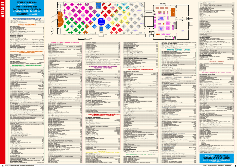 Espace International C Mini-conférence avec des témoignages d'étudiants C C C C à 9h45 et à 15h30 - Durée 30 mn Espace OTLV : samedi 23 C C C C FPT E pa e e Té ég amme E pa e B e Mé opo e Qu mpe Communau é Espace Dé en e B B A4 A6 A3 A7 A1 A2 A5 en o en a on E pa e UBO en o en a on n o n a on n o n a on en o en a on e n e na ona AREP 29 C C Ponan B e C23 A o a on a Tou ne B e 4 onge B e agne X2 G e a B e agne O den a e B e Mo a Qu mpe X1 Su ep o ma on on nue UBO B e X3 CDG29 e B e Mé opo e on on pub que E pa e on on Pub que Point info conseil E pa e O en a on ou au ong de a e E pa e OT V d pon b e u e e pa e e ng de a o ma on on nue p é en e u e a on ENVIRONNEMENT - AGRONOMIE - BIOLOGIE LES FORMAT ONS LES D PLÔMES Ag ad e B8 Ba he o Coo d na eu en En onnemen B3 BTS Ag onom e e P odu on égé a e B6 B13 BTS Aménagemen pa age B1 B6 B8 B20 BTS Ana e ondu e de ème d e p o a on B1 B6 B8 B17 B19 BTS Ana e Ag B o e B o e hno ANAB OTEC B4 B6 BTS Aqua u u e B6 BTS B o ana e e on ô e B11 BTS Dé e oppemen e An ma on de Te o e Ru au B6 BTS Ge on e Ma e de Eau B6 BTS Gén e de équ pemen ag o e B12 B17 BTS Ge on e p o e on de a na u e B6 B8 B19 BTS Ge on o e è e B17 B18 BTS Ma n enan e de ème de p odu on B16 BTS Mé e de eau B5 BTS Mé e de e e à en onnemen B11 BTS P odu on An ma e B6 B8 B13 B18 BTS P odu on Ho o e B17 B20 B21 BTS P odu on Végé a e B8 BTS S en e e e hno og e de a men B1 B6 B16 B19 BTS Te hn o omme a B8 B17 B20 BTS Te hn o om “ag o ou n u e ” B6 C14 BTS Te hn o om “an mau é e age e ompagn e” B6 BTS Te hn o om “ a d n égé au o nemen ” B6 B8 BTS Te hn o om “p odu a men a e e bo on ” B6 B8 B16 C14 BTS Te hn o om “ n e p ueu ” B6 C14 Ce a de Spé a a on Condu e e En e en B17 Ce a de Spé a a on Con u on pa agè e B17 Ce a de Spé a a on T a eu e Ma h ne Ag o e B17 C a e P épa Te hno B o au é o e d ngén eu e é o e é é na e B6 DEES Con e e Dé e oppemen en ag u u e B13 D p ôme d ngén eu o e e de é o e d ngén eu B3 B8 B9 B14 B15 B16 DUT Gén e B o og que B2 B7 B10 en e p o og que de è e A men a e B16 C12 en e p o de nno a on de a P odu on e de a Sé u é A men a e B2 en e P o Managemen de O gan a on Ag o e B17 B18 en e P o Managemen de En ep e Ag o e B8 B19 en e P o Managemen de a P odu on B10 B16 en e P o Mé e de a San é nu on a men a on a men an é B10 en e P o P odu on an ma e Va o a on de P odu Aqua que B10 en e P o P odu a e B2 en e P o P o e on de u u e e Dé e oppemen Du ab e B10 en e P o Sé u é a men a e nu on e ana e C13 MD e en e P o B1 B2 B3 B7 B8 B9 B10 B15 B16 G9 Ma e pé a é en é onom e u a e B3 Ma e p o e onne pé a é nno a on en ndu e a men a e B9 Te hn en Supé eu P o e onne en Géo og e e En onnemen B14 LES ÉCOLES LES ÉTABL SSEMENTS E o e de Mé e de En onnemen B u B3 E o e d Ho u u e du Pa age e du Comme e de S an angueu B20 E o e du N o opé e B18 n gn m n Ag o Pub d B gn g oup m n d b m n B gn B6 *C A de Ke e Han e *C A du Mené Me d gna * ée de au ne Cau ne * ée Ke n en Gu ngamp * ée de Au ne Châ eau n * ée de B éhou ou oue nan * ée de Su n o Mo a * ée e G o Chêne Pon * ée P o e onne Ag o e Sa n Aub n du Co m e * ée Théodo e Monod e Rheu Renne G oupe An o ne de Sa n E upé Renne B1 UT B e UBO B7 UT Sa n B eu B2 UT Qu mpe UBO B10 ée de Ke be ne P ome n B21 ée ean Ma é ane e B11 ée SSAT Pa de V a ne Sa n a u e P n Redon B4 ée a Tou he P oë me B13 ée No e Dame Gu ngamp B5 ée Pomme Pomme aud B19 ée Sa n C a B a n De a B12 REO e M R de B e agne eg oupemen d é ab emen B e agne B17 * éo de e ne en M R e ne en *M R oudéa *M R P abenne *M R Rumengo e aou U R S en e e Te hn que UBO G9 Le éco e d ngén eu Ag o ampu Oue Renne B15 E o e d ngén eu a a e Beau a B14 E o e Sup d ngén eu en Ag oa men a e ES AB B e P ou ané B9 E o e Supé eu e d Ag u u e ESA Ange B8 n u d o ma on g ona d ndu a m na R A B agn Qu mp B16 Le p o e onne p é en Chamb e d Ag u u e du n è e APEC TA E pa e Ag Ag o azimut - LE TÉLÉGRAMME - mercredi 13 janvier 2016 C C B X B B B F F G G K K Aé o nau que G G H H B B H H A B A A Accue Espace Méd ca Pa améd ca K K K A K K K K K K H Espace Soc a Spo An ma on Cons uc on H H K K K H B K K H A Ba K K G G O en a on G G F Do es G Espace UBO G X Conse en ndus G G A B B X C E A B B O E C B Ag o Ag B E C B E E E C C E K K K K R H A K K K A8 4 ORIENTATION ADULTE - VALIDATION DES ACQUIS FORMATION CONTINUE 4 B E C C C E E C C G G E D D a e C C B SERVICES AUX ÉTUDIANTS Aides aux étudiants CA du n è e – a de au ogemen C OUS UBO B e ogemen bou e n o ma on eune e en Pa de B e B MDE Mu ue e é ud an e Ma on de Eu ope GU DEUROPE de B e e de B e agne Oue O e Pub de a angue B e onne Ca ha SMEBA Mu ue e é ud an e nformation Orientation A o a on C o Rouge an a e A o a on a Tou ne B e A o a on eune e En ep e A E 29 n o ma on u e e a on eune En ep e E pa e Con e Cap A en UBO e pa e n o ma on C O du n è e E pa e Con e Hand up B agn Po n n o ma on E ud Hand ap E pa Con On p B agn R ou do um n a u o n a on E pa Con O on éga é Sa n B eu a ompagnemen de é è e hand apé E pa e Con e Point Accueil et nformation E pa e n e na ona eud e Vend ed E pa Te C B D C C C C PARTENAIRES de lAssociation AZIMUT e Té ég amme B e a V e de B e e B e Mé opo e a V e de Qu mpe e Qu mpe Communau é C Numé que E E D C C C C B E D C Ba E R D D C C C E D C C Me E E D C C C C D D C M Jeudi 21 et vendredi 22 E ADMINISTRATION - COMMERCE - GESTION LES FORMATIONS - LES DIPLÔMES Attaché commercial......................................................................................................C6/C17 Bachelor...................................................................C5/C16/C26/C31/C32/C33/C34/C38/C42 Bachelor Banque Assurances............................................................................................. C42 Bachelor Business............................................................................................................... C26 Bachelor domaine Business, Commerce, Marketing, F