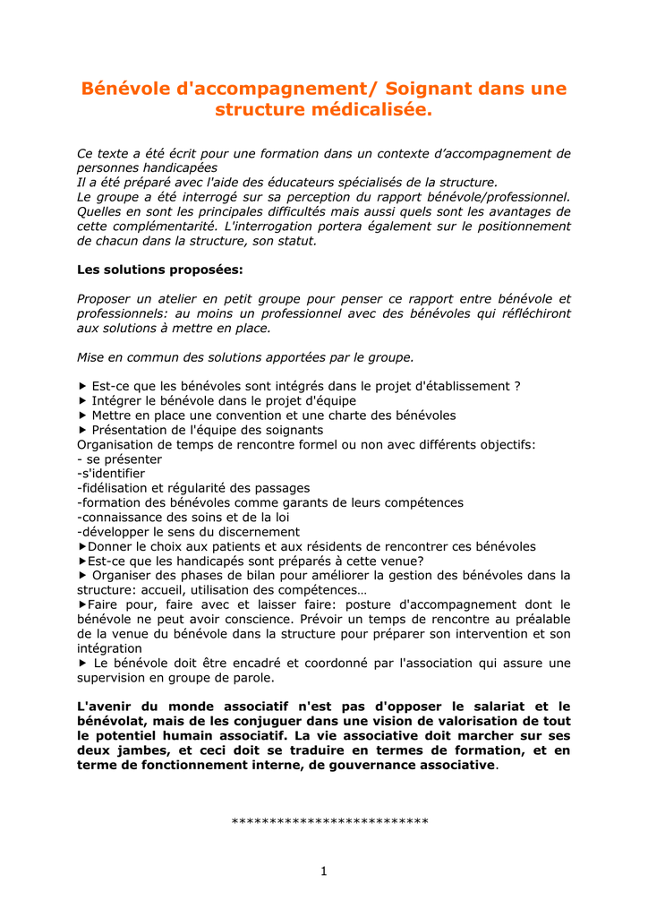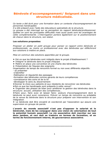 Bénévole d'accompagnement/ Soignant dans une structure médicalisée. Cet ext eaét éécr i tpourunef or mat i on dansun cont ext ed’ accompagnementde personnes handicapées Il a été préparé avec l'aide des éducateurs spécialisés de la structure. Le groupe a été interrogé sur sa perception du rapport bénévole/professionnel. Quelles en sont les principales difficultés mais aussi quels sont les avantages de cette complémentarité. L'interrogation portera également sur le positionnement de chacun dans la structure, son statut. Les solutions proposées: Proposer un atelier en petit groupe pour penser ce rapport entre bénévole et professionnels: au moins un professionnel avec des bénévoles qui réfléchiront aux solutions à mettre en place. Mise en commun des solutions apportées par le groupe. Est-ce que les bénévoles sont intégrés dans le projet d'établissement ? Intégrer le bénévole dans le projet d'équipe Mettre en place une convention et une charte des bénévoles Présentation de l'équipe des soignants Organisation de temps de rencontre formel ou non avec différents objectifs: - se présenter -s'identifier -fidélisation et régularité des passages -formation des bénévoles comme garants de leurs compétences -connaissance des soins et de la loi -développer le sens du discernement Donner le choix aux patients et aux résidents de rencontrer ces bénévoles Est-ce que les handicapés sont préparés à cette venue? Organiser des phases de bilan pour améliorer la gestion des bénévoles dans la structure: accueil, util i sat i ondescompét ences… Faire pour, faire avec et laisser faire: posture d'accompagnement dont le bénévole ne peut avoir conscience. Prévoir un temps de rencontre au préalable de la venue du bénévole dans la structure pour préparer son intervention et son intégration Le bénévole doit être encadré et coordonné par l'association qui assure une supervision en groupe de parole. L'avenir du monde associatif n'est pas d'opposer le salariat et le bénévolat, mais de les conjuguer dans une vision de valorisation de tout le potentiel humain associatif. La vie associative doit marcher sur ses deux jambes, et ceci doit se traduire en termes de formation, et en terme de fonctionnement interne, de gouvernance associative. ************************** 1 Qu'est-ce qu'un bénévole d'accompagnement? D'un point de vue sémantique, le terme de bénévolat vient de Bene "bien" et Volo " je veux. Le bénévole est un bienveillant. Aucunedéf i ni t i on( l égal eouconvent i onnel l e)n’ exi st eendr oi tf r ançai s.Le bénévolat est uneact i vi t él i br e,quin’ estencadr éeparaucunst at ut .Mai si l existe une définition, non juridique, communément admise : Est bénévole t out epersonnequis’ engagel i brementpourmeneruneact i on non sal ari éeen di rect i on d’ aut r ui ,en dehor sdeson t empsprofessionnel et familial (Avis du Conseil Economique et Social du 24 Février 1993). Ainsi le bénévole est par définition celui qui donne son temps pour le compte d'une association ou d'un organisme sans but lucratif, sans rien recevoir en retour d'autre que la simple gratification morale de la gratuité de son don. Or malgré cette définition non juridique du bénévolat, cette notion reste encore floue. L’ I NSEE di st i ngue t r adi t i onnel l ementl es «bénévoles réguliers » et « les bénévoles occasionnels ». Le CERPHI et France Bénévolat ont repris cette distinction : - Le "bénévole régulier" qui exercerait sans contrepartie une activité correspondant à une fonction bien définie et continue que ce soit dans le domaine de l'organisation générale ou que ce soit dans le développement d'une action de l'association. Ce bénévole consacrerait à l'association au moins deux heures par semaine en moyenne annuelle. - Le "bénévole occasionnel" qui donnerait du temps à l'association à laquelle il appartient, toujours sans contrepartie, sans forcément un rôle bien défini et sans atteindre le seuil des deux heures hebdomadaires. Cette distinction ne doit pas introduire de hiérarchie de valeurs entre les catégories de bénévoles. Il existe par ailleurs, en dehors du « bénévolat institué, le plus souvent au sein des associations, un « bénévolat informel », de solidarité de proximité direct. Ces définitions reste très abstraites si on s'en tient à ces quelques lignes. Qu'estce alors un bénévole, et un bénévole dans une structure comme la vôtre? On peut donner des pistes, de multiples caractéristiques pour un rôle unique. Ainsi le bénévole est: Quelqu'un qui écoute, assure une présence: une présence juste. Est disponible à l'autre, discret, accessible, empathique. Une personne, formée, qui agit dans la gratuité et le don avec humanité. Représentant de la société civile il amène avec lui le monde extérieur et peut être un lien social évitant ainsi l'isolement. Il intervient de façon complémentaire au soignant, il est sans blouse Un relais: ni ami, ni soignant, ni famille, une oreille extérieure, une oreille sur un tabouret Apporter un regard extérieur à la structure et changer le regard de l'éducateur Quelqu'un qui accompagne le résidents dans sa vie sociale: il ne recouvre pas les mêmes objectifs que le professionnel qui se situe dans le domaine du pédagogi que,del asant é… 2 Le bénévolat est en somme une facette d'un prisme: grâce au regard de tous, à toutes les facettes, le résidents peut être mieux compris, appréhender dans toutes ses facettes. Ainsi, si le cadre du bénévolat, son statut juridique, peut se préciser, il semble que l'implication d'un bénévole dans une association, son engagement reste à lui à définir. Définition qui n'est sans doute pas unique et qui est modulable en fonction des structures. Cette réflexion doit donc être menée dans l'association avec tous les partenaires qui la font vivre. Y-a-t-il des freins à l'inté