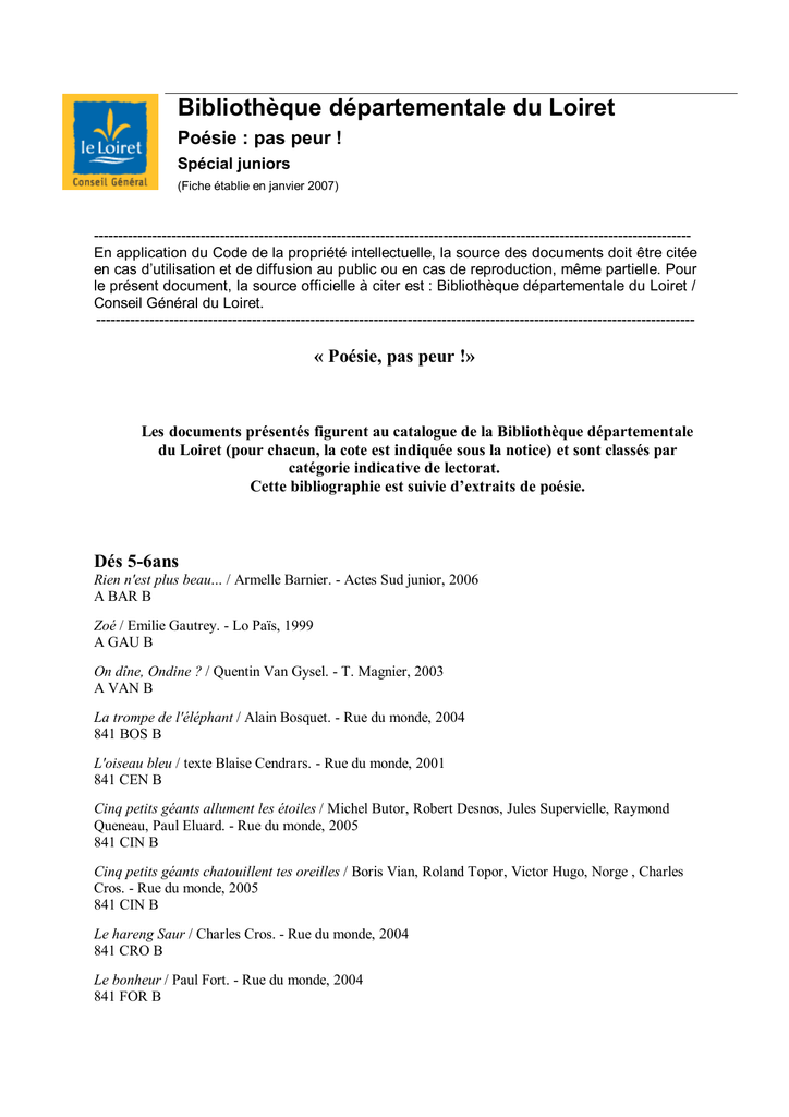 Bibliothèque départementale du Loiret Poésie : pas peur ! Spécial juniors (Fiche établie en janvier 2007) --------------------------------------------------------------------------------------------------------------------------En application du Code de la propriété intellectuelle, la source des documents doit être citée en cas d’utilisation et de diffusion au public ou en cas de reproduction, même partielle. Pour le présent document, la source officielle à citer est : Bibliothèque départementale du Loiret / Conseil Général du Loiret. --------------------------------------------------------------------------------------------------------------------------- « Poésie, pas peur !» Les documents présentés figurent au catalogue de la Bibliothèque départementale du Loiret (pour chacun, la cote est indiquée sous la notice) et sont classés par catégorie indicative de lectorat. Cette bibliographie est suivie d’extraits de poésie. Dés 5-6ans Rien n'est plus beau... / Armelle Barnier. - Actes Sud junior, 2006 A BAR B Zoé / Emilie Gautrey. - Lo Païs, 1999 A GAU B On dîne, Ondine ? / Quentin Van Gysel. - T. Magnier, 2003 A VAN B La trompe de l'éléphant / Alain Bosquet. - Rue du monde, 2004 841 BOS B L'oiseau bleu / texte Blaise Cendrars. - Rue du monde, 2001 841 CEN B Cinq petits géants allument les étoiles / Michel Butor, Robert Desnos, Jules Supervielle, Raymond Queneau, Paul Eluard. - Rue du monde, 2005 841 CIN B Cinq petits géants chatouillent tes oreilles / Boris Vian, Roland Topor, Victor Hugo, Norge , Charles Cros. - Rue du monde, 2005 841 CIN B Le hareng Saur / Charles Cros. - Rue du monde, 2004 841 CRO B Le bonheur / Paul Fort. - Rue du monde, 2004 841 FOR B Au Jardin des plantes / texte Victor Hugo. - Rue du monde, 2002 841 HUG B Le bateau, la Terre / Jacques Prévert. - Rue du monde, 2004 841 PRE B Le crocodile / texte Jacques Roubaud. - Rue du monde, 2001 841 ROU B L'enfant qu'on envoie se coucher / Claude Roy. - Rue du monde, 2004 841 ROY B Comptine / Jean Tardieu. - Rue du monde, 2004 841 TAR B Un poisson d'avril / texte Boris Vian. - Rue du monde, 2001 841 VIA B Dés 6-8 ans Mon premier Larousse des poésies / éd. Anne Bouin. - Larousse, 2005 808.81 MON J Air de fête / ill. Morgan. - Gautier-Languereau, 1998 841 AIR J En toutes circonstances / Albane Gellé. - le Dé bleu, 2001 : Ecrits des forges, 2001 841 GEL J Victor Hugo : 7 poèmes en délire / Sylvie Girardet. - Hatier, 2004 841 HUG J Ecrit sur la page / Georges Jean. - Gallimard-Jeunesse, 2003 841 JEA J Douze mois et toi / Yvon Le Men, Baudouin. - Milan jeunesse, 2005 841 LEM J Donne ta langue au chat / Jean-Luc Moreau. - Gautier-Languereau, 2005 841 MOR J Dos rond caméléon ! / Isabelle Phanal. - Grasset jeunesse, 2002 841 PHA J Des noms d'oiseaux ! / Pittau, Gervais. - Seuil Jeunesse, 2003 841 PIT J Premiers poèmes pour toute ma vie / poèmes choisis par Jean-Hugues Malineau. - Milan, 2003 841 PRE J Le chat et l'oiseau ; suivi de L'âne dormant ; suivi de Le gardien du phare aime trop les oiseaux / Jacques Prévert. - Gallimard-Jeunesse, 2000 841 PRE J Jacques Prévert : 9 poèmes en délire / Sylvie Girardet. - Hatier, 2003 841 PRE J M. Goodman rêve de chats / Jacques Roubaud. - Gallimard, 1994 841 ROU J Les animaux font leur cirque / Joël Sadeler. - Gallimard-Jeunesse, 2000 841 SAD J Ceci est un poème qui guérit les poissons / texte Jean-Pierre Siméon. - Rue du monde, 2005 841 SIM J Dés 8-10 ans J'écris des poésies : des poèmes à lire, des jeux pour en écrire / Rolande Causse. - Albin Michel Jeunesse, 2004 808.1 CAU V L'atelier de poésie / Pierre Coran. - Casterman, 1999 808.1 COR V 101 fables du monde entier / texte chois. et adapt. par Corinne Albaut. - Bayard Jeunesse, 2003 808.81 CEN V Enfances / ill. Pierre Mornet. - Gautier-Languereau, 2003 808.81 ENF V Jabberwocky / Lewis Carroll. - Disney Hachette, 1994 821 CAR V Si, tu seras un homme, mon fils / Rudyard Kipling. - Flammarion-Père Castor, 1998 821 KIP V Jacques Prévert / Karine Delobbe. - PEMF, 2005 840.4 PRE V Album de poésies / ill. Nouchca. - Magnard jeunesse, 2005 841 ALB V Les animaux et leurs poètes / éd. Jean-Hugues Malineau. - Albin Michel-Jeunesse, 1998 841 ANI V Alphabêtes / Claude Ber. - Lo Païs, 1998 841 BER V L'inventaire des Pans Terre / Patrick Bertrand. - Lo Païs, 1998 841 BER V Silence, la queue du chat balance / Patrick Bertrand. - Actes Sud junior, 2002 841 BER V Le rire des cascades / Alain Boudet. - Motus, 2001 841 BOU V Les 25 chats de Maurice Carême / Maurice Carême. - Ecole des loisirs, 2001 841 CAR V Contre-recettes d'une sous-douée / Andrée Chédid. - Lo Païs, 1999 841 CHE V Dodoitzu et l'escargot alpiniste / Paul Claudel. - Gallimard Jeunesse, 2005 841 CLA V Mon chat, son chien et le cochon du voisin / Clod'Aria. - le Dé bleu , 1998 841 CLO V J'y suis, j'y rêve / Pierre Coran. - Rocher jeunesse, 2005 841 COR V Pour un peu : poèmes / François de Cornière. - le Dé bleu, 1999 841 COR V Giboulées de neige et d'oiseaux / Michel Cosem. - Lo Païs, 1997 841 COS V Petits bonheurs / Chantal Couliou. - le Dé bleu, 1999 841 COU V Mes pieds / texte Rémy Courgeon. - Lo Païs, 2000 841 COU V Petites émotions / Michelle Daufresne. - Lo Païs, 2000 841 DAU V Petits poèmes de l'amour / François David. - Lo Païs, 1999 841 DAV V Pommes de pin / François David. - Rocher jeunesse, 2005 841 DAV V La ménagerie de Tristan ; suivi de Le parterre d'Hyacinthe / Robert Desnos. - Gallimard-Jeunesse, 2000 841 DES V Un dimanche à la campagne / Lydia Devos. - Lo Païs, 1999 841 DEV V Le fabuleux fablier : anthologie de fables de tous les temps pour mieux vivre ensemble / Jean-Marie Henry. - Rue du monde, 2001 841 FAB V Les villages / Pierre Gabriel. - Grandir, 1995 841 GAB V Pense-bêtes / Guillevic. - Lo Païs, 1995 841 GUI V Parole de clown / Jacqueline et Claude Held. - Lo Païs, 1998 841 HEL V Petites poésies pour jours de pluie et de soleil / Edmond Jabès. - Gallimard-Jeunesse, 200