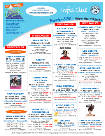 LE COMTE DE BOUDERBALA 10 Mars 2016 - 20h30 Casino Barrière - Toulouse (31) SANS FILTRE 02 Mars 2016 - 20h30 Casino Barrière - Toulouse (31) Carré Or : Prix Unique : 36 € Cat 1 : Prix Unique : 33 € Cat 2 : Prix Unique : 28 € (Places numérotées) Date limite de réserv. : 25/02/2016 KEEN’V 03 Mars 2016 - 20h Le Bikini - Toulouse (31) Prix Public : 33 € - Prix Club : 31 € (Placement libre) LES BODIN’S Le Bascala - Bruguières (31) Prix Public : 29 € - Prix Club : 25 € (Places numérotées) Date limite de réserv. : 12/02/2016 TONY CARREIRA 01 Mars 2016 - 20h30 Casino Barrière - Toulouse (31) Cat 1 : Prix Unique : 59.40 € Cat 2 : Prix Unique : 52.40 € Cat 3 : Prix Unique : 43.40 € LE PETIT DRAGON 11 Mars 2016 - 20h Zénith - Toulouse (31) …………..………………….. Prestige : Prix Unique : 82 € Carré Or : complet Cat 1 : Px Public : 57 € - Px Club : 52 € Cat 2 : Px Public : 49 € - Px Club : 46 € Cat 1 : Px Public : 43 € - Px Club : 39 € Cat 2 : Px Public : 38 € - Px Club : 35 € (Places numérotées) Date limite de réserv. : 02/03/2016 Cat 1 : Prix Unique : 50 € 04 et 05 Mars 2016 - 20h30 Zénith - Toulouse (31) 27 Février 2016 - 15h30 27 Février 2016 - 20h30 …………..………………….. Cat 2 : Px Public : 45 € - Px Club : 42 € La Tournée TAP FACTORY Zénith - Toulouse (31) Date limite de réserv. : 18/02/2016 DANSE AVEC LES STARS …………..………………….. (Placement libre) Date limite de réserv. : 26/02/2016 16 Mars 2016 - 20h 26 Février 2016 - 14h (Places numérotées) (Places numérotées) Fosse Or : Prix Unique : 105€ Fosse : Prix Unique : 42 € (Places numérotées) …………..………………….. Date limite de réserv. : 12/02/2016 Cat 1 : Prix Unique : 150 € Cat 2 : complet Cat 3 : complet …………..………………….. CHICA VAMPIRO Carré Or : Prix unique : 59.90 € Cat 1 : Prix unique : 49.90 € Cat 2 : Prix unique : 44.90 € Cat 3 : Prix unique : complet 12 Mars 2016 - 20h Zénith - Toulouse (31) Carré Or : complet Cat 1 : complet Cat 2 : Prix Unique : 35 € Date limite de réserv. : 17/02/2016 Zénith - Toulouse (31) JOHNNY HALLYDAY Cat 3 : Prix Unique : 38 € Enf. (-12 ans) : Prix Unique : 35 € (Places numérotées) Date limite de réserv. : 26/02/2016 …………..………………….. ISSA DOUMBIA 1 ère Consultation 11 et 12 Mars 2016 - 21h30 …………..………………….. STEPHAN EICHER 16 Mars 2016 - 20h30 Théâtre J. Alary - Carcassonne (11) Cat 1 : complet Cat 2 : Prix Unique : 33 € Cat 3 : complet (Places numérotées) Manifestation accessible en E-Ticket Date limite de réserv. : 02/03/2016 …………..………………….. VIRGINIE HOCQ 16 Mars 2016 - 20h30 La Comédie - Toulouse (31) Casino Barrière - Toulouse (31) Prix Unique : 32 € Enf. (-12 ans) : Prix Unique : 32 € Manifestation accessible en E-Ticket (Places numérotées) Date limite de réserv. : 26/02/2016 Carré Or : Prix Unique : 36.40 € Cat 1 : P.P : 33.40 € - Px Club : 30.40 € Cat 2 : Prix Unique : 28.40 € Date limite de réserv. : 20/02/2016 …………..………………….. Date limite de réserv. : 02/03/2016 …………..………………….. AC/DC TRIBUTE IRISH CELTIC GENERATIONS Le Bascala - Bruguières (31) Cat 3 : Prix Unique : 44 € Manifestation accessible en E-Ticket (Placement libre) (Places numérotées) 12 Mars 2016 - 21h Prix Public : 10 € - Prix Club : 8 € (Places numérotées) 05 Mars 2016 - 15h ou 20h30 Date limite de réserv. : 26/02/2016 06 Mars 2016 - 14h30 ou 17h30 …………..………………….. …………..………………….. Casino Barrière - Toulouse (31) Carré Or : Prix Unique : 50 €* *complet le 05/03/2016 Cat 1 : Px Public : 47 € - Px Club : 44 € Cat 2 : Px Public : 44 € - Px Club : 41 € (Places numérotées) (Places numérotées) Date limite de réserv. : 15/02/2016 Date limite de réserv. : 20/02/2016 DELUXE CHRIS ESQUERRE 12 Mars 2016 - 20h 17 et 18 Mars 2016 - 21h30 Prix Unique : 26 € Px Public : 27 € - Px Club : 21.80 € Le Bikini - Toulouse (31) (Placement libre) Date limite de réserv. : 26/02/2016 La Comédie - Toulouse (31) (Placement libre) Date limite de réserv. : 03/03/2016 TOP 50 PARTEZ EN LIVE 20 Mars 2016 - 18h Zénith - Toulouse (31) LES CHŒURS DE L’ARMÉE RUSSE Carré Or : Prix Unique : 56 € Cat 1 : Prix Unique : 46 € Cat 2 : Px Public : 41 € - Px Club : 35 € (Places numérotées) Date limite de réserv. : 04/03/2016 17 Mars 2016 - 20h30 Casino Barrière - Toulouse (31) Carré Or : complet Cat 1 : Prix Unique : 40 € Cat 2 : Prix Unique : 35 € (Places numérotées) LE LAC DES CYGNES Zénith - Toulouse (31) 19 Mars 2016 - 16h ou 20h30 Zénith - Toulouse (31) Cat 2 : Prix Unique : 35 € Manifestation accessible en E-Ticket 18 Mars 2016 - 20h …………..………………….. NEKFEU AXELLE LAFFONT Date limite de réserv. : 04/03/2016 DOMINIQUE A …………..………………….. 22 Mars 2016 - 20h (Places numérotées) …………..………………….. (Placement libre) …………..………………….. …………..………………….. Date limite de réserv. : 11/03/2016 Date limite de réserv. : 11/03/2016 Enf. (-13 ans) : Prix Unique : 25 € Carré Or : Prix Unique : 62 € Cat 1 : Prix Unique : 49 € Cat 2 : Prix Unique : 39 € Date limite de réserv. : 03/03/2016 (Placement libre) Manifestation accessible en E-Ticket Prix Public : 32 € - Prix Club : 27 € Carré Or : complet Cat 1 : complet Cat 2 : Prix Unique : 39 € (Places numérotées) Cat 1 : Prix Unique : 32 € Hall de Paris - Moissac (82) Casino Barrière - Toulouse (31) Date limite de réserv. : 04/03/2016 26 mars 2016 - 20h Salle Alizé - Muret (31) 26 Mars 2016 - 21h 19 Mars 2016 - 20h30 GRUPO COMPAY SEGUNDO ARTHUR H Cat 1 : Prix Unique : 40 € (Placement libre assis) (Placement libre debout) Date limite de réserv. : 08/03/2016 …………..………………….. W
