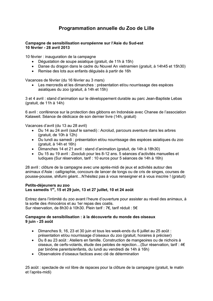 Programmation annuelle du Zoo de Lille Campagne de sensibilisation européenne sur l’Asie du Sud-est 10 février - 28 avril 2013 10 février : inauguration de la campagne Dégustation de soupe asiatique (gratuit, de 11h à 15h) Danse du dragon dans le cadre du Nouvel An vietnamien (gratuit, à 14h45 et 15h30) Remise des lots aux enfants déguisés à partir de 16h Vacances de février (du 16 février au 3 mars) Les mercredis et les dimanches : présentation et/ou nourrissage des espèces asiatiques du zoo (gratuit, à 14h et 15h) 3 et 4 avril : stand d’animation sur le développement durable au parc Jean-Baptiste Lebas (gratuit, de 11h à 14h) 6 avril : conférence sur la protection des gibbons en Indonésie avec Chanee de l’association Kalaweit. Séance de dédicace de son dernier livre (14h, gratuit) Vacances d’avril (du 13 au 28 avril) Du 14 au 24 avril (sauf le samedi) : Acrolud, parcours aventure dans les arbres (gratuit, de 10h à 12h) Du lundi au samedi : présentation et/ou nourrissage des espèces asiatiques du zoo (gratuit, à 14h et 16h) Dimanches 14 et 21 avril : stand d’animation (gratuit, de 14h à 18h30) Du 15 au 19 avril : Zooclub pour les 8-12 ans. 5 séances d’activités manuelles et ludiques (Sur réservation, tarif : 10 euros pour 5 séances de 14h à 16h) 28 avril : clôture de la campagne avec une après-midi de jeux et activités autour des animaux d’Asie : calligraphie, concours de lancer de tongs ou de cris de singes, courses de pousse-pousse, shifumi géant…N’hésitez pas à vous renseigner et à vous inscrire ! (gratuit) Petits-déjeuners au zoo Les samedis 1er, 15 et 29 juin, 13 et 27 juillet, 10 et 24 août Entrez dans l’intimité du zoo avant l’heure d’ouverture pour assister au réveil des animaux, à la sortie des rhinocéros et au 1er repas des coatis. Sur réservation, de 8h30 à 10h30. Plein tarif : 7€, tarif réduit : 5€ Campagne de sensibilisation : à la découverte du monde des oiseaux 9 juin - 25 août Dimanches 9, 16, 23 et 30 juin et tous les week-ends du 6 juillet au 25 août : présentation et/ou nourrissage d’oiseaux du zoo (gratuit, horaires à préciser) Du 8 au 23 août : Ateliers en famille. Construction de mangeoires ou de nichoirs à oiseaux, de cerfs-volants, étude des pelotes de rejection…(Sur réservation, tarif : 4€ par binôme parents/enfants, du lundi au vendredi de 14h à 16h) Observatoire d’oiseaux factices avec clé de détermination 25 août : spectacle de vol libre de rapaces pour la clôture de la campagne (gratuit, le matin et l’après-midi)