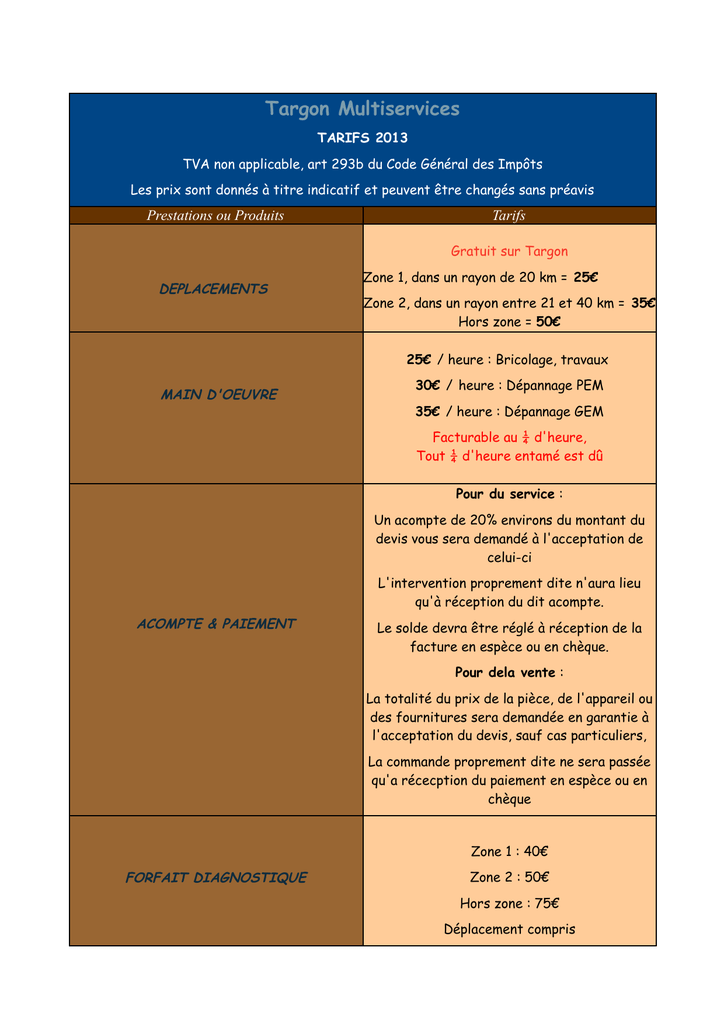 Targon Multiservices TARIFS 2013 TVA non applicable, art 293b du Code Général des Impôts Les prix sont donnés à titre indicatif et peuvent être changés sans préavis Prestations ou Produits Tarifs Gratuit sur Targon DEPLACEMENTS Zone 1, dans un rayon de 20 km = 25€ Zone 2, dans un rayon entre 21 et 40 km = 35€ Hors zone = 50€ 25€ / heure : Bricolage, travaux MAIN D'OEUVRE 30€ / heure : Dépannage PEM 35€ / heure : Dépannage GEM Facturable au ¼ d'heure, Tout ¼ d'heure entamé est dû Pour du service : Un acompte de 20% environs du montant du devis vous sera demandé à l'acceptation de celui-ci L'intervention proprement dite n'aura lieu qu'à réception du dit acompte. ACOMPTE & PAIEMENT Le solde devra être réglé à réception de la facture en espèce ou en chèque. Pour dela vente : La totalité du prix de la pièce, de l'appareil ou des fournitures sera demandée en garantie à l'acceptation du devis, sauf cas particuliers, La commande proprement dite ne sera passée qu'a récecption du paiement en espèce ou en chèque Zone 1 : 40€ FORFAIT DIAGNOSTIQUE Zone 2 : 50€ Hors zone : 75€ Déplacement compris Forfait déplacement + ½ heure de main d’œuvre comprise DEPANNAGE GROS ELECTROMENAGER A DOMICLE DEPANNAGE PETIT ELECTROMENAGER A DOMICLE Dans un rayon de 20 km = 40€ Dans un rayon entre 21 et 40 km =50€ Main d'œuvre horaire 35€ Facturable au ¼ d'heure, Tout ¼ d'heure entamé est dû Forfait déplacement + ½ heure de main d’œuvre comprise Dans un rayon de 20 km = 37€ Dans un rayon entre 21 et 40 km = 47€ Main d'œuvre horaire 30€ Facturable au ¼ d'heure, Tout ¼ d'heure entamé est dû Forfait prise en charge = 7€ DEPANNAGE GROS ELECTROMENAGER EN ATELIER DEPANNAGE PETIT ELECTROMENAGER EN ATELIER Main d’œuvre horaire = 35€ Facturable au ¼ d'heure, Tout ¼ d'heure entamé est dû Forfait prise en charge = 7€ Main d’œuvre horaire = 30€ Facturable au ¼ d'heure, Tout ¼ d'heure entamé est dû PETITE FOURNITURE FORFAIT POSE/ RACCORDEMENT/MISE EN SERVICE ELECTROMENAGER LIVRAISON / COURSE Forfait = 15€ 35€ main d’œuvre et déplacement compris, zone 1 45€ main d’œuvre et déplacement compris, zone 2 Toutes distances* = 30€ (*Dans la limite du raisonnable) VENTE Sur commande uniquement Electroménager Pièces détachées Accessoires Consommables ... Catégorie 1 = 30€ la pièce (Meuble bas, table basse, étagère, etc...) MONTAGE & POSE DE MEUBLES EN KIT Catégorie 2 = 45€ la pièce (Meuble Haut, armoire, buffet etc...) Déplacement en sus Forfait ½ journée montage et pose meuble, déplacement compris = 130€ Forfait journée montage et pose meuble, déplacement compris = 240€