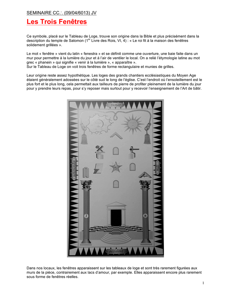 SEMINAIRE CC∴ (09/04/6013) JV Les Trois Fenêtres Ce symbole, placé sur le Tableau de Loge, trouve son origine dans la Bible et plus précisément dans la er description du temple de Salomon (1 Livre des Rois, VI, 4) : « Le roi fit à la maison des fenêtres solidement grillées ». Le mot « fenêtre » vient du latin « fenestra » et se définit comme une ouverture, une baie faite dans un mur pour permettre à la lumière du jour et à l’air de ventiler le local. On a relié l’étymologie latine au mot grec « phanein » qui signifie « venir à la lumière », « apparaître ». Sur le Tableau de Loge on voit trois fenêtres de forme rectangulaire et munies de grilles. Leur origine reste assez hypothétique. Les loges des grands chantiers ecclésiastiques du Moyen Age étaient généralement adossées sur le côté sud le long de l’église. C’est l’endroit où l’ensoleillement est le plus fort et le plus long, cela permettait aux tailleurs de pierre de profiter pleinement de la lumière du jour pour y prendre leurs repas, pour s’y reposer mais surtout pour y recevoir l’enseignement de l’Art de bâtir. Dans nos locaux, les fenêtres apparaissent sur les tableaux de loge et sont très rarement figurées aux murs de la pièce, contrairement aux lacs d’amour, par exemple. Elles apparaissent encore plus rarement sous forme de fenêtres réelles. 1 Ces trois fenêtres sont ainsi disposées : · La première à l'Orient, · La deuxième au Midi, · La troisième à l'Occident. Aucune fenêtre ne figure au Nord. Le Nord est l’endroit de la Colonne des Apprentis, elle reçoit la lumière non pas de manière directe mais uniquement par reflet. A ce titre le Nord est semblable à la Lune : celle-ci est privée de lumière propre et ne reçoit qu’un reflet du soleil placé à l’orient. Les tableaux de loge font figurer ces fenêtres à l’ Orient, au Midi et à l’Occident, disposition qui était celles des ouvertures lumineuses des loges ou ateliers des maçons francs et oeuvriers travaillant sur le chantier des cathédrales, accolées à l’abri du regard des profanes contre le mur Sud, et donc privées de la lumière du Nord. D’ailleurs dans les régions froides, le côté Nord des églises souvent ne comporte que peu de fenêtres, voire pas du tout. Parlant des fenêtres des édifices religieux, un auteur catholique du XIIIè. siècle, Durand de Mende, a dit qu’elles représentent l’obstacle qui repousse le vent et la pluie, qui empêche l’entrée des non fidèles dans l’Eglise. Il a ajouté que les fenêtres livrent passage à la clarté du vrai soleil qui est Dieu pour la porter dans le cœur des fidèles. Pour cet auteur les grillages qui sont devant les fenêtres représentent les prophètes de l’Eglise, les Divines Ecritures. La forme même de ces fenêtres varie en fonction des représentations figurées sur le tableau de loge, souvent rectangulaires présentant trois divisions horizontales et trois barreaux verticaux ou d’autres combinaisons formant des carrés, des rectangles ou des losanges . Sur certains tableaux de loge, la partie supérieure est voûtée en berceau, plein cintre ou ogive. Un des premiers manuels d’instruction datant de 1730, le « Masonry Dissected de Prichard » ne donne aucune information quant à la taille ou à la configuration de la fenêtre. La fenêtre est souvent composée d’une base carrée surmontée d’un arc de cercle, représentant le passage du plan terrestre au plan céleste. En tant qu’ouverture sur l’air et la Lumière, la fenêtre symbolise la réceptivité. Si l’ouverture est ronde, la réceptivité est de même nature que celle de l’œil ou de la conscience. Si elle est rectangulaire, nous sommes en présence d’une réceptivité de l’ordre terrestre. La fenêtre carrée ou rectangulaire contient, dans l’iconographie du vitrail, des messages de nature humaine, alors que les fenêtres de forme circulaire véhicules des messages divins. On reconnait ici le symbolisme du 4 terrestre et celui du cercle ou de la voûte de nature céleste et extra-terrestre, c’est-à-dire divine , en liaison avec respectivement l’équerre et le compas. La Loge est toutefois en communication avec le monde extérieur grâce à ces 3 fenêtres, certaines sont vitrées, amoindrissant ainsi les bruits et rejoignant la notion de secret ou du moins de discrétion La fonction symbolique première de l'existence de ces trois fenêtres est la diffusion de la lumière à l'intérieur du Temple maçonnique selon la marche apparente du Soleil. Les fenêtres indiquent les 3 principales heures du temps maçonnique, celle où les ouvriers se mettent à l'ouvrage, celle où ils l'accomplissent, et celle où ils le quittent. La Fenêtre à l'Orient Elle éclaire le Vénérable Maître. De même que le soleil se lève à l'Orient pour ouvrir "la carrière du jour", de même le V∴M∴ va donner naissance à une nouvelle journée de travail des F∴ en Loge; il crée ainsi une rupture temporelle. L'ouverture de la Loge nous fait passer d'un temps profane à un temps sacré qui nous fait entrer dans les voies de la Franc Maçonnerie. La baie de l’ Orient s’illumine des rayons du soleil levant dissipant les ténèbres , lumière combative image de l’enthousiasme du jeune homme s’attaquant aux vieilles erreurs et aux préjugés récurrents . Ici s’exerce la raison pure cherchant à détruire tout ce qui n’est pas fondé. Venant du désordre du monde profane, le V∴M∴ nous invite à pénétrer dans l'ordre établi du monde 2 sacré. Nous allons alors adopter une attitude de réflexion propice à notre évolution intérieure. La Fenêtre au Midi Elle apporte la force et la chaleur. Le soleil est au plus haut de sa course et permet à la fenêtre placée au Midi de livrer sa véritable fonction : éclairer l’Apprenti. Le soleil rayonne alors de toute sa force dans le Temple et tout est sensé être visible