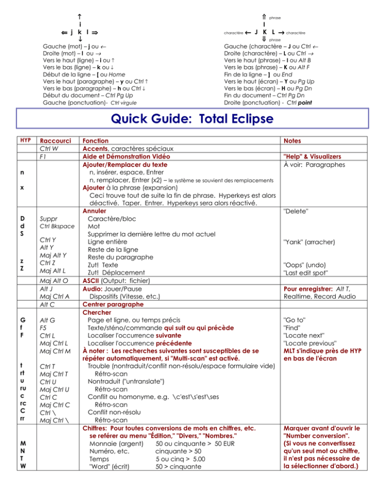 ↑ ⇑ i ⇐ j k l ⇒ I charactère ← J K L → charactère ↓ Gauche (mot) – j ou ← Droite (mot) – l ou → Vers le haut (ligne) – i ou ↑ Vers le bas (ligne) – k ou ↓ Début de la ligne – [ ou Home Vers le haut (paragraphe) – y ou Ctrl ↑ Vers le bas (paragraphe) – h ou Ctrl ↓ Début du document – Ctrl Pg Up Gauche (ponctuation)- Ctrl virgule phrase ⇓ phrase Gauche (charactère – J ou Ctrl ← Droite (charactère) – L ou Ctrl → Vers le haut (phrase) – I ou Alt B Vers le bas (phrase) – K ou Alt F Fin de la ligne – ] ou End Vers le haut (écran) – Y ou Pg Up Vers le bas (écran) – H ou Pg Dn Fin du document – Ctrl Pg Dn Droite (ponctuation) - Ctrl point Quick Guide: Total Eclipse HYP Raccourci Ctrl W F1 n x D d S z Z Suppr Ctrl Bkspace Ctrl Y Alt Y Maj Alt Y Ctrl Z Maj Alt L Maj Alt O Alt J Maj Ctrl A Alt C G f F Alt G F5 Ctrl L Maj Ctrl L Maj Ctrl M t rt u ru c rc C rr Ctrl T Maj Ctrl T Ctrl U Maj Ctrl U Ctrl C Maj Ctrl C Ctrl \ Maj Ctrl \ M N T W Fonction Accents, caractères spéciaux Aide et Démonstration Vidéo Ajouter/Remplacer du texte n, insérer, espace, Entrer n, remplacer, Entrer (x2) – le système se souvient des remplacements Ajouter à la phrase (expansion) Ceci trouve tout de suite la fin de phrase. Hyperkeys est alors déactivé. Taper. Entrer. Hyperkeys sera alors réactivé. Annuler Caractère/bloc Mot Supprimer la dernière lettre du mot actuel Ligne entière Reste de la ligne Reste du paragraphe Zut! Texte Zut! Déplacement ASCII (Output: fichier) Audio: Jouer/Pause Dispositifs (Vitesse, etc.) Centrer paragraphe Chercher Page et ligne, ou temps précis Texte/sténo/commande qui suit ou qui précède Localiser l'occurrence suivante Localiser l'occurrence précédente À noter : Les recherches suivantes sont susceptibles de se répéter automatiquement, si "Multi-scan" est activé. Trouble (nontraduit/conflit non-résolu/espace formulaire vide) Rétro-scan Nontraduit ("untranslate") Rétro-scan Conflit ou homonyme, e.g. \c'est\s'est\ses Rétro-scan Conflit non-résolu Rétro-scan Chiffres: Pour toutes conversions de mots en chiffres, etc. se reférer au menu "Édition," "Divers," "Nombres." Monnaie (argent) 50 ou cinquante > 50 EUR Numéro, etc. cinquante > 50 Temps 5 ou cinq > 5.00 "Word" (écrit) 50 > cinquante Notes "Help" & Visualizers À voir: Paragraphes "Delete" "Yank" (arracher) "Oops" (undo) "Last edit spot" Pour enregistrer: Alt T, Realtime, Record Audio "Go to" "Find" "Locate next" "Locate previous" MLT s'indique près de HYP en bas de l'écran Marquer avant d'ouvrir le "Number conversion". (Si vous ne convertissez qu'un seul mot ou chiffre, il n'est pas nécessaire de la sélectionner d'abord.) Quick Guide: Total Eclipse Ctrl C Alt W Ctrl X Maj Ctrl X Ctrl V Alt R F9 Ctrl D Ctrl G Alt U, User Alt E Marquer " Marquer ( Marquer , Marquer Marquer . Marquer ~ Ctrl F Ctlr F (x2) w e E s S P Maj Ctrl F3 Maj Ctrl F5 Maj Ctrl F6 Maj Ctrl F7 Maj Ctrl F8 Ctrl K w+a Q é * Alt U Ctrl – Ctrl B Ctrl I g 7 8 9 0 Ctrl G Ctrl G (x2) Ctrl G (x3) Ctrl G (x4) Ctrl G (x5) ↑ ↓ Ctrl ↓ Ctrl ↑ Copier Conserver dans un fichier ("Write file") Couper Extraire et créer fichier ("Separate file") Coller ce qui a été copié or coupé Intégrer texte d'un autre fichier ("Read file") Dictionnaire Ouvrir Désigner sténo et définir texte Globaliser, texte > entrée en dictionnaire Désigner dictionnaires, surtout "Travail" à continuer Éditer ou créer un fichier de texte Entourer de guillemets chef > "chef" parenthèses gesticulant > (gesticulant) virgules encore > , encore, Épeller ou Enchaîner traits d'union LeBlanc > L-E-B-L-A-N-C points onu > O.N.U. espaces insécables sommaire > S O M M A I R E Explorer Gestion de Fichiers "Windows Explorateur" Fenêtre Bascules : Vue (Config. AutoMagique) Bande sténo afficher/cacher AutoMagique "Pop-Ups" (afficher/cacher) Zoom – Agrandir Zoom – Réduire Finales (Dialogue "Préfixes et Suffixes") e : féminin ou verbe terminant en "e" es : féminin pluriel ou verbe terminant en "es" s : pluriel (substantifs et adjectifs), verbe terminant en "s" Supprimer la dernière lettre du mot actuel ent : pluriel d'un verbe Pluriel > singulier er/ir/re : infinitif é : participe passé Pronom > sujet (Insérer trait d'union. Modifier le verbe, s'il le faut.) Format Document et Paragraphe - Paramètres Attributs: Marquer, Ctrl avec trait d'union Mettre en gras (Bold): Marquer, puis Ctrl B Mettre en italiques: Marquer, puis Ctrl I Global: Remplacement et entrée en dictionnaire sténo-texte 1 sténogramme (ou 1 entrée à redéfinir) 2 sténogrammes 3 sténogrammes 4 sténogrammes 5 sténogrammes Ajouter/Enlever sténo choisis du côté gauche Ajouter/Enlever sténo choisis du côté droite En dialogue "Global", souvenez-vous de ces raccourcis: Ctrl . > {.} Ctrl , > {,} Ctrl / > {?} F3 > {Q} F4 > {A} F2 > {S:INTERLOCUTEUR} Alt C – Majuscules/MAJUSCULES/minscules Alt L – Lier (espaces insécables ou traits d'union) Ctrl N – Entourer d'accolades Avant de copier or couper, il faut marquer un bloc de texte. Utiliser F7 ou Hyperkey m À voir: Guillemets "Stitch" ("User Settings") ("Attributs du texte") En dialogue "Global", la liste d'Entrées spéciales (Ctrl E). N'oubliez pas de vous en servir. Quick Guide: Total Eclipse Ctrl < Maj Ctrl < Alt “ Alt O F2 Ctrl 1, 2, 3... Ctrl 9 Ctrl 0 B Alt Z n a A F6 Maj F6 Ctrl F6 Alt S Maj Alt S Alt N F8 F2 F3 F4 Maj F4 Maj F5 Ctrl J Ctrl P w Alt Espace Ctrl Maj ; Ctrl K F3 q Ctrl Maj Q Ctrl Q Alt X F4 p R Ctrl Maj R Ctrl W Alt I Maj F7 Alt T Maj Alt T Maj – Ctrl = Maj Guillemets Ouvrir guillemets Fermer guillemets Mettre entre guillemets du texte sélectionné Imprimer Intervenant : Ajouter Changer paragraphe > Intervenant 1, 2, 3, 4, 5, ou 6 Changer paragraphe. Ouvrir la table des interlocuteurs Changer paragraphe > "LE TÉMOIN" Coupure: Q. Sinon... R. Quoi ? Q. ...que faites-vous ? Hyperkeys: Activer/Désactiver Insérer: n, taper, espace, Entrer. N