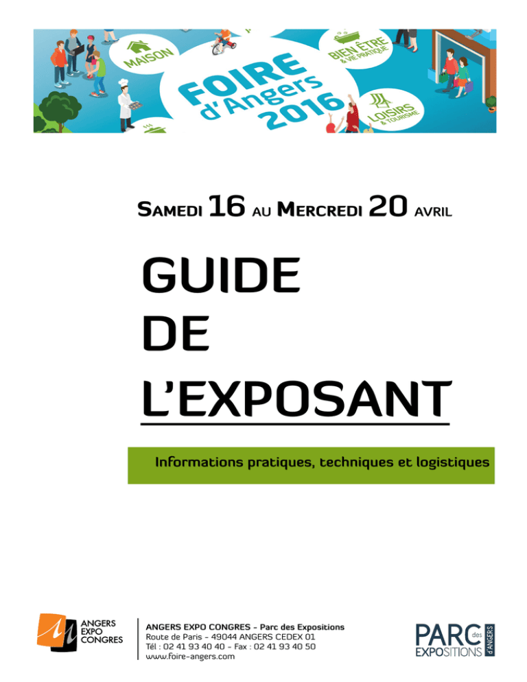 Samedi 16 au Mercredi 20 avril GUIDE DE L’EXPOSANT Informations pratiques, techniques et logistiques ANGERS EXPO CONGRES - Parc des Expositions Route de Paris - 49044 ANGERS CEDEX 01 Tél : 02 41 93 40 40 - Fax : 02 41 93 40 50 www.foire-angers.com SOMMAIRE MEMENTO VOTRE ARRIVEE P.3 Horaires d’ouverture au public Accès au Parc des Expositions L’équipe d’Angers Expo Congrès Planning de la manifestation Etat d’urgence Badge Montage-démontage & Badge Exposant Parkings exposant Accueil au Commissariat Général P.4 P.4 P.5 P.6 P.6 P.7 P8 P.8 Plan du salon P.9 VOTRE STAND Equipement général Electricité - Elingage Fiches stand : Air Libre Gastronomie Restaurant Tourisme et Loisirs Automobiles Ameublement - Habitat - Bien Etre & Vie Pratique Village Senior - Village Kids INSTALLATION Horaires Montage Les accès aux portails Livraison de Marchandises - Levage Manutention Téléphone Connexion WIFI Liste des prestataires PENDANT LA FOIRE D’ANGERS Approvisionnement de votre stand Restauration Sécurité - Gardiennage Documents de sécurité incendie à fournir Gestion des déchets - Nettoyage P.10 P.10 P.11 P.12 P.13 P.14 P.15 P.16 P.17 P.18 P.18 P.19 P.19 P.20 P.21-22 P.23 P.23 P.24 P.25 P.26 REGLEMENTATION Règles principales de sécurité et d’hygiène Affichage des prix - Assurances Loi Hamon - formalisation de l’information du consommateur sur son absence de droit a retractation BON DE COMMANDE COMPLEMENTAIRE ET FORMULAIRES TECHNIQUES P.28 P.29 P.30-31 Bon de commande complémentaire Croquis de positionnement compteur électrique Elingues & Accroches - demande d’autorisation P.33 P.34 P.35 CONDUITE A TENIR EN CAS D’ACCIDENT OU D’INCENDIE P.36 2 MEMENTO Retrouvez toutes les informations pratiques, les bons de commande sur www.foire-angers.com - rubrique EXPOSANTS Horaires visiteurs Samedi - Dimanche - Lundi : 10h - 19h30 Mardi : 10h - 22h (nocturne) Mercredi : 10h - 18h30 (fermeture) Horaires Montage - Démontage Montage Lundi 11 Mardi 12 Mercredi 13 Dans le Grand Palais (sous le restaurant) Du jeudi 14 avril au mercredi 20 avril 2016 Tél : 02 41 93 40 30 Isabelle TAILLANDIER et Ameline JUDIC ([email protected]) ([email protected]) Service Exposants Vos contacts commerciaux : - Aurélie MICHAUD : 02 41 93 40 49 - Ludivine MOUSSEAU : 02 41 93 62 75 - Yves DEREDEC : 02 41 93 40 46 - Alexandre PERON : 02 41 93 40 48 Portails 1-3 et 5 Portails 3 et 5 Vendredi 15 8h - 24h 8h 21h 8h - 18h Commissariat Général Jeudi 14 Entrée possible jusqu’à 21h Portails 1 - 3 -4 et 5 Véhicules interdits dans tous les halls (dernière entrée 1 heure avant la fermeture des portails) Démontage (en fonction du hall, cf fiche de stand) Mercredi 20 19h - 24h Jeudi 21 8h - 18h Pour des raisons de sécurité, les portails, du Parc des Expositions et des bâtiments ne seront ouverts qu’à partir de 19h Aucun démontage ne sera autorisé avant. Commission de sécurité Visite de la Commission de Sécurité : Jeudi 14 avril Chargé de Sécurité : M. Bruno VALOTEAU : 06 16 08 32 15 Gardiennage A partir du jeudi 14 à 18h au jeudi 21 avril à 18h Approvisionnement de stand Entre 8h et 9h30. Pass voiture obligatoire sur demande au Commissariat Général, à laisser apparent dans votre véhicule. Aucun véhicule dans l’enceinte du Parc des Expositions après 9h30. Prestataires Manutention LM MANUTENTION 02 41 34 73 33 Plantes Jardinières FLOR’ ATLANTIC 06 80 02 25 99 Composition florale NATURE ACIDULEE 02 41 47 81 31 Mobilier AMEXPO 02 51 12 90 77 Gardiennage GIP 02 41 93 99 99 Photographe M. CHEVALIER 06 86 76 16 46 Liste complète pages 21 & 22 Animaux : Dans un souci d’hygiène et de respect des personnes et des installations, les chiens sont interdits. ANGERS EXPO CONGRES - Parc des Expositions Route de Paris - 49044 ANGERS CEDEX 01 Tél : 02 41 93 40 40 - Fax : 02 41 93 40 50 www.foire-angers.com 3 Guide Pratique de l’Exposant / TECHNIQUE - FOIRE D’ANGERS 2016 VOTRE VotreARRIVEE Stand Horaires d’ouverture - Accès au Parc des Expositions Horaires d’ouverture VISITEURS Du Samedi 16 au Mercredi 20 avril • Samedi - Dimanche - Lundi : de 10h à 19h30 • Mardi : de 10h à 22h (nocturne) • Mercredi (fermeture) : de 10h à 18h30 Nocturne jusqu’à 22h Mardi 19 avril (Journée pour la Femme) EXPOSANTS Tous les jours à partir de 8h. Accès par les portails 3 et 5 Accès au Parc des Expositions d’Angers TAXI : ROUTE : Accès direct en provenance des autoroutes : A11 (Nantes - Le Mans - Paris) A85 (Tours - Saumur) A87 (Cholet - Niort - Poitiers) Sortie «Angers-Est» Allo Anjou Taxi. Tél. 02 41 87 65 00 BUS : Prendre la ligne N°2, direction St Sylvain d’Anjou descendre à l’arrêt Parc des Expositions. Coordonnées GPS : Parc Expositions : Commune de St Sylvain d’Anjou Longitude : 00°29’43’’ OUEST Latitude : 47°29’52’’ NORD VEHICULE EN LOCATION : AVIS , Gare d’Angers - Tél. 0 820 61 16 82 TRAIN : Par TGV (1h30 de Paris). Renseignements, horaires au 3635. NANTES TOURS LE MANS AVION : Aéroport NANTES ATLANTIQUE à 1 heure par l’autoroute Renseignements et réservation au 3654 ou au 02 40 84 80 00 Aéroport ANGERS LOIRE AEROPORT Tél. 02 41 33 50 20 CHOLET Pour vos déplacements, pensez au covoiturage. 4 Guide Pratique de l’Exposant / TECHNIQUE - FOIRE D’ANGERS 2016 V Votre otre arrivée Stand L’équipe d’angers expo congres TELEPHONE Accueil de l’Administration du Parc Accueil du Commissariat Général (Montage - Pendant salon) E-MAIL 02 41 93 40 40 02 41 93 40 30 SERVICE COMMERCIAL Etienne RAIMBAULT - Directeur Commercial Yves DEREDEC Ameublement Décoration, Jardins et Aménagements Extérieurs Bien Etre et Vie Pratique - Autos Motos - Caravaning Ludivine MOUSSEAU Tourisme - Loisirs - Village Seniors - Village Kids Aurélie MICHAUD Aménagements Intérieurs - Habitat - Energies - Immobilier Restaurants Alexandre PERON Gastronomie - Horticulture (pour journée Végétale) Jeunes Pousses - Habitat 02 41 93 40 40 [email protected] 02 41