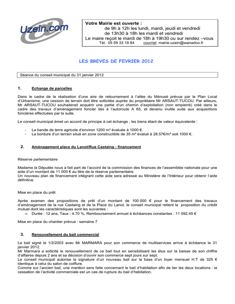 Votre Mairie est ouverte : de 9h à 12h les lundi, mardi, jeudi et vendredi de 13h30 à 18h les mardi et vendredi Le maire reçoit le mardi de 18h à 19h30 ou sur rendez –vous Tél. 05 59 33 19 84 courriel: [email protected] LES BREVES DE FEVRIER 2012 Séance du conseil municipal du 31 janvier 2012 1. Echange de parcelles Dans le cadre de la réalisation d’une aire de retournement à l’allée du Ménusé prévue par le Plan Local d’Urbanisme, une cession de terrain doit être sollicitée auprès du propriétaire Mr ARSAUT-TUCOU. Par ailleurs, Mr ARSAUT-TUCOU souhaiterait acquérir une partie d’un chemin d’exploitation (non empierré) créé dans le cadre des travaux d’aménagement foncier liés à l’autoroute A 65, et devenu inutile suite aux acquisitions foncières effectuées par la suite. Le conseil municipal émet un accord de principe à cet échange ; les biens étant de valeur équivalente : - 2. La bande de terre agricole d’environ 1200 m² évaluée à 1000 €. La bordure d’un terrain situé en zone constructible de 35 m² évalué à 28.57€/m² soit 1000 €. Aménagement place du Lanot/Rue Castaing : financement Réserve parlementaire Madame la Députée nous a fait part de l’accord de la commission des finances de l’assemblée nationale pour une aide d’un montant de 11 000 € au titre de la réserve parlementaire. Un nouveau plan de financement intégrant cette aide sera adressé au Ministère de l’Intérieur pour obtenir l’aide définitive. Mise en place du prêt Après examen des propositions de prêt d’un montant de 100 000 € pour le financement des travaux d’aménagement de la rue Castaing et de la Place du Lanot, le conseil municipal retient la proposition du crédit mutuel dont les caractéristiques sont les suivantes : • Durée : 12 ans, Taux : 4.70 %, Remboursement annuel à échéances constantes : 11 092.45 € Mise en place du chantier prévue : semaine 7 3. Renouvellement du bail commercial Le bail signé le 1/2/2003 avec Mr MARMARA pour son commerce de multiservices arrive à échéance le 31 janvier 2012. Mr Marmara a sollicité le renouvellement de ce bail tout en sensibilisant les élus sur la baisse de son chiffre d’affaires depuis 2 ans et sa décision d’ouvrir son commerce sept jours sur sept. Le conseil municipal autorise la signature d’un nouveau bail sur la base d’un loyer mensuel H.T de 325 € identique à celui du salon de coiffure. Comme sur l’ancien bail, une mention sera faite concernant le bail d’habitation afin de lier les deux locations : la cessation de l’activité commerciale est un cas de rupture du bail d’habitation. 4. Vente de bois Une vente de bois sera organisée le samedi 10 mars 2012. Le rendez-vous est fixé à 9 heures à l’atelier municipal, situé 5 rue du Junca. Le prix de départ des enchères est fixé à 25 € le stère. 5. Finances Consolidation prêt caisse d’Epargne Le prêt court terme de 100 000 € mis en place en 2010 auprès de la Caisse d’Epargne dans l’attente des fonds des cessions foncières à la communauté des communes devrait faire l’objet d’un remboursement au mois de mai ème 2012. Afin d’envisager le financement des nouveaux investissements au cours du 2 semestre 2012 (aménagement du carrefour RD716/208 et rue Calonge) le conseil municipal demande une consolidation de ce prêt par sa transformation en prêt long terme. Attribution de subventions - « Los Gravassèrs » Dans le cadre de l’organisation de la « garburade » du 28 janvier 2012 par l’association « Los Gravassèrs » une avance pour les frais d’achats de 50 € a été allouée à chacune des huit associations participantes. S’agissant d’une rencontre regroupant toutes les associations dans le but de rassembler toute la population du village, le conseil municipal décide de verser à l’association organisatrice une subvention de 400 €. - Coopérative scolaire ( l’OCCE) Le conseil municipal accepte de participer à hauteur de 30% du coût du voyage découverte organisé tous les deux ans. Cette année, la sortie se déroulera à Carcassonne/Port Leucate du 21/5/2012 au 25/5/2012 pour la classe CE2 et CM1 soit 18 élèves. Le montant de la participation de la commune est de 2726,10 €. Pour les sorties scolaires 2011/2012, le conseil municipal renouvelle l’aide attribuée au transport soit 12 sorties : 12 x 110 € = 1 320 €. Convention pour l’animation du Conseil Municipal de Jeunes 2011-2012 Le conseil municipal autorise la signature d’une convention pour l’animation du Conseil Municipal Jeunes d’Uzein 2011-2012 pour un montant de 956.90 €. Par ailleurs, une participation de 300 € sera attribuée à un projet du CMJ, afin de remercier collectivement les sept jeunes qui ont œuvré au repas organisé par le CCAS pour les aînés le 5 novembre 2011. Syndicat Départemental de l’Energie des Pyrénées Atlantiques : - Travaux de sécurisation Les travaux de sécurisation Basse Tension du poste n° 2 « Ecole » et du poste n° 15 « Vignau » program més pour 2012 sont estimés à 30 623.66 €. Ces travaux bénéficient d’un financement intégral de la part du SDEPA. Seuls les frais de gestion restent à la charge de la commune soit un montant prévisionnel maximum de 1163.87 €. Le conseil municipal accepte cette participation dont le montant définitif sera connu après réalisation des travaux. - Eclairage public Le conseil municipal habilite le maire à signer la convention relative aux modalités de participation financière des communes au service d’entretien de l’éclairage public dont la compétence a été transférée au SDEPA. INFORMATIONS DIVERSES ZIC Ô BLED L’association Zic Ô Bled propose une salle de répétition musicale, à l’orée du village. Seul ou en groupe, venez vous exprimer avec vos instruments. Une batterie, une table de mixage et d’autres matériels sont mis à votre disposition. Pour plus de renseig