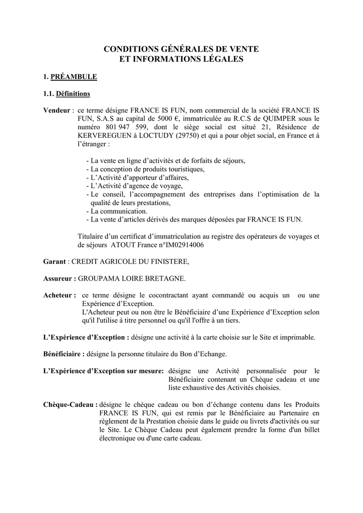 CONDITIONS GÉNÉRALES DE VENTE ET INFORMATIONS LÉGALES 1. PRÉAMBULE 1.1. Définitions Vendeur : ce terme désigne FRANCE IS FUN, nom commercial de la société FRANCE IS FUN, S.A.S au capital de 5000 €, immatriculée au R.C.S de QUIMPER sous le numéro 801 947 599, dont le siège social est situé 21, Résidence de KERVEREGUEN à LOCTUDY (29750) et qui a pour objet social, en France et à l’étranger : - La vente en ligne d’activités et de forfaits de séjours, - La conception de produits touristiques, - L’Activité d’apporteur d’affaires, - L’Activité d’agence de voyage, - Le conseil, l’accompagnement des entreprises dans l’optimisation de la qualité de leurs prestations, - La communication. - La vente d’articles dérivés des marques déposées par FRANCE IS FUN. Titulaire d’un certificat d’immatriculation au registre des opérateurs de voyages et de séjours ATOUT France n°IM02914006 Garant : CREDIT AGRICOLE DU FINISTERE, Assureur : GROUPAMA LOIRE BRETAGNE. Acheteur : ce terme désigne le cocontractant ayant commandé ou acquis un ou une Expérience d’Exception. L'Acheteur peut ou non être le Bénéficiaire d’une Expérience d’Exception selon qu'il l'utilise à titre personnel ou qu'il l'offre à un tiers. L’Expérience d’Exception : désigne une activité à la carte choisie sur le Site et imprimable. Bénéficiaire : désigne la personne titulaire du Bon d’Echange. L’Expérience d’Exception sur mesure: désigne une Activité personnalisée pour le Bénéficiaire contenant un Chèque cadeau et une liste exhaustive des Activités choisies. Chèque-Cadeau : désigne le chèque cadeau ou bon d’échange contenu dans les Produits FRANCE IS FUN, qui est remis par le Bénéficiaire au Partenaire en règlement de la Prestation choisie dans le guide ou livrets d'activités ou sur le Site. Le Chèque Cadeau peut également prendre la forme d'un billet électronique ou d'une carte cadeau. Bon d’échange : désigne un récapitulatif des informations concernant l’Activité d’Exception achetée. Il précise les noms, prénoms, coordonnées des parties, le montant de l’achat, les lieux et les dates de rendez-vous. Date Limite d’Utilisation : date figurant sur le Chèque-Cadeau et indiquant à l’Acheteur la date limite jusqu'à laquelle il peut bénéficier d’une Prestation Partenaire(s) : désigne la personne physique ou morale qui fournit une ou plusieurs Prestations incluse(s) dans un /Billet Electronique FRANCE IS FUN, , Partie (s) : désigne conjointement ou séparément l'Acheteur et/ou le Bénéficiaire et le Vendeur. Prestation : désigne la Prestation ou produit fourni par le Partenaire au profit du Bénéficiaire en échange de la remise du Chèque Cadeau ou le bon d’échange. Produit(s): Désigne l'Activité. Lorsque le Chèque Cadeau ou le bon d’échange correspond à un billet électronique envoyé par mail à l'Acheteur ou Bénéficiaire, il sera précisé qu'il s'agit de Produits en version électronique. Site : désigne le site internet de FRANCE IS FUN : www.franceisfun.fr La Francisfuncard : Bon d’achat d’un montant prédéfini livré dématérialisé sous forme de code ou matérialisé sous forme de carte et permettant d’acheter un ou plusieurs Produits FRANCE IS FUN sur le site www.franceisfun.fr dans la limite d’un montant et d’une durée de validité prédéfinis. Les Francisfuncards ne sont ni échangeables, ni prolongeables. 1.2. Objet du contrat Les présentes Conditions Générales de Vente et garanties (ci-après « CGV ») ont pour objet de définir les conditions et modalités dans lesquelles le Vendeur propose la commercialisation de Produits à des Acheteurs. En conséquence, toute commande de l'Acheteur implique son acceptation sans réserve et son adhésion pleine et entière aux présentes CGV qui prévalent sur tout autre document, sauf conditions particulières expressément consenties par écrit par le Vendeur. L'Acheteur reconnaît avoir pris connaissance des CGV préalablement à sa commande. Les présentes Conditions Générales de Vente entrent en vigueur à compter du 25 septembre 2014. Le Vendeur se réserve le droit de modifier à tout moment les présentes CGV en publiant une nouvelle version sur le Site. En cas de modification des CGV, les CGV applicables sont celles en vigueur à la date de la commande dont une copie datée à ce jour peut être remise à sa demande à l’Acheteur. La nullité d'une clause des présentes CGV n'entraîne pas la nullité des CGV L'inapplication temporaire ou permanente d'une ou plusieurs clauses des CGV par le Vendeur ne saurait valoir renonciation de sa part aux autres clauses des CGV qui continuent à produire leurs effets. L’ensemble des photos présentes sur le Site n'ont aucune valeur contractuelle. 2. VALIDATION ET CONFIRMATION DE LA COMMANDE 2.1. Sur le Site internet : www.franceisfun.fr Conformément à la loi du 13 mars 2000 portant adaptation du droit de la preuve aux technologies de l'information et relatif à la signature électronique, la signature électronique sous forme de "double clic" associé à la procédure d'authentification et de non-répudiation ainsi qu'à la protection de l'intégrité des messages, a valeur de signature qui manifeste le consentement de la Partie aux obligations qui découlent de l‘acte. Le contrat est réputé formé lors de la validation de la commande lors du deuxième clic. Les informations contractuelles feront l'objet d'une confirmation par voie d'e-mail. Dans tous les cas, le Vendeur professionnel se réserve le droit de refuser toute commande pour des motifs légitimes et, plus particulièrement, en cas de soupçons de fraude ou si les quantités de Produits commandés sont anormalement élevées pour des Acheteurs non professionnels. 2.3. Lutte contre la fraude Dans le cadre de sa politique de lutte contre la fraude, le Vendeur se réserve le droit, suite à toute commande passée sur le