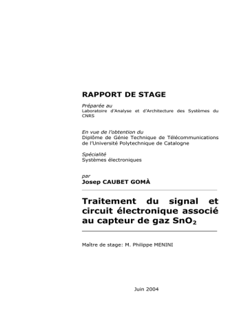 RAPPORT DE STAGE Préparée au Laboratoire d’Analyse et d’Architecture des Systèmes du CNRS En vue de l’obtention du Diplôme de Génie Technique de Télécommunications de l’Université Polytechnique de Catalogne Spécialité Systèmes électroniques par Josep CAUBET GOMÀ Traitement du signal et circuit électronique associé au capteur de gaz SnO2 Maître de stage: M. Philippe MENINI Juin 2004 RAPPORT DE STAGE Préparée au Laboratoire d’Analyse et d’Architecture des Systèmes du CNRS En vue de l’obtention du Diplôme de Génie Technique de Télécommunications de l’Université Polytechnique de Catalogne Spécialité Systèmes électroniques par Josep CAUBET GOMÀ Traitement du signal et circuit électronique associé au capteur de gaz SnO2 Maître de stage: M. Philippe MENINI Juin 2004 À mes parents qui m’ont toujours soutenu, Remerciements Après trois mois de travail, je tenais à remercier tout d’abord les responsables du programme Erasmus pour m’avoir permis de réaliser ce séjour en France, à Toulouse. Je tiens à remercier Monsieur Malik Ghallab, directeur du LAAS, pour m’avoir accueilli au sein du laboratoire. Je remercie également Messieurs Philippe Ménini, maître de conférence à l’Université Paul Sabatier, Frédéric Parret, doctorant, qui m’ont proposé ce stage. Je tiens tout particulièrement à remercier Monsieur Stève Josse, post-doctorant, pour sa disponibilité, sa gentillesse et ses conseils, notamment pour la rédaction de ce rapport. J’exprime aussi ma gratitude à toute l’équipe Technologie Micro et Nanostructures (TMN) sous la direction de Monsieur Gérard Sarrabayrouse. Enfin, je remercie les responsables du département de l’Université Polytechnique de Catalogne pour leur disponibilité et les stagiaires partageant mon bureau pour leur gentillesse. SOMMAIRE I Introduction ................................................................................................... - 4- II Capteur de gaz étudié et les méthodes mathématiques appliquées au traitement du signal .................................................................................... - 5- II.1 Capteur de gaz à SnO2 nanoparticulaire ............................................................ - 5 II.2 Méthodes mathématiques de discrimination et d’extraction des données ..... - 8 III État de l’art sur les circuits électroniques associés au traitement des données ..................................................................................................... - 15 - III.1 Architecture ASIC ............................................................................................. - 15 III.2 Architecture FPGA ............................................................................................. - 15 III.3 Architecture DSP ............................................................................................... - 17 III.4 Microcontrôleurs ............................................................................................... - 21 III.5 Conclusions ....................................................................................................... - 24 IV Traitement des données dans l’air sec pour la discrimination de 2 gaz ... - 25 - IV.1 Résultats de la méthode AFD ........................................................................... - 25 IV.2 Algorithme du programme ............................................................................... - 28 IV.3 Extraction et analyse du programme en langage assembleur ...................... - 31 IV.4 Conclusions ........................................................................................................ - 32 V Conclusions .................................................................................................. - 34 - VI Annexes ...................................................................................................... - 35 - VI.1 Annexe A : Programme en C ............................................................................ - 35 VII Bibliographie ............................................................................................ - 38 - I Introduction Ce rapport est le résultat de mon stage que j’ai réalisé au LAAS-CNRS (Laboratoire d’Analyse et d’Architecture des Systèmes) dans le groupe TMN (Technologie de Micro et Nanostructures) pendant trois mois. Ces travaux ont été réalisés en collaboration avec Stève Josse, post-doctorant, Frédéric Parret, doctorant et Philippe Ménini, maître de conférences. Durant ce stage, j’ai travaillé sur la partie électronique du traitement du signal de nouvelles générations de capteurs de gaz à base de couches sensibles nanoparticulières (SnO2, WO3, In2O3). Les principaux points forts de ces capteurs de gaz SnO2 sont : - Une durée de vie liée au vieillissement des composants électroniques, donc très supérieurs aux capteurs électrochimiques (≈ 10 ans). - Une taille du module de détection réduite. - Une mise en œuvre aussi simple que celle des capteurs électrochimiques. Suivant ces avantages, les applications sont multiples et touchent plusieurs secteurs : - Le secteur de l’automobile (le plus important). - Le secteur domotique. - Le secteur de la santé et l’environnement. L’objectif de mon stage était d’étudier les différentes architectures possibles pour réaliser le circuit électronique et de choisir l’une d’elle dans l’optique de rendre le système complet portatif (capteur et circuit électronique). Ce système portatif rendrait les microcapteurs de gaz encore plus attractifs par leurs faibles dimensions et leur faible consommation à oxydes métalliques. Mon rapport se compose en trois parties : - Une première partie qui introduit la description et le fonctionnement des capteurs de gaz étudies ainsi qu’une étude sur les méthodes mathématiques principales de discrimination et d’extraction de données utilis