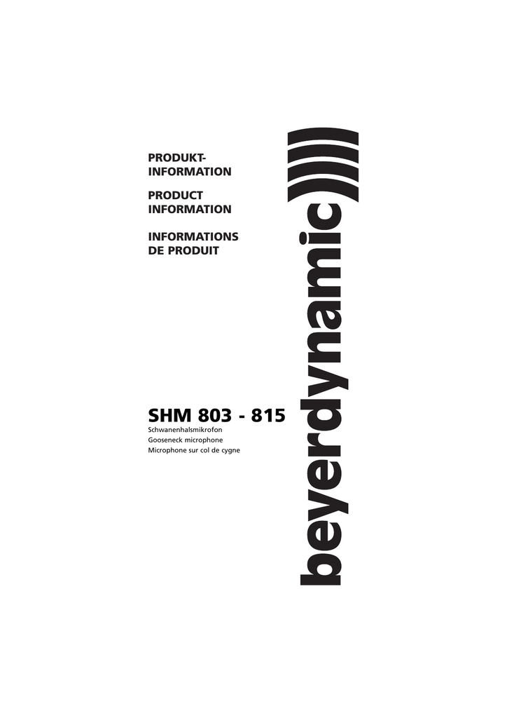 PRODUKTINFORMATION PRODUCT INFORMATION INFORMATIONS DE PRODUIT SHM 803 - 815 Schwanenhalsmikrofon Gooseneck microphone Microphone sur col de cygne Schwanenhals - Achtung Zur Vermeidung von Überdehnungen und frühzeitigem Verschleiß darf der Schwanenhals nur bis max. 90 Grad gebogen werden. Gooseneck - Caution In order to avoid overstretching and premature wear and tear never bend the gooseneck more than 90°. Col de Cygne - Attention Flexion de 90 degrés max. afin d’éviter tout sur-allongement et toute usure prématurée. INHALT / CONTENTS / SOMMAIRE Anwendungen . . . . . . . . . . . . . . . . . . . . . . Anschluß und Inbetriebnahme . . . . . . . . . Pflege. . . . . . . . . . . . . . . . . . . . . . . . . . . . . Service . . . . . . . . . . . . . . . . . . . . . . . . . . . . Typen-Schlüssel . . . . . . . . . . . . . . . . . . . . . Versionen. . . . . . . . . . . . . . . . . . . . . . . . . . Lieferzubehör . . . . . . . . . . . . . . . . . . . . . . Optionales Zubehör. . . . . . . . . . . . . . . . . . Technische Daten . . . . . . . . . . . . . . . . . . . . Frequenzgang . . . . . . . . . . . . . . . . . . . . . . Richtdiagramm, Schaltbild, Abmessungen . . . . . . . . . . . Seite 4 Seite 4 Seite 4 Seite 5 Seite 5 Seite 6 Seite 6 Seite 7 Seite 8 Seite 22 Seite 23 deutsch PRODUKTINFORMATION SHM 803 - 815 Applications . . . . . . . . . . . . . . . . Connection and Setting up . . . . Maintenance . . . . . . . . . . . . . . . Service . . . . . . . . . . . . . . . . . . . . Types . . . . . . . . . . . . . . . . . . . . . Versions . . . . . . . . . . . . . . . . . . . Supplied Accessories . . . . . . . . . Optional Accessories . . . . . . . . . Technical Specifications . . . . . . . Frequency response curve, . . . . Polar pattern, Wiring Diagram, Dimensions . . . . . . . . . . . . . . . . . . . . . . . . . . . . . . . . . . . . . . . . . . . . . . . . . . . . . . . . . . . . . . . . . . . . . . . . . . . . . . . . . . . . . . . . . . . . . . . . . . . . . . . . . . Page Page Page Page Page Page Page Page Page Page 10 10 10 11 11 12 12 13 14 22 english PRODUCT INFORMATION SHM 803 - 815 . . . . . . . . . Page 23 Applications . . . . . . . . . . . . . . . . . . . Branchements et mise en marche . . Entretien . . . . . . . . . . . . . . . . . . . . . Service après-vente . . . . . . . . . . . . . Typen-Schlüssel . . . . . . . . . . . . . . . . Modèles . . . . . . . . . . . . . . . . . . . . . . Accessoires fournis. . . . . . . . . . . . . . Accessoires en option . . . . . . . . . . . Spécifications techniques. . . . . . . . . Courbe de fréquence. . . . . . . . . . . . Directivité, Diagramme de câblage, Dimensions . . . . . . . . . . . . . . . . . . . . . . . . . . . . . . . . . . . . . . . . . . . . . . . . . . . . . . . . . . . . . . . . . . . . . . . . . . . . . . . Page Page Page Page Page Page Page Page Page Page 16 16 16 16 17 18 18 19 20 22 français INFORMATIONS DE PRODUIT SHM 803 - 815 . . . . . . Page 23 3 PRODUKTINFORMATION SHM 803 - 815 Sie haben sich für das Schwanenhalsmikrofon aus der Reihe SHM 803 - 815 von beyerdynamic entschieden. Vielen Dank für Ihr Vertrauen. Nehmen Sie sich bitte einige Minuten Zeit und lesen Sie diese Produktinformation vor Inbetriebnahme aufmerksam durch. Anwendungen Das SHM 803 - 815 mit Hypernieren/Keulencharakteristik ist extrem rückkopplungsarm und Nebengeräusche werden wirkungsvoll unterdrückt. Das Schwanenhalsmikrofon eignet sich sehr gut als Rednermikrofon in Konferenzen. Anschluß und Inbetriebnahme • • • Das SHM 803 - 815 ist mit einem 3-pol. XLR-Stecker bzw. einer 3-pol. XLR-Kupplung oder einem Nexusstecker (Klinke) ausgestattet. Sie können es an jeden Mikrofoneingang mit Phantomspeisung anschließen. Zum Anschluß verwenden Sie nur symmetrische Kabel. Richten Sie das Mikrofon so aus, daß es direkt auf die Schallquelle (Redner) zeigt. Der Aufnahmewinkel bleibt auch für sehr hohe Frequenzen konstant. Innerhalb eines Winkels von ± 40 Grad ergeben sich daher keine Klangverfärbungen bei seitlicher Bewegung des Sprechers. Außerhalb dieses Aufnahmewinkels nimmt die Empfindlichkeit des Mikrofons sehr stark ab. Pflege Bei Bedarf reinigen Sie das Schwanenhalsmikrofon mit einem weichen feuchten Tuch. Wenn notwendig, können Sie ein mildes Reinigungsmittel (z.B. Geschirrspülmittel) verwenden, auf keinen Fall lösemittelhaltige Reiniger. Achten Sie darauf, daß in den Mikrofonwandler kein Wasser läuft. 4 Service deutsch Im Servicefall wenden Sie sich bitte an autorisiertes Fachpersonal. Öffnen Sie das Mikrofon auf keinen Fall selbst, Sie könnten sonst alle Garantieansprüche verlieren. Typen-Schlüssel Die letzte Zahl der Bezeichnung zeigt die Länge des Schwanenhalses an: SHM 803 = 35 cm SHM 805 = 50 cm Schwanenhalsmikrofone mit einem Leuchtring haben als zweite Zahl eine „1“: SHM 814 = mit Leuchtring, 40 cm lang SHM 815 = mit Leuchtring, 50 cm lang Die Buchstaben nach der Bezeichnung stehen für: A = Standardtyp, XLR-Stecker AD = Designausführung mit konischem Schwanenhals ADN = Designausführung mit konischem Schwanenhals und Nextelbeschichtung AN = Standard, mit Nextelbeschichtung AS = Standard, mit Schalter AW = Standard, in weiß C = Conference, Sprechstellenausführung, C01 - C99 E = ohne Speisewandler F = mit XLR-Buchse FS = mit XLR-Buchse und Schalter G = mit 5/8" Innengewinde YN = mit Nexusstecker und Nextelbeschichtung YLN = mit Nexusstecker, langem Schaft, Nextelbeschichtung 5 Versionen Bez. Beschreibung . . . . . . . . . . . . . . SHM 803 A mit 3-pol. XLR-Stecker, schwarz . SHM 803 AW mit 3-pol. XLR-Stecker, weiß . . . SHM 803 AS mit 3-pol. XLR-Stecker, schwarz, mit Ein/Aus-Schalter . . . . . . . . . . SHM 803 F mit 3-pol. XLR-Buchse . . . . . . . . SHM 805 A mit 3-pol. XLR-Stecker, schwarz . SHM 805 AS mit 3-pol. XLR-Stecker, schwarz, mit Ein/Aus-Schalter . . . . . . . . . . SHM 814 A mit 5-pol. XLR-Stecker, schwarz, mit Leuchtring . . . . . . . . . . . . . . SHM 814 AN mit 5-pol. XLR-Stecker, Nextel, mit L