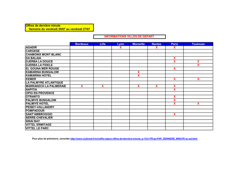Offres de dernière minute Semaine du vendredi 20/07 au vendredi 27/07 INFORMATIONS VILLES DE DEPART Bordeaux AGADIR CARGESE CHAMONIX MONT-BLANC DA BALAIA DJERBA LA DOUCE DJERBA LA FIDELE EL GOUNA MER ROUGE KAMARINA BUNGALOW KAMARINA HOTEL KEMER LA PALMYRE ATLANTIQUE MARRAKECH LA PALMERAIE NAPITIA OPIO EN PROVENCE OTRANTO PALMIYE BUNGALOW PALMIYE HOTEL PEISEY-VALLANDRY POMPADOUR SANT'AMBROGGIO SERRE-CHEVALIER SINAI BAY VITTEL ERMITAGE VITTEL LE PARC Lille Lyon X Marseille Nantes X Paris X Toulouse X X X X X X X X X X X X X X X X X X X Pour plus de précisions, consulter http://www.clubmed.fr/cm/offre-sejour-offres-de-derniere-minute_p-133-l-FR-pa-PAP_DERNIERE_MINUTE-ac-od.html X