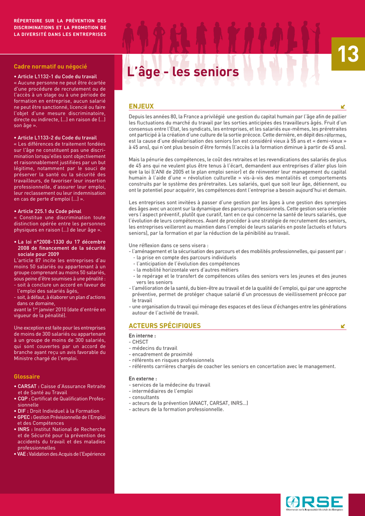 RÉPERTOIRE SUR LA PRÉVENTION DES DISCRIMINATIONS ET LA PROMOTION DE LA DIVERSITÉ DANS LES ENTREPRISES 13 Cadre normatif ou négocié • Article L1132-1 du Code du travail « Aucune personne ne peut être écartée d'une procédure de recrutement ou de l'accès à un stage ou à une période de formation en entreprise, aucun salarié ne peut être sanctionné, licencié ou faire l'objet d'une mesure discriminatoire, directe ou indirecte, (…) en raison de (…) son âge ». • Article L1133-2 du Code du travail « Les différences de traitement fondées sur l'âge ne constituent pas une discrimination lorsqu'elles sont objectivement et raisonnablement justifiées par un but légitime, notamment par le souci de préserver la santé ou la sécurité des travailleurs, de favoriser leur insertion professionnelle, d'assurer leur emploi, leur reclassement ou leur indemnisation en cas de perte d'emploi (...) ». • Article 225.1 du Code pénal « Constitue une discrimination toute distinction opérée entre les personnes physiques en raison (…) de leur âge ». • La loi n°2008-1330 du 17 décembre 2008 de financement de la sécurité sociale pour 2009 L'article 87 incite les entreprises d’au moins 50 salariés ou appartenant à un groupe comprenant au moins 50 salariés, sous peine d'être soumises à une pénalité : - soit à conclure un accord en faveur de l'emploi des salariés âgés, - soit, à défaut, à élaborer un plan d'actions dans ce domaine, avant le 1er janvier 2010 (date d'entrée en vigueur de la pénalité). Une exception est faite pour les entreprises de moins de 300 salariés ou appartenant à un groupe de moins de 300 salariés, qui sont couvertes par un accord de branche ayant reçu un avis favorable du Ministre chargé de l'emploi. Glossaire • CARSAT : Caisse d’Assurance Retraite et de Santé au Travail • CQP : Certificat de Qualification Professionnelle • DIF : Droit Individuel à la Formation • GPEC : Gestion Prévisionnelle de l'Emploi et des Compétences • INRS : Institut National de Recherche et de Sécurité pour la prévention des accidents du travail et des maladies professionnelles • VAE : Validation des Acquis de l'Expérience L’âge - les seniors ENJEUX C Depuis les années 80, la France a privilégié une gestion du capital humain par l’âge afin de pallier les fluctuations du marché du travail par les sorties anticipées des travailleurs âgés. Fruit d’un consensus entre l’Etat, les syndicats, les entreprises, et les salariés eux-mêmes, les préretraites ont participé à la création d’une culture de la sortie précoce. Cette dernière, en dépit des réformes, est la cause d’une dévalorisation des seniors (on est considéré vieux à 55 ans et « demi-vieux » à 45 ans), qui n’ont plus besoin d’être formés (l’accès à la formation diminue à partir de 45 ans). Mais la pénurie des compétences, le coût des retraites et les revendications des salariés de plus de 45 ans qui ne veulent plus être tenus à l’écart, demandent aux entreprises d’aller plus loin que la loi (l’ANI de 2005 et le plan emploi senior) et de réinventer leur management du capital humain à l’aide d’une « révolution culturelle » vis-à-vis des mentalités et comportements construits par le système des préretraites. Les salariés, quel que soit leur âge, détiennent, ou ont le potentiel pour acquérir, les compétences dont l’entreprise a besoin aujourd’hui et demain. Les entreprises sont invitées à passer d’une gestion par les âges à une gestion des synergies des âges avec un accent sur la dynamique des parcours professionnels. Cette gestion sera orientée vers l’aspect préventif, plutôt que curatif, tant en ce qui concerne la santé de leurs salariés, que l’évolution de leurs compétences. Avant de procéder à une stratégie de recrutement des seniors, les entreprises veilleront au maintien dans l’emploi de leurs salariés en poste (actuels et futurs seniors), par la formation et par la réduction de la pénibilité au travail. Une réflexion dans ce sens visera : - l’aménagement et la sécurisation des parcours et des mobilités professionnelles, qui passent par : - la prise en compte des parcours individuels - l’anticipation de l’évolution des compétences - la mobilité horizontale vers d’autres métiers - le repérage et le transfert de compétences utiles des seniors vers les jeunes et des jeunes vers les seniors - l’amélioration de la santé, du bien-être au travail et de la qualité de l’emploi, qui par une approche préventive, permet de protéger chaque salarié d’un processus de vieillissement précoce par le travail - une organisation du travail qui ménage des espaces et des lieux d’échanges entre les générations autour de l’activité de travail. ACTEURS SPÉCIFIQUES En interne : - CHSCT - médecins du travail - encadrement de proximité - référents en risques professionnels - référents carrières chargés de coacher les seniors en concertation avec le management. En externe : - services de la médecine du travail - intermédiaires de l’emploi - consultants - acteurs de la prévention (ANACT, CARSAT, INRS…) - acteurs de la formation professionnelle. C L’âge - les seniors 13 I. MISE EN OEUVRE Accord ou plan d’actions – ce que prévoit la loi Des accords et des plans d’actions seniors peuvent être signés et/ou mis en place par : - les entreprises qui se trouvent sous l’incidence de la loi de financement de la sécurité sociale pour 2009 - les entreprises qui ne se trouvent pas sous l’incidence de cette loi, mais qui ont la volonté d’avancer sur ce sujet et de faire le bilan sur leurs actions réalisées. Dans son accord ou plan d’actions, l’entreprise doit choisir au moins trois des domaines d'actions parmi les six prévus par l’article R.138-26 du Code de la sécurité sociale : 1. Recrutement des salariés âgés dans l'entr