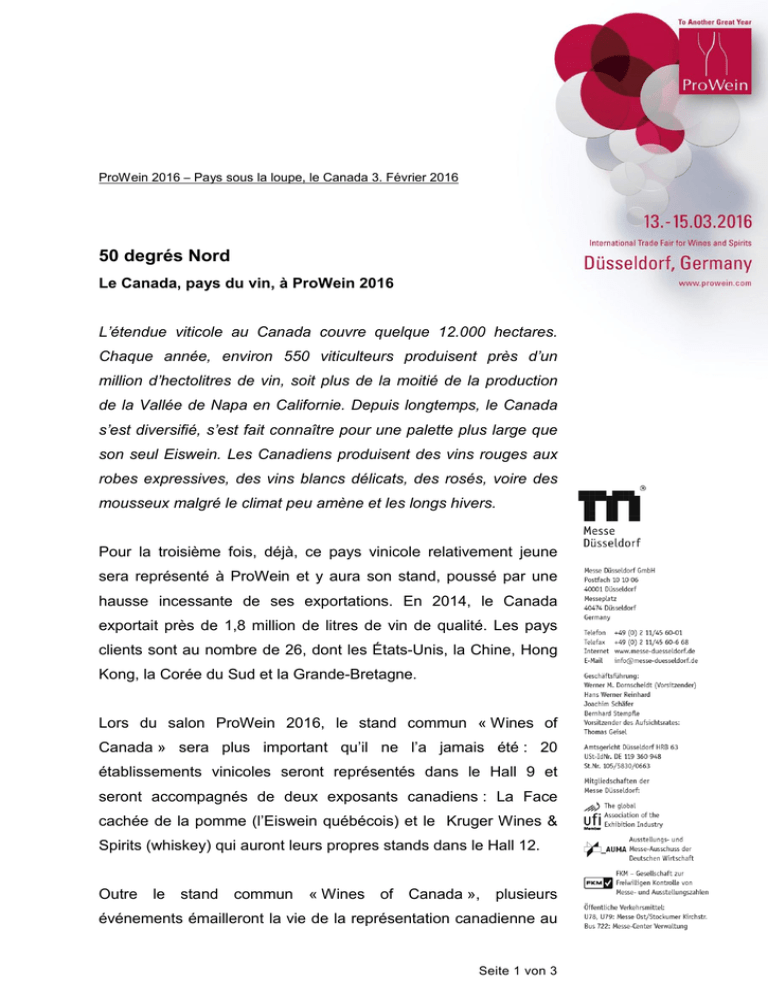 ProWein 2016 – Pays sous la loupe, le Canada 3. Février 2016 50 degrés Nord Le Canada, pays du vin, à ProWein 2016 L’étendue viticole au Canada couvre quelque 12.000 hectares. Chaque année, environ 550 viticulteurs produisent près d’un million d’hectolitres de vin, soit plus de la moitié de la production de la Vallée de Napa en Californie. Depuis longtemps, le Canada s’est diversifié, s’est fait connaître pour une palette plus large que son seul Eiswein. Les Canadiens produisent des vins rouges aux robes expressives, des vins blancs délicats, des rosés, voire des mousseux malgré le climat peu amène et les longs hivers. Pour la troisième fois, déjà, ce pays vinicole relativement jeune sera représenté à ProWein et y aura son stand, poussé par une hausse incessante de ses exportations. En 2014, le Canada exportait près de 1,8 million de litres de vin de qualité. Les pays clients sont au nombre de 26, dont les États-Unis, la Chine, Hong Kong, la Corée du Sud et la Grande-Bretagne. Lors du salon ProWein 2016, le stand commun « Wines of Canada » sera plus important qu’il ne l’a jamais été : 20 établissements vinicoles seront représentés dans le Hall 9 et seront accompagnés de deux exposants canadiens : La Face cachée de la pomme (l’Eiswein québécois) et le Kruger Wines & Spirits (whiskey) qui auront leurs propres stands dans le Hall 12. Outre le stand commun « Wines of Canada », plusieurs événements émailleront la vie de la représentation canadienne au Seite 1 von 3 salon pour valoriser l’image du produit. Lors du Forum Prowein, à 11H30, aura lieu un Atelier Masterclass et à 15H, chaque jour, une session de dégustation guidée est prévue au stand. Les deux événements sont accueillis par le blogueur britannique bien connu, Jamie Goode. Régions viticoles canadiennes Les producteurs du stand « Wines of Canada » proviennent essentiellement de trois provinces : Ontario, Colombie-Britannique et Nouvelle-Écosse. L’Ontario est de loin la plus importante région viticole. 80% des vins canadiens y sont produits sur quelque 6.000 hectares. La moitié des 20 producteurs de vins canadiens présents à ProWein sont logiquement de cette province. Ils produisent surtout du Riesling, du Chardonnay et de l’Eiswein, avec des bons résultats. Lors des années baignées de chaleur par un climat plus clément, le Gamay et le Pinot Noir, le Cabernet Franc et le Cabernet Sauvignon concurrencent les autres cépages. Au fil des dernières années, les Merlots canadiens ont, par exemple, gagné du terrain par la qualité persuasive du produit. Rien de tout à fait surprenant lorsque l’on sait que l’Ontario se trouve sur pratiquement la même latitude géographique que la Toscane en Italie… Huit producteurs de Colombie-Britannique seront présents à ProWein. Au cœur de cette province, dans la partie occidentale lointaine du Canada, se trouvent Vancouver et une vaste palette de cépages tels que le Pinot Gris, le Chardonnay, le Gewürztraminer, le Riesling, le Merlot, le Pinot Noir, le Cabernet Sauvignon et le Syrah. En Nouvelle-Écosse, dans la partie orientale du pays, la région viticole est bien moins importante que dans les autres provinces. Deux viticulteurs représenteront la région au salon. La surface des Seite 2 von 3 vignobles y est relativement restreinte et les ceps, résistants au gel, sont moins bien connus. Pour protéger les vignobles du gel, ils sont enterrés en automne et libérés lorsque la terre s’ameublit au printemps. La Nouvelle-Écosse se propulse comme producteur de vins à bulles produits selon la traditionnelle méthode champenoise. Système d’appellation VQA Pour contrôler la qualité du vin et la garantir sur le long terme, le vin canadien a son propre système de classification. Les vins VQA (Vintners Quality Alliance) garantissent que 100% des raisins proviennent de la région concernée. Cette alliance exige que chaque vin porte l’étiquetage de sa province d’origine ou géographique, et au fil des ans, de plus en plus de zones viticoles sont définies en fonction des influences microclimatiques et des propriétés du sol. Contact pour la presse : Messe Düsseldorf GmbH, Press Office ProWein Christiane Schorn, Brigitte Küppers (Assistante) Tél.: 0211/4560 –991/–929 [email protected], [email protected] Pour en savoir plus : www.prowein.de or on the social networks Facebook: www.facebook.com/ProWein.tradefair Twitter: https://twitter.com/ProWein Notre base de données photos met à la disposition des illustrations de haute résolution dans la section « Press Service » de www.prowein.de. Seite 3 von 3