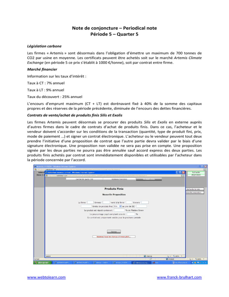 Note de conjoncture – Periodical note Période 5 – Quarter 5 Législation carbone Les firmes « Artemis » sont désormais dans l’obligation d’émettre un maximum de 700 tonnes de CO2 par usine en moyenne. Les certificats peuvent être achetés soit sur le marché Artemis Climate Exchange (en période 5 ce prix s’établit à 1000 €/tonne), soit par contrat entre firme. Marché financier Information sur les taux d’intérêt : Taux à CT : 7% annuel Taux à LT : 9% annuel Taux du découvert : 25% annuel L’encours d’emprunt maximum (CT + LT) est dorénavant fixé à 40% de la somme des capitaux propres et des réserves de la période précédente, diminuée de l’encours des dettes financières. Contrats de vente/achat de produits finis Silis et Exolis Les firmes Artemis peuvent désormais se procurer des produits Silis et Exolis en externe auprès d’autres firmes dans le cadre de contrats d’achat de produits finis. Dans ce cas, l’acheteur et le vendeur doivent s’accorder sur les conditions de la transaction (quantité, type de produit fini, prix, mode de paiement …) et signer un contrat électronique. L’acheteur ou le vendeur peuvent tout deux prendre l’initiative d’une proposition de contrat que l’autre partie devra valider par le biais d’une signature électronique. Une proposition non validée ne sera pas prise en compte. Une proposition signée par les deux parties ne pourra pas être annulée sauf accord express des deux parties. Les produits finis achetés par contrat sont immédiatement disponibles et utilisables par l’acheteur dans la période concernée par l’accord. www.webtolearn.com www.franck-brulhart.com Dans le cas des achats par contrats de produits Silis et Exolis, les produits achetés peuvent correspondre à des proportions de MP Green supérieures ou inférieures à celles des produits stockés. De la même manière que pour la fabrication de produits en interne, ces modifications affectent le pourcentage de MP Green dans les produits présents dans les stocks et peuvent entraîner la vente en soldes de ces stocks (à hauteur de 80% du coût de production du stock initial) selon l’intensité de ces modifications. Pour la firme acheteuse, l’impact de ces modifications est le suivant : 1/ Si la proportion de MP Green dans des produits achetés par contrat présente un écart de moins de 10% avec la proportion de MP Green présente dans les produits en stock1 (la proportion de MP Green présente dans les produits en stock correspond à la moyenne pondérée de la proportion de MP Green dans le stock initial et dans la production du trimestre), alors le contrat d’achat est validé et les produits achetés par contrat rentrent dans le stock. Dans ce cas, le stock final après contrat présente un pourcentage de MP Green calculé sur la base de la moyenne pondérée de la proportion de MP Green du stock initial, des produits fabriqués en interne et des produits achetés sous contrat) ; Ainsi par exemple, dans le cas où une firme dispose de 100 000 unités de Silis à 10% de MP Green en stock, décide de produire 100 000 unités de Silis à 0% de MP green, et passe un contrat d’achat de 100 000 unités de Silis à 5% de MP Green, alors son stock disponible à la vente sera de 300 000 unités à 5% de MP Green. 2/ Si la proportion de MP Green dans des produits achetés par contrat présente un écart de plus de 10% avec la proportion de MP Green présente dans les produits en stock2 (la proportion de MP Green présente dans les produits en stock correspond à la moyenne pondérée de la proportion de MP Green dans le stock initial et dans la production du trimestre), alors le contrat d’achat est invalidé et la firme acheteuse paie une pénalité dont le montant est égal à 20% du montant du contrat. L’acheteur ne reçoit aucun produit. De son coté, la firme vendeuse reçoit le paiement en intégralité grâce au soutien d’un fond d’assurance et ses produits sortent de son stock. Ainsi par exemple, dans le cas où une firme dispose de 100 000 unités de Silis à 10% de MP green en stock, décide de produire 100 000 unités de Silis à 0% de MP green, et passe un contrat d’achat de 100 000 unités de Silis à 25% de MP green au prix de 500 €, alors elle ne reçoit pas les 100 000 unités correspondant au contrat et paie une pénalité de 10 000 K€. Son stock disponible à la vente sera de 200 000 unités à 5% de MP Green. Pour la firme vendeuse, l’impact des écarts de MP dans les produits finis échangés par contrat est le suivant : 1/ Si la proportion de MP Green dans les produits vendus par contrat présente un écart de moins de 10% avec la proportion de MP Green présente dans les produits en stock3 (la proportion de MP Green présente dans les produits en stock correspond à la moyenne pondérée de la proportion de MP Green dans le stock initial et dans la production du trimestre), alors le contrat d’achat est validé et les produits vendus par contrat sortent du stock. 2/ Si la proportion de MP Green dans des produits vendus par contrat présente un écart de plus de 10% avec la proportion de MP Green présente dans les produits en stock4 (la proportion de MP Green présente dans les produits en stock correspond à la moyenne pondérée de la proportion de MP Green dans le stock initial et dans la production du 1 (stock initial de la période + production de la période) (stock initial de la période + production de la période) 3 (stock initial de la période + production de la période) 4 (stock initial de la période + production de la période) 2 www.webtolearn.com www.franck-brulhart.com trimestre), alors le contrat de vente est validé mais la firme vendeuse honore son contrat en ayant recours à des achats spots de produits finis (sous-traitance)5. En cas de contrat d’achat/vente de produits finis, les produits sont réputés non accrédités. En outre, les produits vendus par contrat son