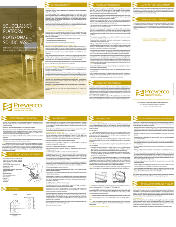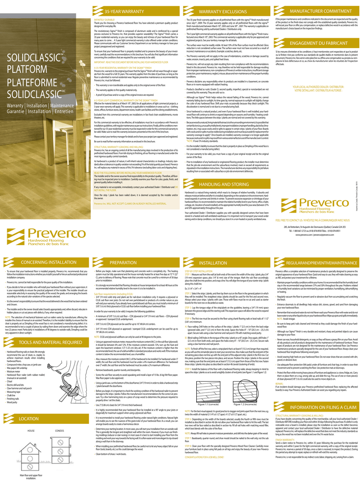 INFINITELY DURABLE! Thank you for choosing a Preverco hardwood floor. You have selected a premium quality product designed for everyday life. The revolutionary Sigma™ finish is composed of aluminum oxide and is reinforced by a special process exclusive to Preverco Inc. that provides superior wearability ! The Sigma™ finish carries a 35-year residential warranty, so you can enjoy the beauty and richness of your hardwood floor for many years to come… A 3-year light commercial warranty is also offered under certain conditions. Please communicate with our Customer Service Department or our territory manager to have your project preapproved and registered. SOLIDCLASSIC PLATFORM PLATEFORME SOLIDCLASSIC ™ To ensure that your hardwood floor is properly installed and to preserve the beauty of your investment, carefully read the recommendations in this brochure. You will also find significant information concerning the conditions that are required for your warranty to be valid. IMPORTANT : READ THIS DOCUMENT BEFORE INSTALLING YOUR HARDWOOD FLOOR A 35-YEAR RESIDENTIAL WARRANTY ON THE SIGMA™ FINISH Preverco Inc. warrants to the original purchaser that the Sigma™ finish will not wear through or separate from the wood for a full 35 years. This warranty applies from the date of purchase, as long as the floor is submitted to normal residential wear. Regular preventive maintenance as recommended by Preverco Inc. must be followed. • This warranty is non-transferable and applies only to the original owner of the floor. MC Warranty | Installation | Maintenance Garantie | Installation | Entretien • The warranty applies to first quality material only. • A proof of purchase and/or a copy of the original invoice are required. A 3-YEAR LIGHT COMMERCIAL WARRANTY ON THE SIGMA™ FINISH Effective for material dated as of March 10th, 2003, for all applications of light commercial projects, a 3-year wear warranty will apply. This warranty is applicable to installations in areas such as – clothing stores, offices, furniture stores, department stores, health care facilities and fine dining establishments. Excluded from this commercial warranty are installations in fast food chain establishments, movie theaters, etc. For this commercial warranty to be effective, all installations must be in accordance with Preverco’s installation guidelines, with regular maintenance as per our instructions. Finally, all the conditions mentioned for our 35-year residential warranty must be respected in order for this commercial warranty to be valid. Make sure to read the warranty exclusions presented at the end of this brochure. Please contact your territory manager for details and to have your project pre-approved and registered. Be sure to read further warranty information as enclosed in this brochure. WARRANTY EXCLUSIONS • The 35-year finish warranty applies on all prefinished floors with the sigmaTM finish manufactured since July1st, 2009. The 25-year warranty applies only on all prefinished floors with the sigmaTM finish manufactured between March 10th, 2003 and June 30th , 2007. The warranty is applicable on prefinished flooring sold by authorized Dealers / Distributors only • The 3-year light commercial warranty applies on all prefinished floors with the Sigma™ finish manufactured since March 10th, 2003. This commercial warranty is applicable only for pre-approved and registered projects. See your territory manager for all details. • The surface wear must be readily visible. At least 10% of the floor surface must be affected. Gloss reduction is not considered surface wear. The surface wear must not have occurred as a result of incorrect maintenance or accidents. Example: scratches, dents, etc. • The Preverco warranty will not apply in the case of indentations, scratches or damage caused by water, erosion, insects, pets, and spiked heel shoes. • Preverco Inc. will not accept any claim resulting from non-compliance with the recommendations listed in this document. Preverco Inc. may therefore not be held responsible for damage resulting from improper maintenance, non-compliance of Preverco’s written instructions, insufficient storage protection, poor maintenance, neglect, misuse, abuse and non-maintenance of the proper humidity conditions. • Preverco disclaims any responsibility when its products are installed in a basement, on concrete floors or in rooms equipped with radiant heating. • Products classified as rustic (Grade C), second quality, imperfect, special or nonstandard are not covered by this warranty. They are sold «as is». • Prior to installation of any hardwood or engineered flooring product, the installer must determine that the job-site environment and the subsurfaces involved, meet or exceed all requirements as stipulated in the installation instructions . The manufacturer declines any responsibility for job failure resulting from or associated with subsurface or job-site environment defiencies. Preverco Inc. WILL NOT ACCEPT CLAIMS ON ALREADY INSTALLED MATERIAL. Si les mesures d’entretien et les conditions ci haut mentionnées sont respectées et que le produit ou la finition n’est pas conforme aux standards de qualité établis et mentionnés dans le présent document, Preverco Inc. fera vernir votre plancher ou offrira une compensation au prorata ou remplacera le bois défectueux et ce, au choix du manufacturier selon les résultats de l’inspection effectuée. YOUR LOCAL AUTHORIZED DEALER / DISTRIBUTOR : VOTRE DÉTAILLANT / DISTRIBUTEUR AUTORISÉ : • Because wood is a natural, living material that reacts to the surrounding environment, it is possible that certainfactors(e.g.unusualhumiditylevels,improperinstallation,improperhandling,alackofacclimatization, etc.) may cause cracks and/or splits to appear in certain strips / planks of your floor. Boards with cracks and/or splits must be visible during installation and must be put aside for replacement for warranty cover