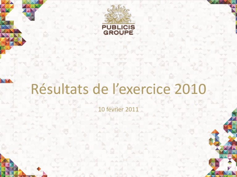 Résultats de l’exercice 2010 10 février 2011 Avertissement Certaines informations autres qu’historiques contenues dans le présent document sont susceptibles de constituer des données à caractère prévisionnel («forward-looking statements») ou des prévisions financières non auditées. Ces données sont sujettes à des risques et des aléas pouvant se traduire, ultérieurement, par des données réelles substantiellement différentes. Ces données sont présentées à la date du présent document et Publicis Groupe n’assume aucune obligation quant à leur mise à jour du fait d’événements nouveaux ou de toute autre raison autre que les réglementations applicables. Publicis Groupe vous invite à prendre connaissance avec attention des informations relatives aux facteurs susceptibles d’affecter son activité telles que figurant dans son Document de Référence déposé auprès de l’Autorité des Marchés Financiers (AMF). 2 Publicis Groupe en 2010 4e trimestre 2010 : Chiffres clés Revenus (millions EUR) 2010 1 560 2009 1 268 + 23,0% Croissance organique + 12,5% 3 Publicis Groupe en 2010 2010 : Chiffres clés Revenus (millions EUR) 2010 5 418 2009 4 524 + 19,8% Croissance organique + 8,3% 4 Publicis Groupe en 2010 2010 : Chiffres clés Marge opérationnelle (millions EUR) 2010 856 2009 680 + 25,9% % Marge opérationnelle 15,8% +80 bp 5 Publicis Groupe en 2010 2010 : Chiffres clés Résultat net part du groupe (Millions EUR) 2010 526 2009 403 + 30,5% 6 Publicis Groupe en 2010 2010 : Chiffres clés BNPA courant* dilué (EUR) 2010 2,39 2009 1,97 + 21% * Après élimination des pertes de valeur, de l’amortissement des incorporels liés aux acquisitions, des plus-values de cession d’immeubles et du crédit d’impôt lié à l’impôt différé passif sur l’Oceane 2014 (pour 2009) 7 Publicis Groupe en 2010 2010 : Chiffres clés Free Cash Flow* (millions EUR) 2010 646 2009 524 * Avant variation du BFR + 23,3% 8 RÉSULTATS FINANCIERS 9 Revenu 2010 Croissance confirmée* +12,5% +9,2% +7,1% +3,1% T1 2010 * Croissance organique T2 2010 T3 2010 T4 2010 10 Revenu 2010 Revenu du 4e trimestre par zone géographique T4 2010 T4 2009 Croissance organique 2010 Europe 556 483 11,3% 15,1% Amérique du Nord 683 545 14,0% 25,2% Asie Pacifique 180 146 6,4% 23,1% Amérique Latine 87 51 22,1% 70,9% Moyen-Orient et Afrique 54 43 15,3% 26,4% 1 560 1 268 12,5% 23,0% (millions EUR) Total Var. 2010 / 2009 11 Revenu 2010 Revenu 2010 par zone géographique 2010 2009 Croissance organique 2010 Europe 1 761 1 579 6,0% 11,5% Amérique du Nord 2 606 2 094 9,9% 24,4% Asie Pacifique 617 499 7,0% 23,8% Amérique Latine 284 218 13,7% 30,4% Moyen-Orient & Afrique 150 134 4,8% 12,3% 5 418 4 524 8,3% 19,8% (EUR million) Total Var. 2010 / 2009 12 Résultats Financiers 2010 Compte de résultat consolidé (millions EUR) 2010 2009 Var. 10 /09 Revenu 5 418 4 524 19,8% 856 680 25,9% 15,8% 15,0% Amortissement des actifs incorporels liés aux acquisitions (34) (30) Perte de valeur (1) (28) Autres produits (charges) non courants 14 7 Résultat opérationnel 835 629 Charge financière nette (76) (70) Impôt sur le résultat (216) (146) Mises en équivalence 8 4 Intérêts minoritaires (25) (14) Résultat net part du Groupe 526 403 Marge opérationnelle en % du revenu 32,8% 30,5% 13 Résultats Financiers 2010 Marge opérationnelle (millions EUR) 2010 2009 Var. 10 / 09 Revenu 5 418 4 524 19,8% Charges de personnel (3 346) (2 812) 19,0% Autres charges opérationnelles (1 105) (940) 17,6% Dotation aux amortissements (111) (92) 20,7% 856 680 25,9% 15,8% 15,0% +80bp Marge opérationnelle 14 Résultats Financiers 2010 Coûts opérationnels 2010 2010 hors acquisitions* 2009** Var. 10* / 09** (3 346) (3 157) (2 955) 6,8% 61,8% 61,3% 62,0% - 70 bp (1 105) (1 056) (987) 7,0% 20,4% 20,5% 20,7% - 20 bp (111) (104) (97) 7,2% 2,0% 2,0% 2,0% 0 bp Total des coûts opérationnels 4 562 4 317 4 039 6,9% Marge opérationnelle % 15,8% 16,2% 15,2% +100 bp (millions EUR) Charges de personnel % du revenu Autres charges opérationnelles % du revenu Dépréciation % du revenu * Après élimination de l’effet des acquisitions de 2010 et de l’impact en 2010, pour les mois précédant l’acquisition, des acquisitions de 2009 ** 2009 au taux de change 2010 15 Résultats Financiers 2010 Ratio des charges de personnel sur revenu : évolution 2009/2010 % 62,2% + 90 bp 62,0% +50 bp (20) bp 61,8% 61,3% + 65 bp (80) bp (145) bp 2009 Impact Change 2009 au taux de 2010 Frais fixes de personnel Freelances Bonus Coûts de restructuration Acquisitions 2010 nettes hors acquisitions* de cession* 2010 * Après élimination de l’effet des acquisitions de 2010 et de l’impact en 2010, pour les mois précédant l’acquisition, des acquisitions de 2009 16 Résultats Financiers 2010 Résultat Financier (millions EUR) 2010 2009 Var. 10 / 09 Eurobond 2012 et 2015 (1) (14) (19) 5 Oceane 2014 (émise en juin 2009) (38) (19) (19) Oceane 2018 (3) (4) 1 Oranes (2) (2) - Intérêts sur “Finance lease” (9) (8) (1) Autres charges financières (15) (21) 6 16 12 4 Coût de l’endettement financier net (65) (61) (4) Autres charges financières nettes (11) (9) (2) Résultat financier (76) (70) (6) Produits financiers (2) (1) Taux moyen 2010 résultant du swap taux fixe/ taux variable de l’Eurobond: 1,8% comparé à 2,6% en 2009 (2) L'augmentation des produits financiers est essentiellement due à l'augmentation de la trésorerie moyenne : 1 411 m€ vs 864 m€ en 2009, et ce malgré la baisse de l'EONIA : taux moyen de 0,44% en 2010 vs 0,72% en 2009 17 Résultats Financiers 2010 Taux d'impôt effectif depuis 2005 32,0% 30,2% 30,0% 29,2% 2005 2006 2007 2008 28,9% 2009 28,5% 2010 18 Résultats Financiers 2010 Résultat par action +21% (EUR) +24% 2,39 1,97 2009 2010 BNPA courant* dilué 2,35 1,90 2009 2010 BNPA dilué * après élimination des pertes de valeur, de l’amortissement des incorporels liés aux acquisitions, des plus-values de cession d’immeubles
