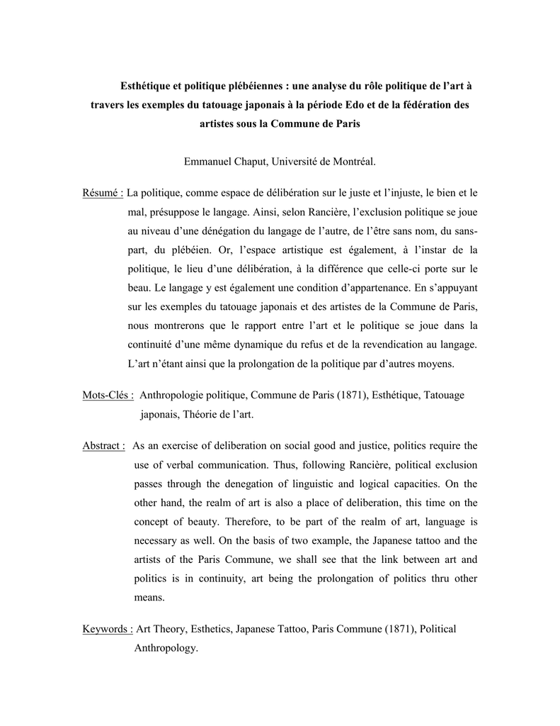 Esthétique et politique plébéiennes : une analyse du rôle politique de l’art à travers les exemples du tatouage japonais à la période Edo et de la fédération des artistes sous la Commune de Paris Emmanuel Chaput, Université de Montréal. Résumé : La politique, comme espace de délibération sur le juste et l’injuste, le bien et le mal, présuppose le langage. Ainsi, selon Rancière, l’exclusion politique se joue au niveau d’une dénégation du langage de l’autre, de l’être sans nom, du sanspart, du plébéien. Or, l’espace artistique est également, à l’instar de la politique, le lieu d’une délibération, à la différence que celle-ci porte sur le beau. Le langage y est également une condition d’appartenance. En s’appuyant sur les exemples du tatouage japonais et des artistes de la Commune de Paris, nous montrerons que le rapport entre l’art et le politique se joue dans la continuité d’une même dynamique du refus et de la revendication au langage. L’art n’étant ainsi que la prolongation de la politique par d’autres moyens. Mots-Clés : Anthropologie politique, Commune de Paris (1871), Esthétique, Tatouage japonais, Théorie de l’art. Abstract : As an exercise of deliberation on social good and justice, politics require the use of verbal communication. Thus, following Rancière, political exclusion passes through the denegation of linguistic and logical capacities. On the other hand, the realm of art is also a place of deliberation, this time on the concept of beauty. Therefore, to be part of the realm of art, language is necessary as well. On the basis of two example, the Japanese tattoo and the artists of the Paris Commune, we shall see that the link between art and politics is in continuity, art being the prolongation of politics thru other means. Keywords : Art Theory, Esthetics, Japanese Tattoo, Paris Commune (1871), Political Anthropology. Introduction Lors de notre communication Le Tatouage japonais à l’ère Edo : Enquête sur une esthétique politique présentée à l’occasion de Philopolis 2012, nous avions amorcé une réflexion, à partir du tatouage comme signe identitaire plébéien, sur le rapport entre certaines pratiques artistiques et leur fonction politique. L’exemple de la plèbe japonaise nous avait permis d’aborder le rapport entre l’inscription symbolique et la reconnaissance politique. En effet, suivant la pensée de Rancière, la participation à la sphère politique présuppose une capacité langagière nécessaire à la délibération qui s’y joue. À cet effet, l’exclusion politique se manifeste en termes de dénégation de la capacité linguistique. Nous avions donc analysé le tatouage, en tant que pratique symbolique, comme esquisse d’un proto-langage plébéien, incarnation d’une voix plébéienne. Cette réflexion sur le tatouage japonais à l’ère Edo a ouvert de multiples pistes de réflexions, tant au sujet de la constitution de l’identité que sur le rapport entre politique et symbolique. Dans le présent article, nous explorerons de manière plus approfondie l’une de ces pistes esquissées lors de notre présentation à Philopolis 2012 : les rapports entre l’art, l’esthétique et la politique. Doit-on y voir des sphères autonomes et indépendantes, ou au contraire un ensemble de dispositifs complémentaires? Pour exemplifier nos réflexions, nous reprendrons brièvement l’exemple du tatouage japonais traditionnel, mais aussi l’exemple des artistes sous la Commune de Paris. Ces exemples nous permettrons de souligner deux dynamiques distinctes du lien entre art et politique selon une approche que nous qualifierions de rancièrienne. Quel(s) rapport(s) existe-t-il entre art, esthétique et politique? Jacques Rancière pose l’esthétique à la base même du politique1, tout en précisant qu’il ne s’agit pas d’une « esthétisation de la politique » : « Cette esthétique n’est pas à entendre au sens d’une saisie perverse de la politique par une volonté d’art, par la pensée du peuple comme œuvre d’art » [Rancière, 2009 : 13]. Le rapport esthético-politique se situe ainsi en-deçà de la représentation artistique, au niveau de la sensibilité. Il faut ainsi entendre l’utilisation du terme « esthétique » en son sens premier, comme théorie du sensible. Rancière précise : « la politique porte sur ce qu’on voit et ce qu’on peut dire, sur qui a la compétence pour voir et la qualité pour dire, sur les propriétés des espaces et les possibles du temps » [Rancière, Op.cit. : 14]. Elle relève par conséquent de l’expérience sensible, en un mot de l’esthétique. Il en va de même pour l’art qui s’appuie également sur le sensible, la vue, l’ouïe, l’odorat, le tactile, etc. On peut ainsi affirmer que l’art autant que la politique relèvent de l’expérience sensible et par là de l’esthétique. Toutefois, ce qui nous permet de réunir sous un même plan – esthétique – l’art et la politique ne nous en dit pas plus sur leur lien réciproque. Au-delà de leur appartenance au sensible et à l’esthétique quels sont les rapports entre la politique et l’art? À la rigueur, il se pourrait que de tels rapports soient totalement inexistants. Ceux qui adopteraient un tel point de vue se justifieraient en montrant que l’art et la politique sont deux activités parallèles sinon rivales. Chacune revendique son autotélisme et son autonomie, leurs buts et règles n’émanant que d’eux-mêmes. Autant l’art que la politique seraient des activités totalisantes qui ne sauraient souffrir d’aucune rivalité. Se consacrer à l’art ou à la politique est l’affaire d’une vie. Les deux sont ainsi des chemins de vie que l’on ne peut emprunter en un même temps. Dans cette perspective, l’artiste dira comme le jeune Émile Zola : « Mon art, à moi, (…) est une négation de la société, une affirmation de l’in