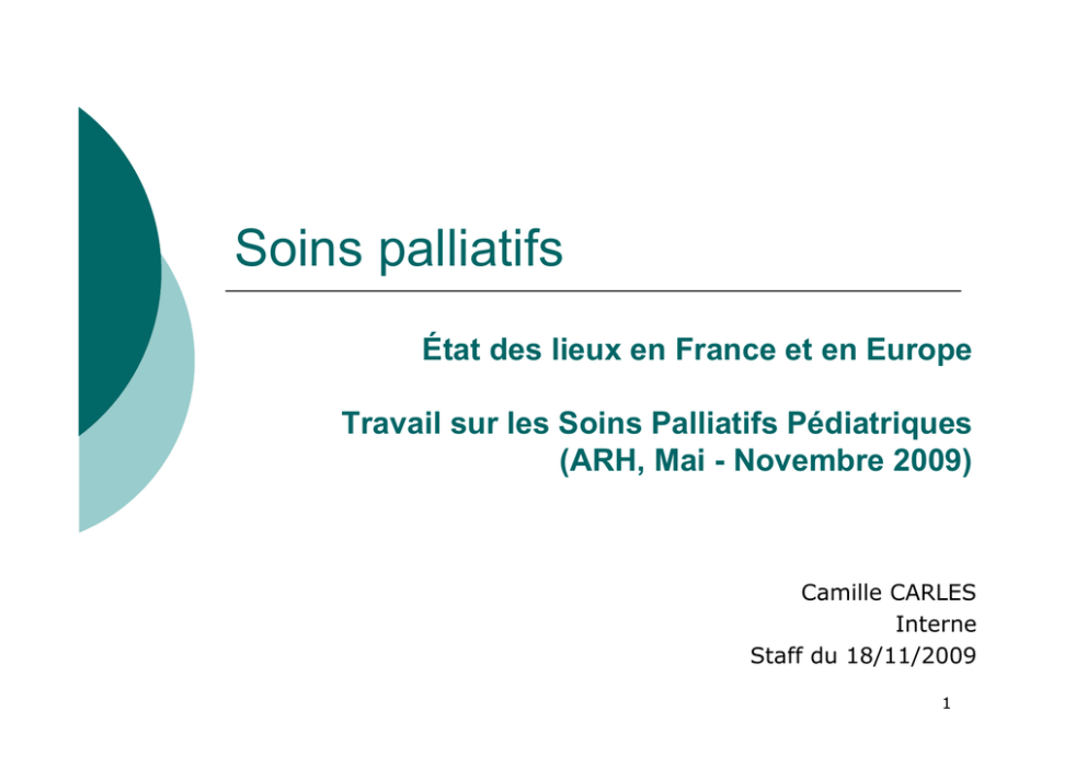 Soins palliatifs État des lieux en France et en Europe Travail sur les Soins Palliatifs Pédiatriques (ARH, Mai - Novembre 2009) Camille CARLES Interne Staff du 18/11/2009 1 Introduction Les soins palliatifs sont actuellement une préoccupation importante des pays européens au vu de l’augmentation de l’âge populationnel et de l’incidence des maladies chroniques (cancers ou non cancers) Les moyens mis en place actuellement en France sont insuffisants pour une prise en charge optimale des patients nécessitant ces soins et pour un meilleur confort possible dans ces moments difficiles. 2 Définition des soins palliatifs en France Selon le ministère de la Santé : (1) Les soins palliatifs constituent tout ce qu’il y a à faire et à " être ", professionnellement et humainement, auprès d’une personne dont la maladie qui ne peut être guérie ou stabilisée l’emportera prochainement, ainsi qu’auprès de ses proches. Pour ces derniers temps de la vie sont recherchés l’apaisement et la qualité de vie. 3 Mesures d’amélioration en cours en France Plans d’action du Ministère de la Santé : Plan 2002- 2005 de développement des Soins Palliatifs (1) Plan 2007-2011 pour l’amélioration de la qualité de vie pour les personnes atteintes de maladies chroniques(2) Plan 2006-2010 de lutte contre la douleur (3) Recommandations de l’HAS : Modalités de prise en charge de l’adulte nécessitant des soins palliatifs. Décembre 2002 (4) L’accompagnement des personnes en fin de vie et de leurs proches. Conférence de consensus, janvier 2004 (5) 4 Plan 2002- 2005 de développement des Soins Palliatifs (1) Contexte : Souhait de 63 % des français : mourir à domicile Réalité : 25% de la population. Mission de tout établissement de santé de soulager les patients. Sous estimation de la réalité par PMSI. Soins palliatifs méconnus, vus comme « mouroirs » Confusion avec « euthanasie », « arrêt des traitements » Médecine considérée comme curative et pas comme prévention quaternaire. 5 Plan 2002- 2005 de développement des Soins Palliatifs (1) Ce plan comporte trois axes : Axe 1 : développer les soins palliatifs et l’accompagnement à domicile ou dans le lieu de vie habituel Axe 2 : poursuivre le développement des soins palliatifs dans les établissements de santé Axe 3 : sensibiliser et informer l’ensemble du corps social 6 Plan 2002- 2005 de développement des Soins Palliatifs (1) Axe 1, Objectifs : développer les soins palliatifs et l’accompagnement à domicile ou dans le lieu de vie habituel Développer prise en compte de la douleur et souffrance du patient à domicile et ses proches Soutenir professionnels et bénévoles intervenant à domicile et former spécifiquement les professionnels de santé Développer l’HAD pour soins palliatifs Constitution de réseaux locaux ville-hôpital 7 Plan 2002- 2005 de développement des Soins Palliatifs (1) Axe 2, objectifs :poursuivre le développement des soins palliatifs dans les établissements de santé Augmenter offre hospitalière en soins palliatifs, renforcer les structures qui en ont besoin et améliorer la répartition Diffuser l’esprit des soins palliatifs dans tous les établissements de soins Organiser liens et relais dans les services, entre les services et avec médecine de ville 8 Plan 2002- 2005 de développement des Soins Palliatifs (1) Axe 3, objectifs : sensibiliser et informer ensemble du corps social. Médecine ne s’arrête pas avec diagnostic d’incurabilité ou de fin de vie Clarifier la connaissance des termes concernant les fins de vie Encourager l’engagement bénévole des citoyens dans l’accompagnement Renseigner professionnels et public sur les offres existantes (institutions et domicile) 9 Plan 2007-2011 Qualité de vie chez les patients atteints de maladies chroniques (2) Contexte : 20% de la population française (15 millions) Définition de maladie chronique : Cause organique, psychologique ou cognitive, Ancienne de plusieurs mois, évolutive, Retentissant sur vie quotidienne et menace de complications graves Priorité OMS 10 Plan 2007-2011 Qualité de vie chez les patients atteints de maladies chroniques (2) O Maladies prises en compte : diabète, PR, épilepsie, Parkinson, Cancer, Alzheimer, SIDA, IRC,BPCO, asthme, psychose, SEP, Crohn, RCH, maladies rares (drépanocytose, SLA, Mucoviscidose, myopathies) … 4 axes d’amélioration : Axe Axe Axe Axe 1 2 3 4 : : : : mieux connaître sa maladie pour mieux la gérer élargir la médecine de soins à la prévention faciliter la vie quotidienne des malades mieux connaître les besoins de cette population 11 Plan 2007-2011 Qualité de vie chez les patients atteints de maladies chroniques (2) Axe 1 : mieux connaître sa maladie pour mieux la gérer Diffuser auprès des patients des cartes individuelles d’informations et de conseils Créer un portail internet sur les maladies chroniques ouvert au public Impliquer les patients et associations dans l’élaboration des programmes d’information, éducation, accompagnement et la rédaction des recommandations de bonnes pratiques 12 Plan 2007-2011 Qualité de vie chez les patients atteints de maladies chroniques (2) Axe 2 : élargir la médecine de soins à la prévention Former médecins et soignants à l’éducation thérapeutique et sensibiliser les acteurs sociaux Financement spécifique de l’activité d’éducation du patient Mettre des outils d’éducation thérapeutique au service des médecins traitants Développer de nouveaux métiers et modifier les décrets de compétence dans le domaine de prévention et prise en charge 13 Plan 2007-2011 Qualité de vie chez les patients atteints de maladies chroniques (2) Axe 3 : faciliter la vie quotidienne des malades Développer accompagnement personnalisé Augmenter possibilités de prise en charge à domicile Axe 4 : mieux connaître les besoins de cette population Analyser et consolider les données épidémiologiques p