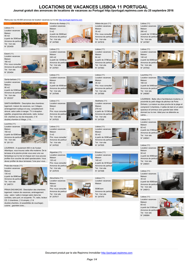 LOCATIONS DE VACANCES LISBOA 11 PORTUGAL Journal gratuit des annonces de locations de vacances au Portugal http://portugal.repimmo.com du 25 septembre 2016 Retrouvez nos 40.000 annonces de location vacances sur le site http://portugal.repimmo.com LOCATIONS VACANCES VILLA 11 Lisboa (11) Location vacances Maison 55 m2 à partir de 350€/sem Annonce de particulier Tel : Voir site N° 253459 Estoril (11) Location vacances Maison 180 m2 Prix: nous consulter Annonce de particulier Tel : Voir site N° 253454 Santa-barbara (11) Location vacances Maison 90 m2 à partir de 535€/sem Annonce de particulier Tel : Voir site N° 253337 SANTA-BARBARA : Description des chambres: logement. maison de vacances, sur 2 étages , aménagement rustique et cosy. complètement rénové. salon.salle à manger. TV à réception satellite, programmes allemands, radio, lecteur CD. chambre au rez-de-chaussée, (1 lit double).chambre à l'étage, (1 lit... Lourinha (11) Location vacances Maison 150 m2 à partir de 835€/sem Annonce de particulier Tel : Voir site N° 251151 LOURINHA : A seulement 400 m de l'océan Atlantique, vous trouvez cette villa moderne. De la terrasse et la piscine privée vous avez une vue fantastique sur la mer et chaque soir vous pouvez profiter d'un coucher de soleil spectaculaire. Vous devez profiter de deux terrasses: l'une pour vous... Praia-das-macas (11) Location vacances Maison 135 m2 à partir de 899€/sem Annonce de particulier Tel : Voir site N° 248731 PRAIA-DAS-MACAS : Description des chambres: logement. maison de vacances, aménagement cosy . salon / salle à manger.salon dans les combles, sans port, en soupente. TV, radio, lecteur CD. 2 chambres, (1 lit simple), (1 lit double).chambre, (2 possibilités de couchage). cuisine , gazinière avec... Alverca-do-ribatejo (11) Location vacances Maison 5 m2 à partir de 392€/sem Annonce de particulier Tel : Voir site N° 247682 Aldeia-de-juzo (11) Location vacances Maison 35 m2 Prix: nous consulter Annonce de particulier Tel : Voir site N° 247616 Lisboa (11) Location vacances Maison 280 m2 à partir de 1218€/sem Annonce de particulier Tel : Voir site N° 247067 Lisboa (11) Location vacances Maison 240 m2 à partir de 1204€/sem Annonce de particulier Tel : Voir site N° 247651 Lisboa (11) Location vacances Maison 64 m2 à partir de 375€/sem Annonce de particulier Tel : Voir site N° 247583 Lisboa (11) Location vacances Maison 140 m2 à partir de 600€/sem Annonce de particulier Tel : Voir site N° 247042 Lisboa (11) Location vacances Maison 60 m2 à partir de 450€/sem Annonce de particulier Tel : Voir site N° 247648 Lisboa (11) Location vacances Maison 35 m2 Prix: nous consulter Annonce de particulier Tel : Voir site N° 247569 Lourinha (11) Location vacances Maison 160 m2 à partir de 545€/sem Annonce de particulier Tel : Voir site N° 246987 Lisboa (11) Location vacances Maison 5 m2 Prix: nous consulter Annonce de particulier Tel : Voir site N° 247633 Abelheira (11) Location vacances Maison 270 m2 à partir de 1015€/sem Annonce de particulier Tel : Voir site N° 247526 Lisboa (11) Location vacances Maison 5 m2 Prix: nous consulter Annonce de particulier Tel : Voir site N° 247632 Lisboa (11) Location vacances Maison 50 m2 à partir de 300€/sem Annonce de particulier Tel : Voir site N° 247505 Algueirao (11) Location vacances Maison 120 m2 Prix: nous consulter Annonce de particulier Tel : Voir site N° 247618 Ericeira (11) Location vacances Maison 140 m2 à partir de 301€/sem Annonce de particulier Tel : Voir site N° 247498 Abrunheira (11) Location vacances Maison 150 m2 Prix: nous consulter Annonce de particulier Tel : Voir site N° 247617 Lisboa (11) Location vacances Maison 550€/sem Annonce de particulier Tel : Voir site N° 247470 Document produit par le site Repimmo Immobilier http://portugal.repimmo.com Page 1/4 LOURINHA : Belle villa à l'architecture moderne, à proximité du petit village de pêcheur de Porto Dinheiro. La maison se situe proche de la plage et comprend 3 chambres, 2 salles de bain et un salon spacieux et lumineux avec grande baie vitrée donnant sur la mer. Idéal pour se détendre au calme.... Lisboa (11) Location vacances Maison 82 m2 à partir de 210€/sem Annonce de particulier Tel : Voir site N° 246941 Lisboa (11) Location vacances Maison 50 m2 à partir de 405€/sem Annonce de particulier Tel : Voir site N° 246931 Lisboa (11) Location vacances Maison 35 m2 à partir de 450€/sem Annonce de particulier Tel : Voir site N° 246913 Lisboa (11) Location vacances Maison 60 m2 à partir de 510€/sem Annonce de particulier Tel : Voir site N° 246884 LOCATIONS DE VACANCES LISBOA 11 PORTUGAL Journal gratuit des annonces de locations de vacances au Portugal http://portugal.repimmo.com du 25 septembre 2016 Alges (11) Location vacances Maison 5 m2 à partir de 510€/sem Annonce de particulier Tel : Voir site N° 246883 Sintra (11) Location vacances Maison Caxias (11) Location vacances Maison 150 m2 Prix: nous consulter Annonce de particulier Tel : Voir site N° 246751 Santa-cruz (11) Location vacances Maison 250 m2 à partir de 875€/sem Annonce de particulier Tel : Voir site N° 246175 Sintra (11) Location vacances Maison 80 m2 à partir de 630€/sem Annonce de particulier Tel : Voir site N° 246700 Aboboda (11) Location vacances Maison à partir de 140€/sem Annonce de particulier Tel : Voir site N° 246660 Pego-longo (11) Location vacances Maison à partir de 1990€/sem Annonce de particulier Tel : Voir site N° 246642 Cascais (11) Location vacances Maison à partir de 1005€/sem Annonce de particulier Tel : Voir site N° 246305 Sintra (11) Location vacances Maison 200 m2 à partir de 1560€/sem Annonce de particulier Tel : Voir site N° 246301 Lourinha (11) Location vacances Maison 200 m2 à partir de 1330€/sem Annonce de particulier Tel : Voir site N° 246053 à partir de 735€/sem Annonce de particulier Tel : Voir site N° 246199 LOURINHA : Belle villa de vacances sur 2 