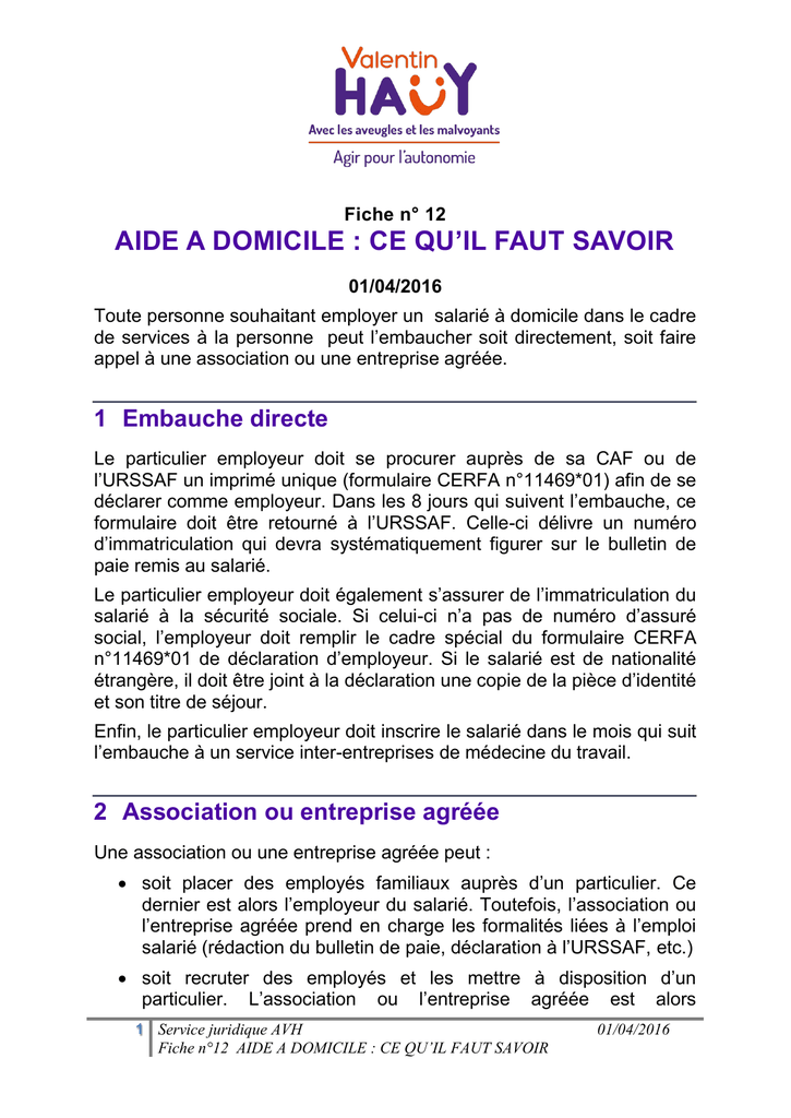 Fiche n° 12 AIDE A DOMICILE : CE QU’IL FAUT SAVOIR 01/04/2016 Toute personne souhaitant employer un salarié à domicile dans le cadre de services à la personne peut l’embaucher soit directement, soit faire appel à une association ou une entreprise agréée. 1 Embauche directe Le particulier employeur doit se procurer auprès de sa CAF ou de l’URSSAF un imprimé unique (formulaire CERFA n°11469*01) afin de se déclarer comme employeur. Dans les 8 jours qui suivent l’embauche, ce formulaire doit être retourné à l’URSSAF. Celle-ci délivre un numéro d’immatriculation qui devra systématiquement figurer sur le bulletin de paie remis au salarié. Le particulier employeur doit également s’assurer de l’immatriculation du salarié à la sécurité sociale. Si celui-ci n’a pas de numéro d’assuré social, l’employeur doit remplir le cadre spécial du formulaire CERFA n°11469*01 de déclaration d’employeur. Si le salarié est de nationalité étrangère, il doit être joint à la déclaration une copie de la pièce d’identité et son titre de séjour. Enfin, le particulier employeur doit inscrire le salarié dans le mois qui suit l’embauche à un service inter-entreprises de médecine du travail. 2 Association ou entreprise agréée Une association ou une entreprise agréée peut : soit placer des employés familiaux auprès d’un particulier. Ce dernier est alors l’employeur du salarié. Toutefois, l’association ou l’entreprise agréée prend en charge les formalités liées à l’emploi salarié (rédaction du bulletin de paie, déclaration à l’URSSAF, etc.) soit recruter des employés et les mettre à disposition d’un particulier. L’association ou l’entreprise agréée est alors 1 Service juridique AVH Fiche n°12 AIDE A DOMICILE : CE QU’IL FAUT SAVOIR 01/04/2016 l’employeur de l’employé, et le particulier le client de cette association ou de cette entreprise : il règle la prestation sur présentation de la facture établie par le prestataire. 3 La conclusion du contrat de travail Dans l’hypothèse où le particulier est l’employeur, il doit obligatoirement rédiger un contrat de travail (CDD, CDI, à temps plein ou à temps partiel). Le contrat doit notamment mentionner la nature du travail à accomplir, la durée et les horaires de travail, la qualification du salarié. Il est signé par l’employeur et le salarié. Un exemplaire est remis à ce dernier. L’employeur doit respecter la Convention collective nationale des salariés du particulier employeur (n°3180) et les dispositions du Code du travail. Ainsi, pour mettre fin au contrat de travail l’employeur est tenu d’observer la procédure en vigueur en matière de licenciement, de démission ou de départ à la retraite du salarié. Son non-respect est susceptible d’entraîner des poursuites devant le Conseil des Prud’hommes. C’est pourquoi, il est recommandé de se rapprocher d’un conseil juridique spécialisé en droit social qui vous renseignera sur les démarches à suivre. 4 Chèque emploi service universel (CESU) L’employeur peut recourir au CESU pour rémunérer son salarié. Il est financé en tout ou partie par une entreprise, un comité d’entreprise, une mutuelle, une caisse de retraite, une collectivité territoriale… Il ne peut être utilisé qu’avec l’accord du salarié, après information de ce dernier sur le fonctionnement du dispositif. Avec le CESU, l’employeur est dispensé de déclaration préalable à l’embauche du salarié. Le volet social adressé au Centre national du Chèque emploi service universel tient lieu de déclaration d'embauche. 2 Service juridique AVH Fiche n°12 AIDE A DOMICILE : CE QU’IL FAUT SAVOIR 01/04/2016 Le Cncesu effectue le calcul et le prélèvement des cotisations et adresse une attestation d'emploi au salarié qui dispense l'employeur d'établir une fiche de paie. De plus l’employeur bénéficie de l’exonération des cotisations patronales de sécurité sociale, sous réserve de remplir certaines conditions d’âge et de bénéficier de certaines prestations sociales (carte d’invalidité 80%, PCH, pension d’invalidité avec MTP, complément AEEH…) L’employeur peut ainsi régler le salaire de son employé ou la facture de l'entreprise de services à la personne qui intervient à son domicile avec ses titres et compléter si nécessaire avec tout moyen de paiement. En revanche, hormis le cas des prestations de travail occasionnelles dont la durée hebdomadaire n’excède pas 8 heures ou d’une durée dans l’année d’un mois non renouvelable, le CESU ne dispense pas l’employeur de rédiger un contrat de travail et de respecter la Convention collective nationale des salariés du particulier employeur (n°3180) et les dispositions du Code du travail. 5 Réduction d’impôt ou crédit d’impôt Bénéficient d’un crédit d’impôt : les contribuables célibataires, veufs ou divorcés qui exercent une activité professionnelle ou qui sont inscrits sur la liste des demandeurs d’emploi durant trois mois au moins au cours de l’année du paiement des dépenses ; les personnes mariées ou ayant conclu un PACS, soumise à une imposition commune, qui toutes deux satisfont à l’une ou l’autre des conditions posées ci-dessus (exercer une activité professionnelle ou être inscrit sur la liste de demandeurs d’emploi) Bénéficient d’une réduction d’impôt : les personnes autres que celles bénéficiant du crédit d’impôt (retraités et demandeurs d’emploi non demandeurs durant trois mois au moins au cours de l’année de paiement des dépenses) ; 3 Service juridique AVH Fiche n°12 AIDE A DOMICILE : CE QU’IL FAUT SAVOIR 01/04/2016 les personnes susceptibles de bénéficier du crédit d’impôt mais qui on supporté des dépenses au domicile d’un ascendant et non au leur. L’avantage fiscal est égal à 50% du montant des dépenses effectivement supportées (so