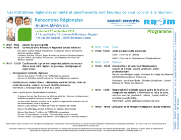 Les institutions régionales en santé et sanofi-aventis sont heureux de vous convier à la réunion : Programme Le Samedi 17 septembre 2011 À l’ Amphithéâtre 12 - Université Bordeaux Segalen 146, rue léo Saignat - 33076 Bordeaux Cedex 8h30 – 9h00 9h00 – 9h15 Accueil des participants Ouverture de la Rencontre Régionale Jeunes Médecins Mme Sabine Guilhon-Penaud, Présidente du Syndicat des Internes de Médecine Générale Aquitaine (SIMGA) Professeur Jean-Luc Pellegrin, Doyen de médecine, Université Bordeaux Segalen Docteur Frédéric Laurentjoye, Président du Conseil Régional de l’Ordre des Médecins Aquitaine 9h15 – 12h30 Conditions de la prise en charge des patients en secteur libéral dans votre région : en pratique, témoignages et expériences • Démographie médicale régionale 10h45 – 11h00 Pause 11h00 –12h30 (suite en deux salles simultané) Salle 1 : Exercice en Cabinet Salle 2 : Exercice en établissement d’hospitalisation 12h30 – 13h30 13h30 – 13h45 Introduction : Structures professionnelles Conseil de l’ordre, Unions syndicales, Union professionnelle Docteur Jean-Philippe Joseph Président du Collège des Médecins Généralistes Enseignants d’Aquitaine Docteur Dany Guérin, Présidente de l’URPS Médecins Aquitaine Docteur Eric Frétillère, Conseil Régional de l’Ordre Régional des médecins Professeur Jean-Claude Baste - Chambre disciplinaire – Conseil Régional de l’Ordre des Médecins - • Installation en secteur libéral : démarches administratives, choix du mode d'exercice, maisons de santé pluridisciplinaires… Intervenant : Juriste spécialisé en droit de la santé Avec la participation des Modérateurs suivants : Professeur Bernard Gay, Professeur de Médecine générale - Directeur du Département de Médecine générale Université Bordeaux Segalen Docteur Olivier Jourdain, Président de la conférence régionale des présidents de CME des établissements privés d’Aquitaine. Docteur Claude Boisseau Président de l'Ordre des Médecins de Gironde Docteur Pascal Barbeau, Conseil de l’Ordre des Médecins de la Gironde Déjeuner 13h45 - 16h00 Responsabilité médicale dans le cadre de la prise en charge de vos patients : information et refus de soins, relations avec les proches du patient, dossier médical, procédures applicables… Intervenant : Juriste spécialisé en droit de la santé 16h00 – 16h15 Conclusion de la Rencontre Régionale Jeunes Médecins Docteur Dany Guérin, Présidente de l’URPS Médecins Aquitaine Docteur Christian Glédine, Conseil de l’Ordre des Médecins de la Gironde Docteur Frédéric Laurentjoye, Président du Conseil régional de l’Ordre des médecins Cette invitation valant convention sera, avant sa mise en application, transmise par sanofi-aventis France au Conseil de l'Ordre compétent, conformément aux dispositions de l'article L 4113-6 du Code de la santé publique et du décret d'application du 25 mars 2007. Les fichiers utilisés pour vous communiquer le présent document et le cas échéant pour recueillir des informations vous concernant, sont déclarés auprès de la CNIL. Vous disposez d'un droit d'accès, de rectification et d'opposition, sur les données vous concernant auprès de la Direction Qualité de sanofi-aventis France – 9, boulevard Romain Rolland – 75159 Paris cedex 14. 245852 – 06/2010 Sanofi-aventis France - S.A. au capital de 62 537 664 euros – 1-13, boulevard Romain Rolland – 75014 Paris Rencontres Régionales Jeunes Médecins Rencontres Régionales Jeunes Médecins Carton réponse À retourner avant le : 9 septembre 2011 Nom : Prénom : Spécialité : médecin généraliste autre : précisez Adresses professionnelle : Adresse personnelle (à indiquer obligatoirement si vous êtes interne ou remplaçant) : Code postal : Ville : Téléphone : Fax : E-mail : Vous êtes : interne chef de clinique médecin généraliste remplaçant assistant autre : Inscrit à l'Ordre : n° Assistera N'assistera pas 245852 – 06/2010 Sanofi-aventis France - S.A. au capital de 62 537 664 euros – 1-13, boulevard Romain Rolland – 75014 Paris Le Samedi 17 septembre 2011 À l’ Amphithéâtre 12 - Université Bordeaux Segalen 146, rue léo Saignat - 33076 Bordeaux Cedex Cyril VINCENT 26, allée Saint Exupéry 33160 Saint-Aubin de Médoc