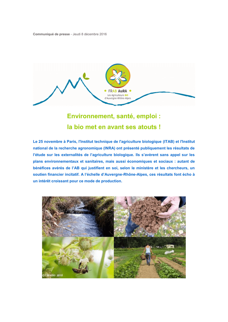 Communiqué de presse - Jeudi 8 décembre 2016 Environnement, santé, emploi : la bio met en avant ses atouts ! Le 25 novembre à Paris, l'Institut technique de l'agriculture biologique (ITAB) et l'Institut national de la recherche agronomique (INRA) ont présenté publiquement les résultats de l’étude sur les externalités de l’agriculture biologique. Ils s’avèrent sans appel sur les plans environnementaux et sanitaires, mais aussi économiques et sociaux : autant de bénéfices avérés de l’AB qui justifient en soi, selon le ministère et les chercheurs, un soutien financier incitatif. A l’échelle d’Auvergne-Rhône-Alpes, ces résultats font écho à un intérêt croissant pour ce mode de production. Agriculture biologique : des externalités positives enfin démontrées Commandée en 2015 par le ministre Stéphane Le Foll, l'étude "Quantifier et chiffrer économiquement les externalités de l'AB ?" a recensé 300 publications scientifiques internationales dans le but de comparer les impacts du mode de production biologique. Biodiversité, qualité des eaux et de l'air, climat, fertilité des sols… les résultats sont sans appel sur le plan environnemental, avec 31 contributions positives sur 40 critères évalués. En matière de santé humaine, l’externalité positive de la bio s’avère également évidente du fait de la nonutilisation des pesticides de synthèse. Et sur le volet socio-économique, la bio se démarque de l’agriculture conventionnelle avec une performance positive notamment en termes d'emploi. Face à ces résultats, chercheurs et pouvoirs publics se sont accordés sur le fait que la bio justifiait un soutien financier incitatif. Une rémunération nécessaire des services rendus par la bio A l’heure où l’enveloppe budgétaire prévue pour les aides à la bio 2015-2020 s’avère clairement insuffisante, des décisions doivent être prises pour continuer à soutenir ce mode de production porteur d’avenir. Pour les agriculteurs bio du réseau FNAB (Fédération nationale de l'agriculture biologique), la question se pose aujourd’hui d’une réelle rémunération des services publics rendus par les fermes bio, via la politique agricole commune (PAC). Il est temps que l'argent des contribuables puisse contribuer à rémunérer une partie des services environnementaux et sociaux de cette agriculture d'avenir, services qui bénéficient à tous, plutôt que d’entretenir ou de maintenir sous perfusion des systèmes agricoles conventionnels polluants et à bout de souffle. En Auvergne-Rhône-Alpes : un intérêt pour l'AB toujours croissant sur le terrain Producteurs et éleveurs n’ont pas attendu les preuves scientifiques pour franchir le pas vers l’agriculture biologique. Depuis janvier 2016, environ 720 nouveaux producteurs bio ont été dénombrés en Auvergne-Rhône-Alpes, portant le total à près de 5000 fermes bio dans la région. Les indicateurs pour la suite restent également au beau fixe, comme le montre le récent succès de la Quinzaine de la bio en Rhône-Alpes, événement professionnel porté par le réseau des producteurs bio, l’Atelier Paysan, Coop de France et la FRCUMA. Près de 700 professionnels et porteurs de projet étaient rassemblés cette année à travers 27 portes ouvertes (+40% de fréquentation par rapport à 2015, majoritairement des jeunes en formation et des candidats à l’installation). Plus d'info : Télécharger la synthèse de l'étude "Quantifier et chiffrer économiquement les externalités de l'AB?", ITAB, INRA, novembre 2016, 20 pages Télécharger le rapport complet (140 pages) www.corabio.org La FRAB AuRA est la fédération régionale de l’agriculture biologique en Auvergne-Rhône-Alpes, cette association loi 1901 a été créée en 2016, issue des deux anciennes entités régionales : Corabio pour RhôneAlpes et le GRAB Auvergne pour l'Auvergne. Elle fédère 8 groupements d’agriculteurs bio départementaux : Agribiodrôme, Agri Bio Ardèche, ARDAB (Rhône et Loire), ADABio (Ain, Isère, Savoie, Haute-Savoie), Bio63 (Puy-de-Dôme), Haute-Loire Biologique, Bio15 (Cantal) et Allier Bio. La FRAB AuRA est membre du réseau FNAB (Fédération nationale de l’agriculture biologique) et œuvre au développement de l’agriculture biologique, en lien avec les instances politiques locales, régionales, nationales et européennes. www.corabio.org --------------------------------------CONTACT MEDIAS : FRAB AuRA - Claire Lecouteux [email protected] - T. 04 75 61 19 36 CORABIO - INEED Rovaltain TGV, BP 11150 ALIXAN - 26 958 VALENCE Cedex 9