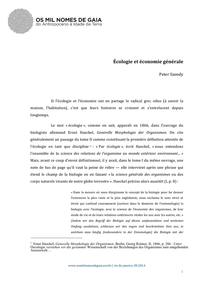 Écologie et économie générale Peter Szendy Si l’écologie et l’économie ont en partage le radical grec oikos (à savoir la maison, l’habitation), c’est que leurs histoires se croisent et s’entrelacent depuis longtemps. Le mot « écologie », comme on sait, apparaît en 1866, dans l’ouvrage du biologiste allemand Ernst Haeckel, Generelle Morphologie der Organismen. On cite généralement un passage du tome II comme constituant la première définition attestée de l’écologie en tant que discipline 1 : « Par écologie », écrit Haeckel, « nous entendons l’ensemble de la science des relations de l’organisme au monde extérieur environnant… » Mais, avant ce coup d’envoi définitionnel, il y avait, dans le tome I du même ouvrage, une note de bas de page qu’il vaut la peine de relire — elle intervient après une phrase qui étend le champ de la biologie en en faisant « la science générale des organismes ou des corps naturels vivants de notre globe terrestre ». Haeckel précise alors aussitôt (I, p. 8) : « Dans la mesure où nous élargissons le concept de la biologie pour lui donner l’extension la plus vaste et la plus englobante, nous excluons le sens strict et étroit qui confond couramment (surtout dans le domaine de l’entomologie) la biologie avec l’écologie, avec la science de l’économie des organismes, de leur mode de vie et de leurs relations extérieures vitales les uns avec les autres, etc. » (Indem wir den Begriff der Biologie auf diesen umfassendsten und weitesten Umfang ausdehnen, schliessen wir den engen und beschränkten Sinn aus, in welchem man häufig (insbesondere in der Entomologie) die Biologie mit der 1 . Ernst Haeckel, Generelle Morphologie der Organismen, Berlin, Georg Reimer, II, 1866, p. 286 : Unter Oecologie verstehen wir die gesammte Wissenschaft von der Beziehungen des Organismus zum umgebenden Aussenwelt… www.osmilnomesdegaia.eco.br | rio de janeiro, 09.2014 1 Oecologie verwechselt, mit der Wissenschaft von der Oeconomie, von der Lebensweise, von den äusseren Lebensbeziehungen der Organismen zu einander etc.) L’écologie, selon cette toute première occurrence du mot, serait donc synonyme d’économie : elle serait un discours de type économique sur les rapports des organismes vivants entre eux, un peu à l’image, sans doute, de ce que Carl von Linné, plus d’un siècle auparavant, avait appelé l’oeconomia naturae 2. Certes, avant de pouvoir affirmer que l’écologie est d’essence économique, il faudrait avoir éclairci ce qu’économie veut dire sous la plume de Haeckel, en 1866. Il faudrait donc suivre les méandres de la généalogie de ce que Giorgio Agamben a pu décrire comme un « paradigme théologico-‐économique », qu’il oppose à celui de la « théologie politique ». Du terme grec d’oikonomia tel qu’il était utilisé dans la patristique chrétienne jusqu’à ce qu’on a commencé à appeler, au XVIIe siècle, « l’économie animale », il y a en effet des détours et des bifurcations sémantiques qu’il m’est impossible de retracer ici. Ce que je voudrais simplement retenir pour l’instant, à titre d’hypothèse préliminaire, c’est que l’acte de naissance de l’écologie s’inscrit dans une histoire lexicale qui a également pu engendrer une expression comme celle que l’on trouve sous la plume de Herder, en 1772, dans son Traité sur l’origine du langage : celui-‐ci, pour expliquer l’apparition des langues chez l’homme, parle en effet d’une « économie animale générale » (allgemeine tierische Ökonomie), c’est-‐à-‐dire d’une « économie domestique » (Haushaltung) élargie aux dimensions de la nature ou de l’espèce humaine 3. 2. On considère généralement que, conformément à la tradition universitaire de l’époque en Suède, Linné lui-‐ même est l’auteur de la thèse intitulée Oeconomia naturae, soutenue sous sa direction par un certain Isaac Biberg et publiée en 1749. Cf. l’introduction de Camille Limoges dans C. Linné, L’Équilibre de la nature, traduction française de Bernard Jasmin, Vrin, 1972, p. 8-‐9. La première phrase de ladite thèse énonce : « Par ÉCONOMIE DE LA NATURE, on entend la très sage disposition des Choses naturelles instituée par le Souverain créateur, selon laquelle ceux-‐ci tendent à des fins communes et ont des fonctions réciproques » (per OECONOMIAM NATURAE intelligimus Summi conditoris circa Res Naturales sapientissimam dispositionem, secundum quam illae aptae sunt ad communes fines & reciprocos usus producendos). 3 . Cf. Johann Gottfried Herder, Abhandlung über den Ursprung der Sprache, Reclam, 1966, p. 24 (die Haushaltung der Natur : « l’économie domestique de la nature »), p. 25 (allgemeine tierische Ökonomie) et p. 122 (der ganzen Haushaltung des menschlichen Geschlechts : « toute l’économie domestique de l’espèce peter szendy | écologie et économie générale 2 Ce que j’aimerais interroger, c’est donc l’écologie comme économie générale, pour le dire d’un terme qui fut cher à Georges Bataille et sur lequel il nous faudra revenir longuement. Ce qui impliquera de se demander si cette généralisation du concept d’économie est un simple élargissement de son champ au-‐delà de ses limites usuelles ou si la notion même d’économie s’en trouve débordée. Bref, la question qui nous portera est celle-‐ci : l’écologie est-‐elle une économie de l’économie, a-‐t-‐elle donc pour vocation d’administrer économiquement l’économie elle-‐ même, en lui assignant par exemple des limites ou des objectifs qui relèveraient d’une sorte d’hyperéconomie à l’échelle planétaire ? Ou bien l’écologie déborde-‐t-‐elle la sphère de l’économie, l’ouvre-‐t-‐elle sur une pensée que l’on pourrait dire anéconomique, c’est-‐à-‐ dire rompant avec l’horizon d’un calcul, d’une exploitation visa
