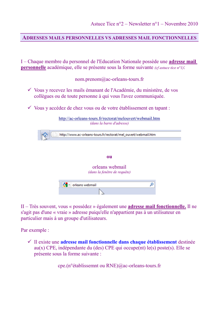 Astuce Tice n°2 – Newsletter n°1 – Novembre 2010 ADRESSES MAILS PERSONNELLES VS ADRESSES MAIL FONCTIONNELLES I – Chaque membre du personnel de l'Education Nationale possède une adresse mail personnelle académique, elle se présente sous la forme suivante (cf astuce tice n°1): [email protected] Vous y recevez les mails émanant de l'Académie, du ministère, de vos collègues ou de toute personne à qui vous l'avez communiquée. Vous y accédez de chez vous ou de votre établissement en tapant : http://ac-orleans-tours.fr/rectorat/melouvert/webmail.htm (dans la barre d'adresse) ou orleans webmail (dans la fenêtre de requête) II – Très souvent, vous « possédez » également une adresse mail fonctionnelle. Il ne s'agit pas d'une « vraie » adresse puiqu'elle n'appartient pas à un utilisateur en particulier mais à un groupe d'utilisateurs. Par exemple : Il existe une adresse mail fonctionnelle dans chaque établissement destinée au(x) CPE, indépendante du (des) CPE qui occupe(nt) le(s) poste(s). Elle se présente sous la forme suivante : cpe.(n°établissemnt ou RNE)@ac-orleans-tours.fr Astuce Tice n°2 – Newsletter n°1 – Novembre 2010 Pour accéder aux mails qui arrivent sur cette boîte, vous procédez de la même façon que précédemment mais au lieu de saisir votre e-mail académique personnel, vous saisissez votre adresse fonctionnelle : Votre mot de passe vous a été communiqué par un courrier en septembre 2009, en cas de perte s'adresser à : Il existe également une liste de diffusion qui redistribue les messages à toutes les adresses fonctionnelles (exemple : [email protected]) CPE de chaque département. Elle se présente sous la forme suivante pour le département d’Indre-et-Loire : [email protected] Il existe aussi une adresse pour écrire à l’ensemble des CPE de l’Académie : [email protected] Lorsqu'un courrier est envoyé par le biais de cette adresse il est reçu par tous les CPE du département concerné. Si vous répondez à cette même adresse, votre courrier sera également lisible par tous les CPE de cette liste de diffusion. Vous recevez les mails adressés à cette liste automatiquement dans votre boîte fonctionnelle. Pour lire les courriers qui vous sont adressés sur vos boîtes fonctionnelles, pensez aux transferts vers votre boîte mail personnelle professionnelle (mail académique), ou vers votre boîte mail personnelle (opérateur privé).Cf astuce tice n°1