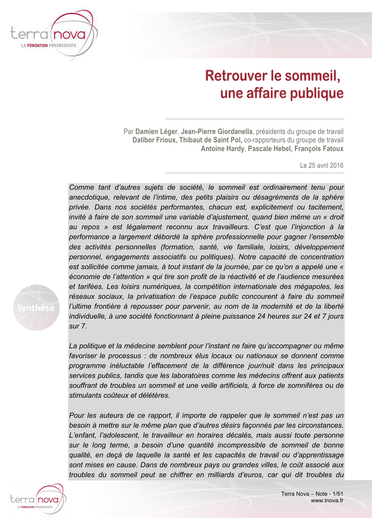 Retrouver le sommeil, une affaire publique Par Damien Léger, Jean-Pierre Giordanella, présidents du groupe de travail Dalibor Frioux, Thibaut de Saint Pol, co-rapporteurs du groupe de travail Antoine Hardy, Pascale Hebel, François Fatoux Le 25 avril 2016 Comme tant d’autres sujets de société, le sommeil est ordinairement tenu pour anecdotique, relevant de l’intime, des petits plaisirs ou désagréments de la sphère privée. Dans nos sociétés performantes, chacun est, explicitement ou tacitement, invité à faire de son sommeil une variable d’ajustement, quand bien même un « droit au repos » est légalement reconnu aux travailleurs. C’est que l’injonction à la performance a largement débordé la sphère professionnelle pour gagner l’ensemble des activités personnelles (formation, santé, vie familiale, loisirs, développement personnel, engagements associatifs ou politiques). Notre capacité de concentration est sollicitée comme jamais, à tout instant de la journée, par ce qu’on a appelé une « économie de l’attention » qui tire son profit de la réactivité et de l’audience mesurées et tarifées. Les loisirs numériques, la compétition internationale des mégapoles, les réseaux sociaux, la privatisation de l’espace public concourent à faire du sommeil l’ultime frontière à repousser pour parvenir, au nom de la modernité et de la liberté individuelle, à une société fonctionnant à pleine puissance 24 heures sur 24 et 7 jours sur 7. La politique et la médecine semblent pour l’instant ne faire qu’accompagner ou même favoriser le processus : de nombreux élus locaux ou nationaux se donnent comme programme inéluctable l’effacement de la différence jour/nuit dans les principaux services publics, tandis que les laboratoires comme les médecins offrent aux patients souffrant de troubles un sommeil et une veille artificiels, à force de somnifères ou de stimulants coûteux et délétères. Pour les auteurs de ce rapport, il importe de rappeler que le sommeil n’est pas un besoin à mettre sur le même plan que d’autres désirs façonnés par les circonstances. L’enfant, l’adolescent, le travailleur en horaires décalés, mais aussi toute personne sur le long terme, a besoin d’une quantité incompressible de sommeil de bonne qualité, en deçà de laquelle la santé et les capacités de travail ou d’apprentissage sont mises en cause. Dans de nombreux pays ou grandes villes, le coût associé aux troubles du sommeil peut se chiffrer en milliards d’euros, car qui dit troubles du Terra Nova – Note - 1/51 www.tnova.fr sommeil dit également troubles de la vigilance et de l’éveil, impliquant risques industriels, accidents du travail ou de la route, inégalités sociales accrues, risques sanitaires. Si la décision de dormir est éminemment personnelle, les conditions d’un bon sommeil sont largement conditionnées par l’environnement physique, culturel et social. Promouvoir des mesures afin de protéger le sommeil, ce n’est pas opposer la passivité à l’activité, la pureté de la nuit à l’impureté du jour, c’est surtout protéger la qualité de présence de chacun dans la société, le respect que chacun porte à autrui, la capacité à se réaliser soi-même, une forme d’égalité devant un besoin physiologique essentiel, et, au-delà d’une écologie du bien-être, le respect des équilibres écologiques fondamentaux sur notre planète. Terra Nova propose de mieux tenir compte des rythmes biologiques des enfants et écoliers en accordant plus de place au repos ; d’offrir aux personnels de santé une véritable formation aux troubles du sommeil ; de communiquer largement auprès du grand public sur l’enjeu de santé public que représente le sommeil ; de limiter l’impact du bruit et de la lumière sur le sommeil de millions de Français, notamment les plus défavorisés ; de faire du respect du sommeil et de l’anticipation des risques de fatigue un élément clé du bien-être et de l’efficacité au travail ; d’accroître l’information et la prévention concernant la somnolence au volant. Terra Nova – Note - 2/51 www.tnova.fr SOMMAIRE 1 - LE SOMMEIL EST-IL UNE POLITIQUE ? 2 - LE SOMMEIL ET SES ENJEUX 2.1 - Santé publique et sécurité • Troubles du sommeil • Consommations médicamenteuses • Somnolence et sécurité routière 2.2 - Travail de nuit • Travailler « la nuit » : une notion ambigüe • Les conséquences du travail de nuit et/ou à horaires décalés sur la santé 2.3 - Sommeil des enfants et adolescents • Le sommeil des premières années de la vie • Les adolescents en manque de sommeil 2.4 - Environnement, habitat et sommeil • Les effets du bruit • Les effets de la lumière sur le sommeil : un risque de pollution lumineuse ? 2.5 - Le sommeil au cœur de la production d'inégalités sociales 2.6 - Coûts sociaux et économiques des troubles du sommeil 3 - PROPOSITIONS Terra Nova – Note - 3/51 www.tnova.fr 1 - LE SOMMEIL EST-IL UNE POLITIQUE ? Le sommeil n’est pas une affaire sérieuse. Au mieux, une passion d’enfance, quand nous avions besoin de grandir et nos parents de souffler. À l’âge adulte, il se fraie une petite place entre les injonctions professionnelles, les cavalcades culturelles et les défis amoureux. On ne dort plus, on récupère, on recharge ses batteries sans fil en se posant cinq ou six heures sur un matelas haute performance. Au mieux, il fait partie de nos petits plaisirs, au pire de nos petites misères. Il relève de la vie privée, de la sollicitude distraite que l’on peut avoir pour le conjoint, l’ami ou le collègue dans un small talk sans conséquence. Retraités, nous nous assoupissons de même sous l’arbre, un chapeau de paille sur la tête, trophées d’inutilité. Une ou deux fois par an, le sommeil fait la une des magazines, marronnier aussi prolifique que le mal de dos, les francs-maçons ou l’immobilier1. De