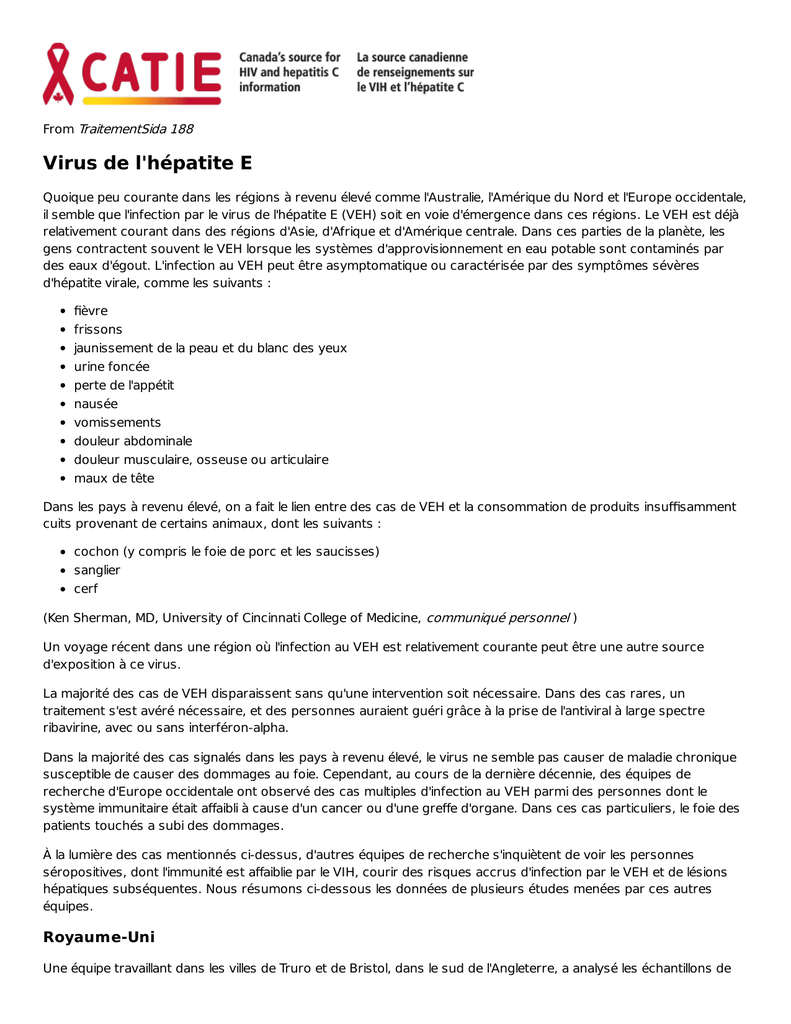 From TraitementSida 188 Virus de l'hépatite E Quoique peu courante dans les régions à revenu élevé comme l'Australie, l'Amérique du Nord et l'Europe occidentale, il semble que l'infection par le virus de l'hépatite E (VEH) soit en voie d'émergence dans ces régions. Le VEH est déjà relativement courant dans des régions d'Asie, d'Afrique et d'Amérique centrale. Dans ces parties de la planète, les gens contractent souvent le VEH lorsque les systèmes d'approvisionnement en eau potable sont contaminés par des eaux d'égout. L'infection au VEH peut être asymptomatique ou caractérisée par des symptômes sévères d'hépatite virale, comme les suivants : fièvre frissons jaunissement de la peau et du blanc des yeux urine foncée perte de l'appétit nausée vomissements douleur abdominale douleur musculaire, osseuse ou articulaire maux de tête Dans les pays à revenu élevé, on a fait le lien entre des cas de VEH et la consommation de produits insuffisamment cuits provenant de certains animaux, dont les suivants : cochon (y compris le foie de porc et les saucisses) sanglier cerf (Ken Sherman, MD, University of Cincinnati College of Medicine, communiqué personnel ) Un voyage récent dans une région où l'infection au VEH est relativement courante peut être une autre source d'exposition à ce virus. La majorité des cas de VEH disparaissent sans qu'une intervention soit nécessaire. Dans des cas rares, un traitement s'est avéré nécessaire, et des personnes auraient guéri grâce à la prise de l'antiviral à large spectre ribavirine, avec ou sans interféron-alpha. Dans la majorité des cas signalés dans les pays à revenu élevé, le virus ne semble pas causer de maladie chronique susceptible de causer des dommages au foie. Cependant, au cours de la dernière décennie, des équipes de recherche d'Europe occidentale ont observé des cas multiples d'infection au VEH parmi des personnes dont le système immunitaire était affaibli à cause d'un cancer ou d'une greffe d'organe. Dans ces cas particuliers, le foie des patients touchés a subi des dommages. À la lumière des cas mentionnés ci-dessus, d'autres équipes de recherche s'inquiètent de voir les personnes séropositives, dont l'immunité est affaiblie par le VIH, courir des risques accrus d'infection par le VEH et de lésions hépatiques subséquentes. Nous résumons ci-dessous les données de plusieurs études menées par ces autres équipes. Royaume-Uni Une équipe travaillant dans les villes de Truro et de Bristol, dans le sud de l'Angleterre, a analysé les échantillons de sang de 138 personnes séropositives et 463 personnes séronégatives pour détecter des anticorps contre le VEH — la présence de tels anticorps indique une exposition au virus. Ils ont également effectué des tests PCR (réaction en chaîne de la polymérase) pour détecter la présence de matériel génétique du VEH (indice d'une infection active à l'hépatite E). L'équipe n'a constaté aucune différence entre les deux populations étudiées quant aux taux d'exposition au VEH. De plus, aucune personne séropositive ne souffrait d'une infection chronique au VEH. France Une grande équipe de chercheurs œuvrant dans le nord et le sud de la France — Hyères, Maison-Alfort, Marseille, Pau, Paris et Toulon — a mené une étude auprès de 245 personnes séropositives. À l'aide de tests de dépistage des anticorps et d'épreuves PCR, des techniciens ont déterminé qu'environ 3 % de la population du nord de la France avaient été exposés au VEH dans le passé, comparativement à 9 % des personnes vivant dans le sud du pays. Aucun cas d'infection chronique au VEH n'a été détecté parmi les personnes séropositives. Suisse Des chercheurs suisses ont effectué un dépistage du VEH auprès de 735 personnes séropositives présentant des taux d'ALT élevés inexpliqués. Ils ont trouvé qu'environ 3 % des personnes avaient été exposées à ce virus. Aucune des personnes inscrites à cette étude n'avait l'hépatite B ou C chronique. Un seul patient avait l'infection chronique au VEH; celle-ci a duré 24 mois pendant que son compte de CD4+ était faible (moins de 100 cellules). Quand ce patient a commencé une multithérapie et que son compte de CD4+ a augmenté, il s'est remis de l'infection au VEH. États-Unis Un consortium de chercheurs médicaux militaires des États-Unis a mené une étude pour déterminer la prévalence de l'infection au VEH parmi les personnes séropositives. Les chercheurs ont analysé des échantillons de sang qui avaient été prélevés et entreposés entre 1985 et 2009. Les taux d'ALT (alanine aminotransférase) dans le sang des personnes en question étaient au moins cinq fois plus élevés que la limite supérieure de la normale. Mentionnons qu'une telle élévation du taux d'ALT laisse soupçonner la présence de dommages au foie, dommages comme ceux causés par une infection virale de cet organe. Ayant examiné les dossiers médicaux de 4 410 personnes séropositives, les chercheurs ont retrouvé 194 échantillons de sang qu'ils pouvaient soumettre à des tests de dépistage du VEH. En tout, les tests ont révélé que 13 personnes avaient été exposées au VEH. Aucune augmentation du nombre d'infections par le VEH ne s'est produite entre 1985 et 2009. En général, les personnes exposées au VEH n'avaient pas de caractéristiques qui les distinguaient des personnes n'ayant subi aucune exposition au virus, à une exception près : elles tendaient à avoir une charge virale plus élevée en VIH que les personnes qui n'avaient pas été exposées au VEH. Aucune des 13 personnes exposées au VEH n'a développé l'infection chronique au VEH. L'ensemble des résultats de ces études porte à croire que le VEH n'est pas plus courant chez les personnes vivant avec le VIH. Soupçons à l'égard du VEH Plusieurs des équipes mentionnées ci-dessus, dont l'américaine, ont proposé qu'un diagnostic d'infect