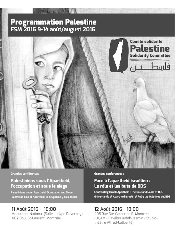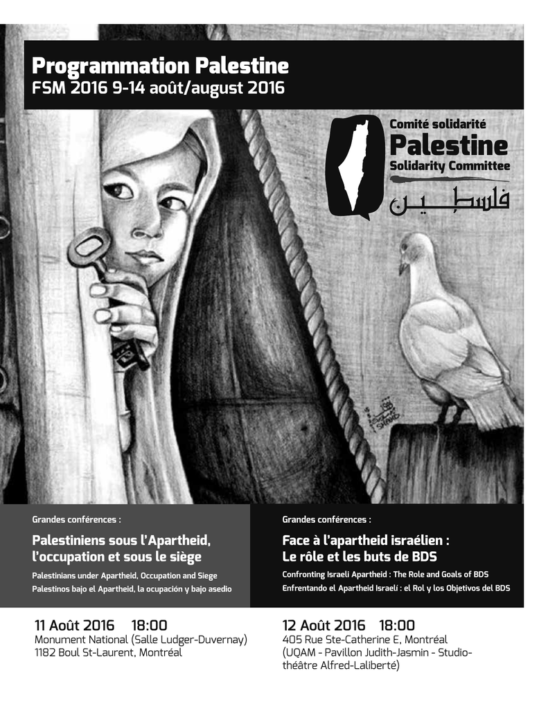 Programmation Palestine FSM 2016 9-14 août/august 2016 Comité solidarité Palestine Solidarity Committee Grandes conférences : Grandes conférences : Palestiniens sous l’Apartheid, l’occupation et sous le siège Face à l’apartheid israélien : Le rôle et les buts de BDS Palestinians under Apartheid, Occupation and Siege Confronting Israeli Apartheid : The Role and Goals of BDS Palestinos bajo el Apartheid, la ocupación y bajo asedio Enfrentando el Apartheid Israelí : el Rol y los Objetivos del BDS 11 Août 2016 18:00 Monument National (Salle Ludger-Duvernay) 1182 Boul St-Laurent, Montréal 12 Août 2016 18:00 405 Rue Ste-Catherine E, Montréal (UQAM - Pavillon Judith-Jasmin - Studiothéâtre Alfred-Laliberté) 2016-08-09 Title Location StartTime EndTime Rendez-vous BDS Montréal, QC H2L 1H7 (Parc Lafontaine, le triangle sud-ouest entre les rues Amherst, Sherbrooke et Cherrier) 16:00:00 17:30:00 Marche d’ouverture du FSM - Contingent Solidarité Palestine! Montréal, QC H2L 1H7 (Parc Lafontaine, coin sud-ouest) 17:30:00 18:30:00 Cérémonie d’ouverture Autochtone “Les mots avant tout autres”, pour honorer la Terre avec gratitude Place des Arts 18:30:00 19:00:00 Concert d’ouverture (Eduardo Branca, David Rovics, Queen Ka, Coral Egan et Tomas Jensen) Place des Arts 19:00:00 21:00:00 Atelier sur Jérusalem avec Zakariah Odeh 1430 Rue Saint-Denis Montréal, QC H2X Canada (Espace Palestine, Place Pasteur) 09:00:00 10:00:00 Animation pour faire de la sensibilisation sur la détention administrative 1430 Rue Saint-Denis Montréal, QC H2X Canada (Espace Palestine, Place Pasteur) 09:00:00 10:00:00 Vivre la Palestine: une animation pédagogique / Living Palestine: an educational workshop for civic awareness Cégep du Vieux Montréal (Local 884) 255, Rue Ontario E Montréal, QC, Canada 09:00:00 11:30:00 Eran Efrati and Jeff Halper: A Critical Israeli Voice Cégep du Vieux Montréal (Local 860) 255, Rue Ontario E Montréal, QC, Canada 09:00:00 11:30:00 Debate culture as a genuine democratic educational methodology Université McGill – Pavillon des Arts (Local 285) 853, rue Sherbrooke Ouest Montréal, QC, Canada 09:00:00 11:30:00 Academic boycott workshop 1430 Rue Saint-Denis Montréal, QC H2X Canada (Espace Palestine, Place Pasteur) 13:00:00 15:30:00 BDS: G4S and Municipal Campaigns Cégep du Vieux Montréal (Local 810) 255, Rue Ontario E Montréal, QC, Canada 13:00:00 15:30:00 Les luttes de la classe ouvrière palestinienne et le mouvement mondial de solidarité pour la Palestine / The struggles of the palestinian working class and the global solidarity movement for Palestine / Las luchas de la clase trabajadora palestina y el movimiento de solidaridad global para Palestina 320, rue Sainte-Catherine Est, Montréal, H2X 1L7 (UQAM – Pavillon DS - Local DS-R510) 13:00:00 15:30:00 La guerre sans fin 320, rue Sainte-Catherine Est, Montréal, H2X 1L7 (UQAM – Pavillon DS - Local DS-2585) 13:00:00 15:30:00 Projection de films de syndicalistes palestiniens et discussion 1430 Rue Saint-Denis Montréal, QC H2X Canada (Espace Palestine, Place Pasteur) 16:00:00 17:00:00 Table ronde militante pour préparer l’assemblée de convergence PALESTINE 1430 Rue Saint-Denis Montréal, QC H2X Canada (Espace Palestine, Place Pasteur) 17:00:00 19:00:00 2016-08-10 Appel pour un embargo militaire canadien à l’égard d’Israël Call for a Canadian Military Embargo toward Israel 12 Août 2016 16:00 UQAM – Pavillon R (Local R-M130) 315, rue Sainte-Catherine Est https://www.facebook.com/events/1655634501419196/ Animé par : Lorraine Guay, Coalition BDS-Québec Avec: Jamal Juma, Comité National Palestinien pour le boycott d’Israël (BNC) Yves Engler, auteur Maren Mantovani, Stop the Wall Mélanie Sarazin, Fédération des femmes du Québec Nicole Filion, Ligue des Droits et Libertés Martin Forgues, journaliste/auteur, Bruce Katz, PAJU- Palestinian & Jewish Unity 2016-08-11 Atelier “Comment sensibiliser et informer sur la situation en Palestine dans les différents pays” 1430 Rue Saint-Denis Montréal, QC H2X Canada (Espace Palestine, Place Pasteur) 09:00:00 10:00:00 Decolonizing Israel-Palestine through Challenging the JNF Cégep du Vieux Montréal (Local 214) 255, Rue Ontario E Montréal, QC, Canada 09:00:00 10:15:00 État de l’environnement pour la société civile au Québec, Canada, et dans le monde 200 Rue Sherbrooke O, Montréal, QC H2X 1X5 (UQAM Pavillon SH - Local SH-3620) 09:00:00 11:30:00 Women’s peace and security in peace and conflict Cégep du Vieux Montréal 255, Rue Ontario E Montréal, QC, Canada 09:00:00 11:30:00 Méthodes et stratégies de mobilisation pro-BDS sur les campus canadiens // Mobilisation methods and strategies for BDS campaigns on campuses Cégep du Vieux Montréal (Local 877) 255, Rue Ontario E Montréal, QC, Canada 09:00:00 11:30:00 The ‘new anti-Semitism’ or the ‘new McCarthyism’? The Israel Lobby’s war on Palestine Solidarity and How Best to Resist Cégep du Vieux Montréal (Local 214) 255, Rue Ontario E Montréal, QC, Canada 10:15:00 11:30:00 L’apartheid israélien est-il devenu acceptable en Occident ? Cégep du Vieux Montréal (Local 427) 255, Rue Ontario E Montréal, QC, Canada 13:00:00 15:30:00 The Women’s Boat to Gaza Cégep du Vieux Montréal (Local 801) 255, Rue Ontario E Montréal, QC, Canada 13:00:00 15:30:00 Assemblée de convergence- Palestine- Campagne BDS 320, rue Sainte-Catherine Est, Montréal, H2X 1L7 (UQAM Pavillon DS - DS-R520) 16:00:00 18:00:00 Grande Conf: Palestiniens sous l’Apartheid, l’occupation et sous le siège; Monument National (Salle Ludger-Duvernay) 1182 Boul St-Laurent Montréal, Québec, QC, Canada 18:00:00 19:30:00 Manifestation anticapitaliste de la CLAC 1430 Rue Saint-Denis Montréal, QC H2X Canada (Place Pasteur) 18:00:00 23:00:00 Projection de films FACES 1430 Rue Saint-Denis Montréal, QC H2X Canada (Espace Palestine, Place Pasteur) 20:30:00 21:30:00 Dabkeh palestinienne Quai Jacques-Cartier, 