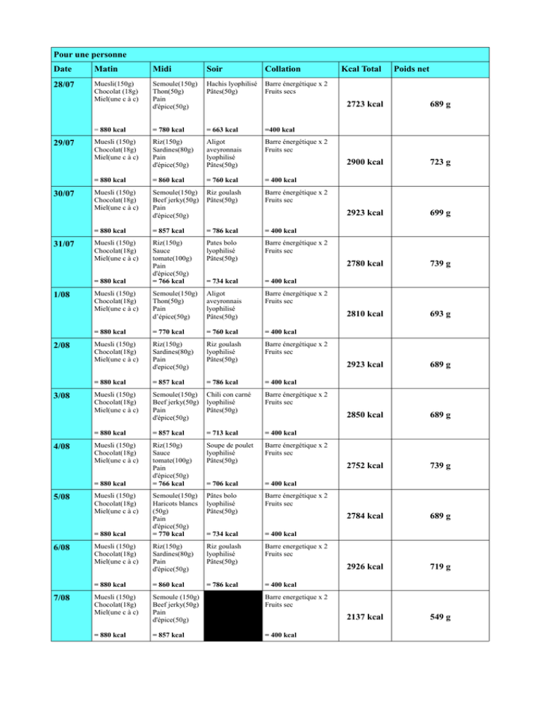 Pour une personne Date Matin Midi Soir Collation 28/07 Muesli(150g) Chocolat (18g) Miel(une c à c) Semoule(150g) Thon(50g) Pain d'épice(50g) Hachis lyophilisé Pâtes(50g) Barre énergétique x 2 Fruits secs = 880 kcal = 780 kcal = 663 kcal =400 kcal Muesli (150g) Chocolat(18g) Miel(une c à c) Riz(150g) Sardines(80g) Pain d'épice(50g) Aligot aveyronnais lyophilisé Pâtes(50g) Barre énergétique x 2 Fruits sec = 880 kcal = 860 kcal = 760 kcal = 400 kcal Muesli (150g) Chocolat(18g) Miel(une c à c) Semoule(150g) Beef jerky(50g) Pain d'épice(50g) Riz goulash Pâtes(50g) Barre énergétique x 2 Fruits sec = 880 kcal = 857 kcal = 786 kcal = 400 kcal Muesli (150g) Chocolat(18g) Miel(une c à c) Riz(150g) Sauce tomate(100g) Pain d'épice(50g) = 766 kcal Pates bolo lyophilisé Pâtes(50g) Barre énergétique x 2 Fruits sec = 734 kcal = 400 kcal Muesli (150g) Chocolat(18g) Miel(une c à c) Semoule(150g) Thon(50g) Pain d’épice(50g) Aligot aveyronnais lyophilisé Pâtes(50g) Barre énergétique x 2 Fruits sec = 880 kcal = 770 kcal = 760 kcal = 400 kcal Muesli (150g) Chocolat(18g) Miel(une c à c) Riz(150g) Sardines(80g) Pain d'epice(50g) Riz goulash lyophilisé Pâtes(50g) Barre énergétique x 2 Fruits sec = 880 kcal = 857 kcal = 786 kcal = 400 kcal Muesli (150g) Chocolat(18g) Miel(une c à c) Semoule(150g) Beef jerky(50g) Pain d'épice(50g) Chili con carné lyophilisé Pâtes(50g) Barre énergétique x 2 Fruits sec = 880 kcal = 857 kcal = 713 kcal = 400 kcal Muesli (150g) Chocolat(18g) Miel(une c à c) Riz(150g) Sauce tomate(100g) Pain d'épice(50g) = 766 kcal Soupe de poulet lyophilisé Pâtes(50g) Barre énergétique x 2 Fruits sec = 706 kcal = 400 kcal Semoule(150g) Haricots blancs (50g) Pain d'épice(50g) = 770 kcal Pâtes bolo lyophilisé Pâtes(50g) Barre énergétique x 2 Fruits sec = 734 kcal = 400 kcal Muesli (150g) Chocolat(18g) Miel(une c à c) Riz(150g) Sardines(80g) Pain d'épice(50g) Riz goulash lyophilisé Pâtes(50g) Barre energetique x 2 Fruits sec = 880 kcal = 860 kcal = 786 kcal = 400 kcal Muesli (150g) Chocolat(18g) Miel(une c à c) Semoule (150g) Beef jerky(50g) Pain d'épice(50g) Barre energetique x 2 Fruits sec = 880 kcal = 857 kcal = 400 kcal 29/07 30/07 31/07 = 880 kcal 1/08 2/08 3/08 4/08 = 880 kcal 5/08 Muesli (150g) Chocolat(18g) Miel(une c à c) = 880 kcal 6/08 7/08 Kcal Total Poids net 2723 kcal 689 g 2900 kcal 723 g 2923 kcal 699 g 2780 kcal 739 g 2810 kcal 693 g 2923 kcal 689 g 2850 kcal 689 g 2752 kcal 739 g 2784 kcal 689 g 2926 kcal 719 g 2137 kcal 549 g Kcal total : 30508 Poids net total : 7617 g