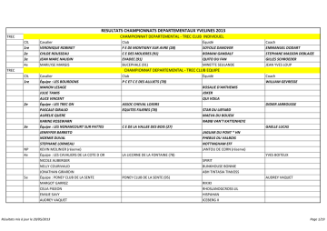 RESULTATS CHAMPIONNATS DEPARTEMENTAUX YVELINES 2013 CHAMPIONNAT DEPARTEMENTAL - TREC CLUB INDIVIDUEL TREC Clt. 1re 2e 3e 4e Cavalier VERONIQUE ROBINET CHLOE ROUSSEAU JEAN MARC NAUDIN MARILYSE MARGIS Club F E DE MONTIGNY SUR AVRE (28) C E DES MOLIERES (91) EVADEC (91) BUCEPHALE (91) Clt. 1re Cavalier Équipe : LES BOURDONS MANON LESAGE JULIE TAMIS ALICE VINCENT Équipe : LES TREC ON PASCALE GIRAUD AURELIE QUERE KARINE ROSEWARN Équipe : LES NONANCOURT SUR PATTES JENNYFER BARRETO NOEMIE DUVAL STEPHANE LORMEAU KEVIN MOLINIER (réserve) Équipe : LES CAVALIERS DE LA COTE D OR NICOLE AUBERGER NELLY COURIVAUD JONATHAN GIRARDIN Équipe : PONEY CLUB DE LA SENTE MARGOT GARREZ CELIA PIGEON EMILIE SAVY AUDREY VAQUET Club P C ET C E DES ALLUETS (78) Équidé SOYOUZ DANOVER ROMANI GANDALF QUITO DU FAN MINETTE SEULANDE Coach EMMANUEL DODART STEPHANE MASSON DEBLAIZE GILLES SCHROEDER JEAN YVES LOUP CHAMPIONNAT DEPARTEMENTAL - TREC CLUB EQUIPE TREC 2e 3e NP 4e 5e Résultats mis à jour le 29/05/2013 Équidé Coach WILLIAM GEVRESSE ROSALIE D'ANTHEMIS JOKER QUI VOILA ASSOC CHEVAL LOISIRS EQUITES FILIERES (78) DIDIER JARROUSSE STAR DU LIEFARD MAEVA DU BOUEIX NABIB VAN'T KATTENHEYE C E DE LA VALLEE DES BOIS (27) GAELLE LUCAS JAGUAR DU PONT * HN PHEBUS DU VALBOIS NOTTINGHAM EFF JANTOU DE CORN (réserve) LA LICORNE DE LA FONTAINE (78) YVES BOITEUX SPIRIT BUNKHOUSE BONNIE ABH TINTASIA TIMJOSS PONEY CLUB DE LA SENTE (95) AUDREY VAQUET RIKIKI RHOSLANOGCROSS LIL HISPAHAN ICEBERG II Page 1/19 CHAMPIONNAT DEPARTEMENTAL - TREC CLUB EQUIPE (suite) TREC 6e Équipe : LES TOURISTES AZIMUTEES ALIX ANNE GROUSSET MANON LECLERC BARBARA LORMEAU C E DE LA VALLEE DES BOIS (27) GAELLE LUCAS PESCALUNE CARABINS EBANO TORANJA CHAMPIONNAT DEPARTEMENTAL - TREC CLUB ELITE INDIVIDUEL TREC Clt. 1re 2e 3e 4e 5e Cavalier CHRISTINE CATTIN MARION DUPOUY TIFFANY DUON THIERRY ALLARY MICHEL MARAUX Club LA LICORNE DE LA FONTAINE (78) ASSO LES ECURIES DE MARMONT (91) EVADEC (91) LA LICORNE DE LA FONTAINE (78) LA LICORNE DE LA FONTAINE (78) Équidé ATOMIC MOUNT THORGAL DE LA GUERINIERE ALACRAN JOLIE FONTAINE OSCAR DU FOUR Coach CLAIRE LAURENT CELINE FOURNIAL GILLES SCHROEDER CLAIRE LAURENT CLAIRE LAURENT CHAMPIONNAT DEPARTEMENTAL - TREC CLUB ELITE EQUIPE TREC Clt. 1re 2e 3e Cavalier Équipe : LA LICORNE DE LA FONTAINE 1 ESTELLE BAZILLAIS SOLENE CAUET GAELLINE LEGOUIX BRUNO VO QUI Équipe : LES KAMIKAZES LAURIANE DE SAINT POL MARIE HENNIQUANT MARINA MULLER ESTELLE PRISKER Équipe : LES SHERLOCKS HOLMES CHRISTOPHE ANTOINE CLAIRE ANTOINE JULIE SCHOOS DEVIGE Club LA LICORNE DE LA FONTAINE (78) Équidé Coach YVES BOITEUX EMMY SAINT MARTIN THALIKA DU TAILLIS LEARNING D'ATHOU LAMBADA DES BRUYERES C E LES FAUVETTES (78) CLOTILDE SARDAIN SIR DE GOUPILLEL SAF SAF TWISTITI SETI LA LICORNE (28) CECILE PAFFRATH MARQUIS GUERINIERE ONE DAY CHEYENNE CHAMPIONNAT DEPARTEMENTAL - TREC CLUB AMATEUR ELITE INDIVIDUEL TREC Clt. 1re 2e 3e Cavalier ANNE VANARA EMELINE HALES ETIENNE DE TOCQUEVILLE Résultats mis à jour le 29/05/2013 Club EVADEC (91) ASSOC MADAME DE L ETANG (91) EVADEC (91) Équidé THESEE DU TROTTIS QUENO T'ADJI DU GRAND BOSC Coach ANNE VANARA EMELINE HALES ETIENNE DE TOCQUEVILLE Page 2/19 CHAMPIONNAT DEPARTEMENTAL - TREC CLUB AMATEUR ELITE INDIVIDUEL (suite) TREC Clt. 4e 5e 6e 7e 8e 9e Cavalier GERARD DEFRENOIS GILLES SCHROEDER FREDERIQUE FRANCESCHINI ERIC SOEUVRE ROMAIN JARRION MARION NAUDE Club ECURIES DE LA MAISON ROUGE (91) EVADEC (91) EVADEC (91) ECURIES D AUXON (10) EVADEC (91) ASSO LE RANDON DU TARDENOIS (51) Clt. 1re 2e Cavalier PAULINE RICHARD LAURA SORNETTE Club C H DE VILVERT (78) C H DES ETANGS DE MEUDON (92) Équidé PARADIZIO SEPARTIE DU JAAR HOKI TEZO QITO DE SAINT GER URBAN DE COUX Coach FREDDY ROUVIERE GILLES SCHROEDER GILLES SCHROEDER LOIC BRETAULT ROMAIN JARRION JEAN MARC ZECCHETTI CHAMPIONNAT DEPARTEMENTAL - CCE CLUB ELITE CCE Équidé MAGENE CONCILLIERE SULTAN D'INCOVILLE Coach SOPHIE VILLEDIEU SOPHIE ATCHIA CHAMPIONNAT DEPARTEMENTAL - CCE CLUB 1 CCE Clt. 1re 2e 3e 4e 5e 6e 7e 8e 9e 10e 11e 12e El. Cavalier ALICE MERIO LAURA ENICH SEGOLENE RICHARD PAULINE SOULET ELISA THOMSON TIFANNY CAUBEL PAULINE SOULET SEGOLENE RICHARD MATHILDE GIRODET HELOISE RICHARD INES COHEN DIANE RICHARD ROMAIN LEBLOND Club C H MUNICIPAL DE ST MAUR (94) C H DE VILVERT (78) C H DE VILVERT (78) C H DE VILVERT (78) C H MUNICIPAL DE ST MAUR (94) HARAS DE LA GRANGE (78) C H DE VILVERT (78) C H DE VILVERT (78) C H DE LA JONCTION (78) ECURIES DE ST ARNOULT (78) C H DES ETANGS DE MEUDON (92) ECURIES DE ST ARNOULT (78) C H DE LA JONCTION (78) Clt. 1re 2e 3e 4e Cavalier JUSTINE LABOUISE LINE BOURSE MAUD FARGE JUSTINE LABOUISE Club BONNEVILLE ORGANISATION COMPLET (78) C H DE LA JONCTION (78) PONEY CLUB DU VAL DE SAONE (69) BONNEVILLE ORGANISATION COMPLET (78) Équidé LOUSTIC DES COULEURS NEO DE LA PILONNIERE OSCAR D'ANJOU OSCAR D'ANJOU NECTAR DE BRAIZE CORRAGIO Z NONO DU THELIN MOOGLY DES ROCAILLES QUENOTTE CARANTILLY T'OK DE NATH KIM DE DUN PERNOD DES BOIS OUGLOF DES PAPERIES Coach CLAIRE BEDELOUP SOPHIE VILLEDIEU SOPHIE VILLEDIEU SOPHIE VILLEDIEU CLAIRE BEDELOUP CHRISTIAN BONLIEU SOPHIE VILLEDIEU SOPHIE VILLEDIEU ARNAUD THILL LAURENCE ADJADJ SOPHIE ATCHIA LAURENCE ADJADJ ARNAUD THILL CHAMPIONNAT DEPARTEMENTAL - CCE CLUB 2 CCE Résultats mis à jour le 29/05/2013 Équidé FERANOUR AR CRANO NANKIN DE VAINS NUAGE QUID DE L'AUBE Coach MARION LAFONTAN JULIE PLUVINAGE MAUD FARGE MARION LAFONTAN Page 3/19 CHAMPIONNAT DEPARTEMENTAL - CCE CLUB 2 (suite) CCE Clt. 5e 6e 7e 8e 9e ex 9e ex 11e 12e 13e 14e 15e 16e 17e 18e 19e 20e 21e 22e 23e 24e 25e 26e 27e 28e 29e 30e 31e 32e 33e 34e El. Cavalier CHRYSTELLE COLONNETTE MARINE DEVILLIERS INES COHEN ROMAIN DEREUX LUCILE ANDRE CLAIRE DEREUX NAOMI MARIENNEAU PIERRE MINOVES MARINE DEVILLIERS PIERRE MINOVES JULIETTE GUEROULT PERRINE SALESSY ESTELLE POULLEAU ALICE LATTES JULIE PARAIRE HELENE FAURY YOANN CORNEILLE ESTELLE POULLEAU LUC VO ISABELLE SOCKEEL MAURANE VANDEVOORDE TIFFANY SARAZIN MARTINE MARTINOT LAGARDE SALOME BOUISSET JEAN 