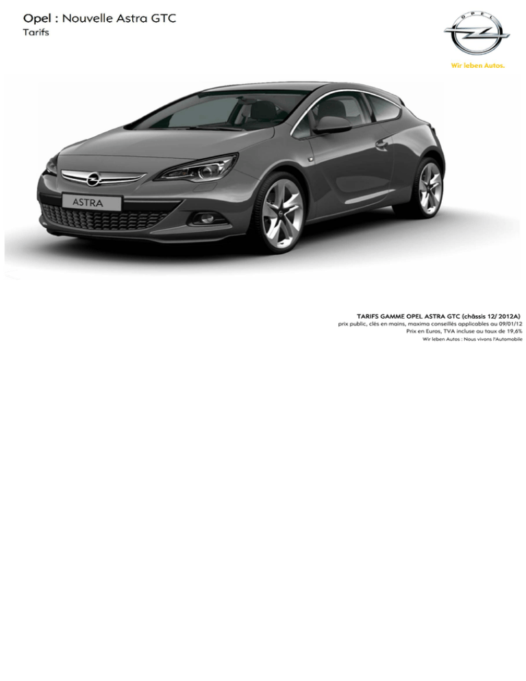 Opel : Nouvelle Astra GTC Tarifs TARIFS GAMME OPEL ASTRA GTC (châssis 12/ 2012A) prix public, clés en mains, maxima conseillés applicables au 09/01/12 Prix en Euros, TVA incluse au taux de 19,6% Wir leben Autos : Nous vivons l'Automobile Construction de gamme ENJOY SPORT + Sécurité et conduite Sécurité et conduite Contrôle electronique de stabilité (ESC) Phares antibrouillard avant Compensation hydraulique de l'évanouissement des freins (HBFA) Contrôle électronique de trajectoire ESP Fixations Isofix sur les deux sièges latéraux arrière Kit anti-crevaison Pédalier rétractable en cas de choc frontal (PRS) Equipements ENJOY + Aide au démarrage en côte Contrôle de freinage en courbe (CBC) Assistance au freinage d'urgence (BAS) Eléments de décoration intérieure "Titane brossé/piano" Sièges sports Audio et communication Radio CD400 MP3 avec prise auxiliaire audio, 7 hautparleurs Capteur de pluie Allumage automatique des phares Régulateur de vitesse Ligne de vitrage chromée Jantes alliage 18'' multi-branches Audio et communication Radio CD300 MP3 avec prise auxiliaire audio, 4 hautparleurs Equipement Bluetooth Extérieur Rétroviseurs extérieurs et poignées de portes couleur carrosserie Jantes 17" avec enjoliveurs Rétroviseurs extérieurs électriques et dégivrants Intérieur et confort Intérieur et confort Interface audio USB Intérieur et confort Phares Adaptatifs bi-xenon Climatisation automatique bi-zone avec filtre antipollen et détecteur de qualité d'air Système antiblocage des roues (ABS électronique) avec Répartition électronique du freinage (EBD) Dossier de banquette arrière rabattable asymétriquement 1/3 - 2/3 Climatisation manuelle intégrant un filtre anti-pollen Siège conducteur et passager réglables dans 6 directions dont réglage en hauteur Verrouillage centralisé (portes, coffre et trappe à carburant) à télécommande Miroirs de courtoisie éclairés Spots de lecture avant et arrière Volant cuir multifonction réglable en hauteur et en profondeur Vitres électriques avant Ordinateur de bord Assistant feux de route Rétroviseur intérieur électrochromatique Poches aumônières au dos des sièges avant Accoudoir central coulissant et porte-gobelets Eléments de décoration intérieure "Gris Perle" Sécurité et conduite Aide au stationnement arrière Contrôle de traction (TC) Contrôle de couple en courbe (CTC) SPORT PACK + Equipements SPORT + 1 Sellerie cuir mixte Audio et communication Système de navigation 600 SD, Affichage couleur 7'', Carte SD 1 Gb, prise USB et Aux-in Extérieur Feux AR LED Jantes alliage 19'' Vitres AR sur-teintées Extérieur SPORT + PANORAMIQUE Système de navigation 600 SD, Affichage couleur 7'', Carte SD 1 Gb, prise USB et Aux-in Pare-Brise panoramique Feux AR LED - SUPPRESSION D'EQUIPEMENT LIEE AU PARE -BRISE PANORAMIQUE Spots de lecture avant et arrière Miroirs de courtoisie éclairés Capteur de pluie Rétroviseur intérieur électrochromatique Assistant feux de route Allumage automatique des phares Equipement Bluetooth Motorisations / Finitions 2 ENJOY Nouvelle Astra GTC Essence SPORT PACK PANORAMIQUE Boîte de vitesses Puiss. admin. CO2 g/km CODE TTC CODE TTC CODE TTC CODE TTC 1.4 Turbo 88 kW / 120 ch Start/Stop BM6 7CV 139/142 RD08 GV61 21 400 € - - - - - - 1.4 Turbo 103 kW / 140 ch Start/Stop BM6 8CV 139/142 - - RF08 GW61 1.6 Turbo 132 kW / 180 ch BM6 10/11CV 168/169 - - RF08 iE61 1.7 CDTI 81 kW / 110 ch FAP Start/Stop BM6 6CV 119/121 RD08 J261 1.7 CDTI 96 kW / 130 ch FAP Start/Stop BM6 7CV 119/121 - - RF08 J161 26 300 € RF08 J162 29 200 € RF08 J163 27 900 € 2.0 CDTI 121 kW / 165 ch FAP Start/Stop BM6 9CV 127/129 - - RF08 M7J1 27 400 € RF08 M7J2 30 300 € RF08 M7J3 29 000 € 2.0 CDTI Auto 121 kW / 165 ch FAP BA6 9CV 159/161 - - RF08 MEF1 28 400 € RF08 MEF2 31 300 € RF08 MEF3 30 000 € Motorisation Diesel SPORT 24 300 € RF08 GW62 27 200 € RF08 GW63 25 900 € 25 300 € 23 500 € RF08 J261 25 400 € RF08 iE62 28 200 € RF08 iE63 26 900 € - - RF08 J263 27 000 € Le prix public "Clé en main" comprend le transport jusqu'au distributeur en France métropole et la préparation à la route incluant fourniture et pose d'un jeu de plaques d'immatriculation ainsi que 5 litres de carburant La carte grise est à la charge du client. Ces prix et spécifications peuvent être changés sans préavis et ne constituent pas une offre ferme. TARIFS GAMME OPEL ASTRA GTC (châssis 12/ 2012A) prix public, clés en mains, maxima conseillés applicables au 09/01/12 Prix en Euros, TVA incluse au taux de 19,6% Packs & Options 3 OPTIONS Codes Packs TADC Pack Cuir : cuir perforé mondial noir, sièges avant chauffants, sièges avant ergonomiques certifiés parrière l'AGR, réglage lombaire, appuie-tête avant actifs, troisième appui-tête arrière, accoudoir central arrière, trappe à ski TAHi Pack Cuir Mixte: Tissu alcantara, sièges avant chauffants, troisième appui-tête arrière et accoudoir central arrière, trappe à ski SRO Pack confort arrière: troisième appui-tête arrière, accoudoir central arrière, trappe à ski (de série sur Pack Cuir et Pack Tissu / Alcantara) Pack Sièges ergonomiques : sièges avant ergonomiques en tissu certifiés par l'AGR, réglage lombaire, appuie-tête avant actifs, troisième appui-tête arrière, accoudoir central arrière, trappe à ski (passer le code trim TADB : tissu Lace Atlantis Noir / Attention si Sport pas de siège mixte Morrocana possible) SRY PH4F Pack Assistance : Aide au stationnement avant & arrière, rétroviseurs extérieurs rabattables électriquement WBP Pack OPC line : Lèvres de pare-chocs avant et arrière, jupes latérales Sécurité T3U Phares antibrouillard avant A8Z Phares adaptatifs directionnels bi-xenon 8 fonctions + feux diurnes (Assistant feux de route inopérant avec Caméra Opel eye) HME Caméra Opel eye : avertisseur de changement de voies intempestif, reconnaissance des panneaux de signailisation, indicateur d'écar