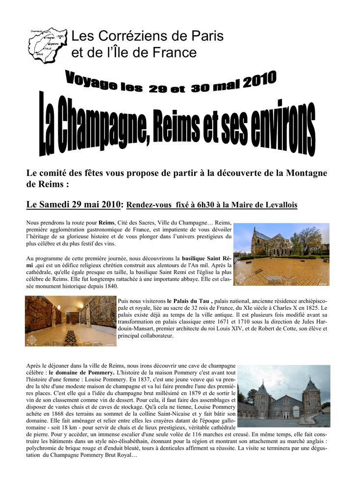 Les Corréziens de Paris et de l’Île de France Le comité des fêtes vous propose de partir à la découverte de la Montagne de Reims : Le Samedi 29 mai 2010: Rendez-vous fixé à 6h30 à la Maire de Levallois Nous prendrons la route pour Reims, Cité des Sacres, Ville du Champagne… Reims, première agglomération gastronomique de France, est impatiente de vous dévoiler l’héritage de sa glorieuse histoire et de vous plonger dans l’univers prestigieux du plus célèbre et du plus festif des vins. Au programme de cette première journée, nous découvrirons la basilique Saint Rémi ,qui est un édifice religieux chrétien construit aux alentours de l'An mil. Après la cathédrale, qu'elle égale presque en taille, la basilique Saint Remi est l'église la plus célèbre de Reims. Elle fut longtemps rattachée à une importante abbaye. Elle est classée monument historique depuis 1840. Puis nous visiterons le Palais du Tau , palais national, ancienne résidence archiépiscopale et royale, liée au sacre de 32 rois de France, du XIe siècle à Charles X en 1825. Le palais existe déjà au temps de la ville antique. Il est plusieurs fois modifié avant sa transformation en palais classique entre 1671 et 1710 sous la direction de Jules Hardouin-Mansart, premier architecte du roi Louis XIV, et de Robert de Cotte, son élève et principal collaborateur. Après le déjeuner dans la ville de Reims, nous irons découvrir une cave de champagne célèbre : le domaine de Pommery. L'histoire de la maison Pommery c'est avant tout l'histoire d'une femme : Louise Pommery. En 1837, c'est une jeune veuve qui va prendre la tête d'une modeste maison de champagne et va lui faire prendre l'une des premières places. C'est elle qui a l'idée du champagne brut millésimé en 1879 et de sortir le vin de son classement comme vin de dessert. Pour cela, il faut faire des assemblages et disposer de vastes chais et de caves de stockage. Qu'à cela ne tienne, Louise Pommery achète en 1868 des terrains au sommet de la colline Saint-Nicaise et y fait bâtir son domaine. Elle fait aménager et relier entre elles les crayères datant de l'époque galloromaine - soit 18 km - pour servir de chais et de lieux prestigieux, véritable cathédrale de pierre. Pour y accéder, un immense escalier d'une seule volée de 116 marches est creusé. En même temps, elle fait construire les bâtiments dans un style néo-élisabéthain, étonnant pour la région et montrant son attachement au marché anglais : polychromie de brique rouge et d'enduit bleuté, tours à denticules affirment sa réussite. La visite se terminera par une dégustation du Champagne Pommery Brut Royal… Dernière visite au programme de cette première journée , le Musée automobile de Reims Champagne. Le cinquième musée automobile de France par l'importance de ses collections est aujourd'hui géré par une association de collectionneurs, propriétaires d'un certain nombre des 200 véhicules exposés selon une présentation régulièrement renouvelée. Autos et motos, de 1908 à nos jours, certains modèles ayant été fabriqués à quelques exemplaires, sont exposés, dont une survivante des automobiles S.C.A.R. de Witry-les-Reims, et de nombreuses marques prestigieuses : Sizaire-Berwick de 1910, Coupé docteur Alba de 1919, Citroën 11 AL ou Panhard 24. On peut également admirer des motos rares - Alcyon, Condor, DKW, Terrot…ainsi que près de 110 voitures à pédales. Enfin, le musée expose une collection de plaques émaillées et plus de 5 000 miniatures et jouets automobiles. Dimanche 30 Mai : La journée débutera par la visite de l’élevage d’escargots des Grands Crus, à Bouzy. C’est une entreprise familiale, les escargots sont produits à la ferme, élevés dans un parc extérieur, nourris de végétaux et de céréales. La transformation du produit est réalisée sur place. Sa chair est tendre et savoureuse . Après le déjeuner, nous rendrons visite à un petit producteur de champagne, à Chigny-les-roses, la maison Gounel-Lassalle, que les anciens de l’Amicale des Corréziens de Paris connaissent bien puisque l’aïeul de Mr Gounel était adhérent dès la création de l’association ! Une dégustation des différents Champagne produits ici, notamment le Premier Cru « Chigny » achèvera la visite. Avant le retour sur la capitale, un détour par la forêt de Verzy permettra de découvrir les fameux « Faux de Verzy », curiosité botanique que l’on ne retrouve que dans tris régions au monde ! NOM : …………………………………. Prénom :……………………………………… 185 € (ou 205€) = …………………….. € 37 € = ……...………………€ TOTAL = ………...……………€ Place de parking (mairie de Levallois) oui non Nombre de places : Supplément chambre seule : X X Si vous êtes intéressés, coupon à retourner AVANT le 31 MARS 2010, OU téléphoner à : Yolande et Hubert PISTRE, 16, rue Bouvier 92340 BOURG-LA-REINE Tél. : 01 46 64 52 01 Marie-Claire et Didier LAFONT, 3 Allée Paul Langevin 77150 LESIGNY Tél. : 01 60 02 13 99 Christiane PAUPARD, 49 rue Marius Aufan 92300 LEVALLOIS-PERRET Tél. : 01 47 58 89 47 (après 20H) Ou sur Internet à : corré[email protected] Les Corréziens de Paris et de l’Île de France , Maison des associations 34 rue Pierre Brossolette 92300 LEVALLOIS-PERRET