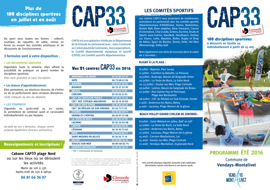 LES COMITÉS SPORTIFS 3 formules sont à votre disposition : • LES DÉCOUVERTES GRATUITES Organisées toute la semaine, elles offrent la possibilité de pratiquer un grand nombre de disciplines sportives. Elles sont gratuites et sans inscription. • Les séances d’approfondissement Elles permettent, sur plusieurs séances, de s’initier ou de se perfectionner dans certaines disciplines. Tarifs indiqués au dos du dépliant. • LES TOURNOIS Organisés en après-midi ou en soirée, ils permettent de combiner sport et convivialité individuellement ou par équipes. Au-delà de ces 3 formules, chaque centre propose également diverses animations. Cabane CAP33 plage Nord ou sur les lieux où se déroulent les activités Matin de 10h à 13h Après-midi de 15h à 19h30 06 81 66 36 07 CAP33 est une opération initiée par le Département de la Gironde en partenariat avec : votre Commune ou Communauté de Communes, leurs associations, le Comité départemental olympique et sportif (CDOS), les Comités sportifs départementaux. à découvrir en famille ou individuellement à partir de 15 ans Mais également une série de tournois dans le cadre de 2 tournées : ANDERNOS-LES-BAINS ARÈS AUDENGE BIGANOS BRUGES CARCANS CDC* DE CASTILLON PUJOLS CDC* DES COTEAUX MACARIENS CDC* DU PAYS FOYEN CDC* DU RÉOLAIS EN SUD GIRONDE EYSINES GRAYAN-ET-L’HÔPITAL LA TESTE-DE-BUCH LACANAU LANTON LÉOGNAN MIOS SAINT-MEDARD-EN-JALLES SALLES SOULAC-SUR-MER VENDAYS-MONTALIVET 8 juillet : Biganos, Parc Lecoq 11 juillet : Castillon-la-Bataille, La Pelouse 19 juillet : Audenge, Bassin de Baignade Orten 20 juillet : La-Teste-de-Buch, La Salie Nord 22-23 juillet : Soulac-sur-Mer, Plage Centrale 26 juillet : Lanton, Bassin de baignade du Braou 27 juillet : Port Sainte-Foy-et-Ponchapt, Plage des Bardoulets 28 juillet : CDC du Réolais en Sud Gironde, Fontet 2 août : Andernos-les-Bains, Betey 4 août : Lacanau, Plage Maison de la glisse 05 56 82 02 47 06 73 68 61 06 06 14 47 29 54 06 73 27 22 95 05 56 16 17 95 05 56 03 21 01 07 87 92 55 66 06 33 14 20 83 06 35 95 63 26 05 56 71 71 55 06 33 83 59 77 06 60 97 57 88 06 40 41 27 91 05 56 26 03 08 05 56 82 99 81 06 35 93 73 82 06 77 53 64 77 05 56 05 71 14 05 56 88 34 63 06 80 48 82 74 06 81 66 36 07 * CDC = Communauté de Communes Les animations CAP33 sont couvertes en responsabilité civile par la commune ou la communauté de communes auprès d’une société d’assurance. Afin de parer à toute éventualité, il est toutefois souhaitable que les utilisateurs soient eux-mêmes titulaires d’une assurance individuelle complémentaire. 8 juillet : Saint-Médard-en-Jalles, Ball’ en Jall’ 10 juillet : La-Teste-de-Buch, La Salie Nord 14 juillet : Andernos-les-Bains, Betey 17 juillet : Lacanau, Plage Maison de la glisse 14 août : Carcans-Maubuisson, Lac 15 août : Soulac-sur-Mer, Plage Centrale 21 août : Vendays-Montalivet, Esplanade Nord Département de la Gironde – DCIP – CID – Juin 2016 Du sport sous toutes ses formes : collectif, nautique, de raquette, de sable, remise en forme ou encore des activités artistiques et de découverte de l’environnement. Les centres CAP33 vous proposent de nombreuses animations en partenariat avec les comités sportifs départementaux d’Athlétisme, Aviron, Badminton, Basket Ball, Boxe anglaise, Boxe française, Course d’orientation, Char à voile, Echecs, Escrime, Etude et Sports sous-marins, Handball, Handisport, Hockey sur Gazon, Lutte, Natation, Roller, Rugby et Drop de béton, Sport de Boules, Tennis, Voile, Vol libre (Boomerang), Volley-ball. PROGRAMME ÉTÉ 2016 Une activité physique régulière associée à des habitudes alimentaires saines contribuent à une bonne santé. Commune de Vendays-Montalivet CAP33 / Commune de Vendays-Montalivet - JUILLET/AOÛT 2016 - Pour les familles et les individuels de plus de 15 ans DÉCOUVERTES GRATUITES 10h-12h : Marche Nordique - Départ Gymnase 16h-18h : Slackline - Plage CAP33 TOURNOIS 15h30 : Beach Tennis Simple - Plage CAP33. Gratuit TOURNOIS 14h30 : C oncours Pétanque (doublette). 6 €/ pers. Boulodrome 15h30 : Volley de Plage 3x3 - Plage CAP33. Gratuit 20h15 : Bridge - Maison des Jeunes. 3 €/ pers. 21h : Tennis de Table - Gymnase. Gratuit ANIMATIONS PLAGE Plage CAP33 Gratuit Tous les jours 10h-13h et 15h-19h30 Beach Soccer, Beach Tennis, Beach Volley, Sandball… DÉCOUVERTES GRATUITES 10h-12h : Baby poney/ visite ferme animalière Inscription cabane CAP33 plage Nord 17h-18h30 : Char à voile - Face Plage CAP33 (Chaussures fermées) 17h-19h : Ateliers artisanaux - Salle Polyvalente 17h30-19h30 : Badminton - Complexe sportif 21h-22h : Animation de rue - Avenue de l’Océan TOURNOIS 15h30 : Beach Volley 2x2 - Plage CAP33. Gratuit DÉCOUVERTES GRATUITES 8h-11h : Surfcasting - Plage CAP33 10h-12h : Equitation confirmé. Inscription et information Cabane CAP33 plage Nord 15h-16h30 : Tir à l’arc - Complexe sportif 16h-17h30 : Surf. Informations et inscriptions Plage CAP33 17h-19h : Ateliers artisanaux - Salle Polyvalente TOURNOIS 14h15 : Bridge - Maison des Jeunes. 3 €/ pers. 15h30 : Beach Soccer - Plage CAP33. Gratuit 21h : Badminton double - Complexe sportif. Gratuit DÉCOUVERTES GRATUITES 10h-12h : É quitation débutant. Inscription et information Cabane CAP33 plage Nord 17h-19h : Ateliers artisanaux - Salle Polyvalente 17h30-19h30 : Tennis de Table - Gymnase DÉCOUVERTES GRATUITES 8h-11h : Surfcasting - Plage CAP33 15h-16h30 : Tir à l’arc - Complexe sportif 17h-18h30 : C har à voile - Face plage CAP33 (Chaussures fermées) 17h-19h : Ateliers artisanaux - Salle Polyvalente TOURNOIS 15h30 : Beach-Tennis double - Plage CAP33. Gratuit 17h-19h30 : F utsal sur herbe - Complexe sportif. Gratuit 21h : Belote - Maison des Jeunes. Gratuit En cas de mauvais temps, les activités se dérouleront au gymnase situé avenue de l’Europe à Montalivet TOURNOIS 15h30 : Sandball - Plage CAP33. Gratuit 21h : Badminton en simple homme et femme Complexe sportif. Gratuit 11 au 20 