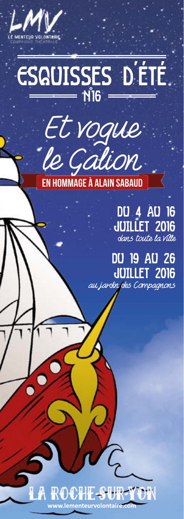 Esquisses d’été N°16 Et vogue le Galion En HOMMAGE à Alain Sabaud Du 4 au 16 juillet 2016 dans toute la Ville Du 19 au 26 juillet 2016 au jardin des Compagnons www.lementeurvolontaire.com Un pied dans le crime ESQUISSE SUR TRÉTEAUX Création originale en 3 semaines et en plein air Texte Eugène Labiche Adaptation très libre et nouvelle mise en scène Laurent Brethome Spectacle créé par Alain Sabaud en 1989 au Théâtre municipal. Le Théâtre à La Roche-sur-Yon doit beaucoup à Alain Sabaud qui nous a quittés en juin dernier. Nous sommes nombreuses et nombreux à nous considérer comme ses enfants, ses frères, ses cousins, ses amis, ses camarades. Alain était arrivé dans notre ville en 1983 avec sa compagnie le Théâtre du Galion, première compagnie vendéenne reconnue et labélisée par l’Etat. Avant l’ouverture de la Scène nationale, à la création de laquelle il avait grandement contribué, il avait dirigé le Théâtre municipal, y développant pendant plus de deux décennies un travail d’ateliers, de programmation et de création en direction de tous les publics. Alain faisait partie de ces figures théâtrales, humaines et poétiques qui donnaient goût à faire théâtre de tout. Avec Le menteur volontaire, il avait pris la route en tant que comédien pour la création du spectacle TAC en 2013. Il nous paraissait évident de lui consacrer ces Esquisses. C’est donc un programme typiquement « Théâtre du Galion » que nous vous proposons : son socle artistique reprend quelques unes des créations et des initiatives les plus marquantes de notre ami Alain. Gatinais, un nantais, vient en Vendée chez son ami Gaudiband. Celui-ci aimerait bien faire épouser à son filleul, jeune avocat carriériste, Julie, la fille de Gatinais. Mais rien ne va se passer comme prévu ! Entre un voisin coincé qui ne supporte plus les statues grecques du jardin, un chat aux moeurs étranges, un dindon en laisse, un chien d’aveugle sans aveugle et un coup de feu maladroit qui donne du plomb au postérieur d’un pauvre innocent, le pied dans le crime va se mettre en place sous vos yeux ! Une comédie totalement déjantée, adaptation libre mais vraiment très très libre de l’oeuvre de Labiche. Avec Heidi Becker Babel, Magali Bonat, Maxime Dubreuil, François Jaulin, Viktoria Kozlova, Valentin Naulin, Denis Lejeune, Anne-Lise Redais, Philippe Sire, Pierre-Benoist Varoclier - Et la participation de Laurent Brethome, Jean-Baptiste Cognet, Julie Garreau, Bruno Gautron et Clémence Labatut - Assistanat à la mise en scène Clémence Labatut - Création musicale Jean-Baptiste Cognet Lumière et régie générale Bruno Gautron Laurent Brethome et Philippe Sire, directeurs artistiques ©P hili pp eB ert he au 21h30 Mardi 19 / Vendredi 22 / Samedi 23 / Lundi 25 / Mardi 26 juillet ©Philippe Bertheau Jardin des Compagnons rue Saint-Hilaire, La Roche-sur-Yon Tarif unique : 8 € Billets en vente à partir du 20 juin. Les représentations sont souvent complètes, il est conseillé d’acheter ses billets en amont à l’Office de tourisme, 7 place du Marché, au 02 51 36 00 85. Achat au Jardin des Compagnons avant les spectacles et lors des Esquisses apéritives dans la limite des places disponibles. Le jeu de l 'a ssassin ESQUISSE APÉRITIVE #1 Jeu de rôles géant Soirée jeu organisée par Jean Lataillade et l’Association des Amis d’Alain Sabaud Inventé par Alain Sabaud en 1995, le « jeu de l’assassin », est en quelque sorte un Cluedo grandeur nature. Les spectateurs, qui devront ouvrir en grand leurs yeux et leurs oreilles, sont conviés à assister à la répétition d’un spectacle quand le pire va se produire en direct : un crime ! Heureusement l’inspecteur Fabrice Lorgnard veille et grâce à lui et surtout grâce à vous, enquêteurs d’un soir, l’assassin sera confondu. 19H30 Mercredi 20 juillet Jardin des Compagnons rue Saint-Hilaire, La Roche-sur-Yon Entrée libre Quand j'a vais cinq ans je m 'a i tué ESQUISSE APÉRITIVE #2 Adapté du roman de Howard Buten Lecture mise en espace Laurent Brethome Mise en musique Gérard Llabrès-Ensemble musical Galatée et Jean-Baptiste Cognet Avec Jean Lataillade, Francis Lebrun, Alice May et Gérard Potier Spectacle mythique du Théâtre du Galion crée par Alain Sabaud en 1982 Un amoureux de huit ans voit ses rêves piétinés par des adultes et des parents possessifs. Pour le faire rentrer dans le droit chemin, pour le «soigner» il y a «la Résidence Home d’enfants les Pâquerettes» et son personnel ferme et compréhensif... Lecture également proposée à la Maison d’arrêt de La Rochesur-Yon le mardi 26 juillet. Ronde de Sécurité ESQUISSE EN BALADE En amont du festival / Sur tout le territire yonnais Petite forme théâtrale itinérante pour 2 comédiens Texte Guy Foissy Nouvelle adaptation et mise en scène Laurent Brethome Avec Dominique Delavigne et Lionel Pavageau, distribution originelle du spectacle crée par Alain Sabaud en 1996 Un homme se promène quand surgit de l’ombre un homme armé. Commence alors un interrogatoire musclé qui peu à peu, tourne au cauchemar psychologique. Une mise en abyme de deux hommes que tout oppose et qui pose la question de l’acceptation de la différence. Le citoyen vigile de La Ronde de sécurité est le produit que sécrète une société malade de ses peurs, de sa brutalité et de sa haine. Retrouvez-nous au gré de nos pérégrinations yonnaises : Lundi 4 juillet 12h30 Loco numérique 15h30 EPHAD Saint-André 18h30 MQ Bourg-sous-la-Roche Mardi 5 juillet 15h MQ Liberté 19h MA La Roche-sur-Yon Mercredi 6 juillet 14h30 CHD Pont Rouge 18h MQ Val d’Ornay Jeudi 7 juillet 10h30 MA La Roche-sur-Yon 15h Maison relais square Bayard 18h30 MQ Bourg-sous-la-Roche Vendredi 8 juillet 17h MQ Liberté 20h30 Simone & Simone Samedi 9 juillet 10h30 Médiathèque Saint-André 14h Médiathèque Pyramide 17h30 Médiathèque Centre-ville Lundi 11 juillet 14h30 CHS Mazurelle 18h30 Caf