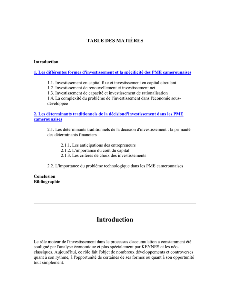 TABLE DES MATIÈRES Introduction 1. Les différentes formes d'investissement et la spécificité des PME camerounaises 1.1. Investissement en capital fixe et investissement en capital circulant 1.2. Investissement de renouvellement et investissement net 1.3. Investissement de capacité et investissement de rationalisation 1.4. La complexité du problème de l'investissement dans l'économie sousdéveloppée 2. Les déterminants traditionnels de la décisiond'investissement dans les PME camerounaises 2.1. Les déterminants traditionnels de la décision d'investissement : la primauté des déterminants financiers 2.1.1. Les anticipations des entrepreneurs 2.1.2. L'importance du coût du capital 2.1.3. Les critères de choix des investissements 2.2. L'importance du problème technologique dans les PME camerounaises Conclusion Bibliographie Introduction Le rôle moteur de l'investissement dans le processus d'accumulation a constamment été souligné par l'analyse économique et plus spécialement par KEYNES et les néoclassiques. Aujourd'hui, ce rôle fait l'objet de nombreux développements et controverses quant à son rythme, à l'opportunité de certaines de ses formes ou quant à son opportunité tout simplement. Si les apports théoriques contemporains sur le sujet 1 permettent de prolonger ou d'élargir le champ des investigations au cadre spécifique des micro-comportements, ils présentent surtout, par rapport à l'analyse sur les PME camerounaises un intérêt particulier. L'aspect majeur de cet intérêt est la démarche que ces différentes analyses suscitent et que l'on peut situer ici à trois niveaux : • • • au niveau de la nature de l'investissement au niveau des facteurs déterminants de l'investissement au niveau du comportement actif ou passif des entrepreneurs dans la régulation de l'activité. La prise en compte de ces préoccupations nous semble de nature à contribuer à l'analyse de la spécificité de l'investissement dans les PME camerounaises. Elle devra nous permettre notamment d'en dégager les caractéristiques par rapport à l'analyse théorique, puis d'en déterminer l'impact sur le processus de développement de ces unités de production. En fait, les PME camerounaises possèdent un certain nombre de particularités qui peuvent expliquer que l'on s'interroge sur les possibilités réelles de développement de l'investissement dans l'économie camerounaise par le biais de ces entreprises. D'une manière générale, les PME peuvent être définies comme des unités à l'échelle humaine ou familiale souvent dirigées par un seul homme propriétaire du capital qui assume ou cherche à assumer toutes les fonctions essentielles de l'entreprise. Cette définition, si elle est générale et peut s'appliquer à l'ensemble des PME, elle nous permet notamment de souligner deux caractéristiques majeures inhérentes à la manière dont naissent et fonctionnent les PME camerounaises. La première est relative à la propriété du capital et au mode de financement de l'activité, la deuxième, à l'organisation et à la structure de l'entreprise qui en découle. Cette caractérisation permet en effet de comprendre et de poser les principaux problèmes relevés à l'observation des PME camerounaises 2 , à savoir : • • • la faiblesse de leurs ressources propres et l'importance des coûts financiers que les PME doivent supporter du fait du recours à des ressources d'emprunt dont les crédits bancaires l'importance des coûts technologiques et des consommations intermédiaires inhérents aux choix sectoriels et à une mauvaise maîtrise d'une technologie empruntée et appliquée à l'outil de production une organisation sommaire de l'activité et de sa gestion qui aggrave, nous semblet-il, l'ensemble des coûts et des charges récurrentes de l'entreprise et dont le caractère évolutif témoigne des limites de l'effet de levier financier de l'endettement. Les appréhensions par rapport à ces problèmes des PME camerounaises se justifient pour au moins deux raisons : celle liéecaractère structurel des difficultés des PME et celle attachée à la complexité de l'investissement et que ces problèmes laissent entrevoir. Certaines des questions qu'il convient alors de se poser se rapportent aux conditions de création d'un investissement efficient dans ces PME puis à la capacité de ces entreprises à intégrer suffisamment ces contraintes dans leur décision d'investir. En effet ce qui caractérise l'investissement c'est le temps long et les étapes successives nécessaires pour créer une richesse. Cette variable s'apprécie alors sur un double plan économique et financier : • • sur le plan économique il consiste en la création d'un capital physique qui contribue à l'activité de production sur plusieurs cycles successifs; sur le plan financier, il se rapporte à l'immobilisation de capitaux dans une perspective de profits. Cette double nature de l'investissement met en lumière, à notre avis, deux aspects fondamentaux : • • d'abord l'investissement est un arbitrage entre le présent et le futur lequel conduit à engager une dépense immédiate puis à en attendre les effets dans un futur plus ou moins lointain; ensuite, l'investissement est un pari. Ainsi, que l'on raisonne dans un avenir certain ou dans un univers incertain, l'entrepreneur qui décide d'investir prend un risque. Il peut s'agir aussi bien d'un risque économique que d'un risque financier. Le risque économique tient à la variabilité possible des résultats due à des modifications pouvant intervenir dans la concurrence, la technologie, la conjoncture... Quant au risque financier, il se rapporte au recours à des capitaux d'emprunt pour boucler le financement du projet ou de l'activité de l'entreprise. Risque et anticipation semblent donc être des caractéristiques importantes de l'investissement qui nous amènent au questionnement suivant : • • d'abord quelle est la nat