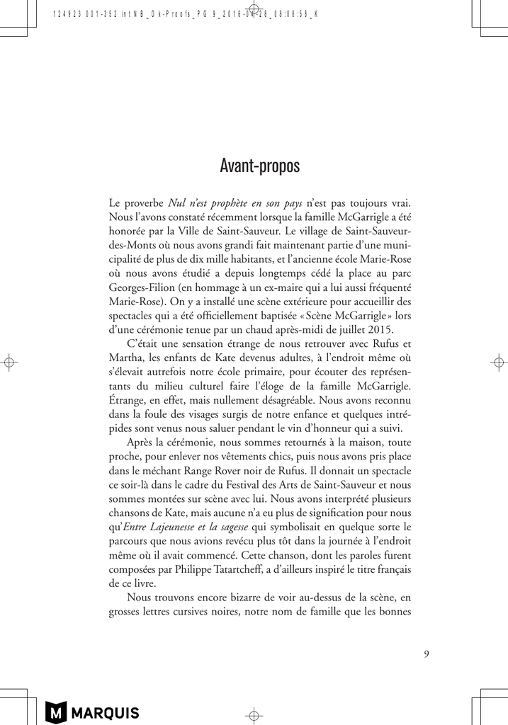 124923 001-352 int NB_Ok-Proofs_PG 9_2016-04-28_08:08:58_K Avant-propos Le proverbe Nul n’est prophète en son pays n’est pas toujours vrai. Nous l’avons constaté récemment lorsque la famille McGarrigle a été honorée par la Ville de Saint-Sauveur. Le village de Saint-Sauveurdes-Monts où nous avons grandi fait maintenant partie d’une municipalité de plus de dix mille habitants, et l’ancienne école Marie-Rose où nous avons étudié a depuis longtemps cédé la place au parc Georges-Filion (en hommage à un ex-maire qui a lui aussi fréquenté Marie-Rose). On y a installé une scène extérieure pour accueillir des spectacles qui a été officiellement baptisée « Scène McGarrigle » lors d’une cérémonie tenue par un chaud après-midi de juillet 2015. C’était une sensation étrange de nous retrouver avec Rufus et Martha, les enfants de Kate devenus adultes, à l’endroit même où s’élevait autrefois notre école primaire, pour écouter des représentants du milieu culturel faire l’éloge de la famille McGarrigle. Étrange, en effet, mais nullement désagréable. Nous avons reconnu dans la foule des visages surgis de notre enfance et quelques intrépides sont venus nous saluer pendant le vin d’honneur qui a suivi. Après la cérémonie, nous sommes retournés à la maison, toute proche, pour enlever nos vêtements chics, puis nous avons pris place dans le méchant Range Rover noir de Rufus. Il donnait un spectacle ce soir-là dans le cadre du Festival des Arts de Saint-Sauveur et nous sommes montées sur scène avec lui. Nous avons interprété plusieurs chansons de Kate, mais aucune n’a eu plus de signification pour nous qu’Entre Lajeunesse et la sagesse qui symbolisait en quelque sorte le parcours que nous avions revécu plus tôt dans la journée à l’endroit même où il avait commencé. Cette chanson, dont les paroles furent composées par Philippe Tatartcheff, a d’ailleurs inspiré le titre français de ce livre. Nous trouvons encore bizarre de voir au-dessus de la scène, en grosses lettres cursives noires, notre nom de famille que les bonnes 9 124923 001-352 int NB_Ok-Proofs_PG 10_2016-04-28_08:08:58_K sœurs de Marie-Rose prononçaient « Mégarégueule » avec beaucoup de mal. Comme nous aurions voulu nous appeler Fortin ou Chartier ! Nous aurions tant aimé porter un patronyme typique des Laurentides que tout le monde aurait pu articuler avec aisance ! Nous sommes maintenant résignées à conserver notre nom… plus que jamais. 124923 001-352 int NB_Ok-Proofs_PG 11_2016-04-28_08:08:59_K Introduction I am a Diamond En juin 2012, deux ans après que le cancer eut prématurément emporté notre sœur Kate, le festival Luminato de Toronto a organisé un spectacle en son honneur au Massey Hall. Le producteur Joe Boyd a réuni, avec l’aide de Catherine Steinmann, une trentaine d’invités spéciaux, de musiciens et de membres de la famille. C’est lui qui avait réalisé les deux premiers disques de Kate et Anna parus chez Warner : Kate & Anna McGarrigle (coproduit avec Greg Prestopino en 1975) et Dancer with Bruised Knees (1977). Il avait aussi mis en scène deux autres concerts – à Londres et à New York – pour rendre hommage à notre sœur et à sa musique. ANNA : Le spectacle présenté au Massey Hall a eu un succès retentissant. Pour que tout soit parfait, il aurait suffi que Kate se pointe en flottant sur la scène, qu’elle empoigne son banjo et qu’elle nous chante Red Rocking Chair, une complainte des Appalaches qui mettait en valeur son frailing entraînant. Avec son sens inné du rythme, notre sœur était la barreuse de la chasse-galerie McGarrigle*. Ses enfants, Rufus et Martha Wainwright, ont animé la soirée avec beaucoup de chaleur et les musiciens de l’orchestre avaient tous, à un moment ou à un autre, travaillé avec Kate et moi, certains durant de nombreuses années, comme Chaim Tannenbaum, Joel Zifkin, Michel Pépin et mon mari Dane Lanken. Au micro, chaque invité révélait une nouvelle facette lumineuse du diamant qu’était Kate : de la chanson légère NaCl (Sodium Chloride) sur l’union de deux atomes amoureux pour créer le sel jusqu’à la sombre élégie I Eat Dinner sur la mort du désir et son refrain lancinant, « When the hunger’s gone » * Comme sur l’illustration réalisée par Henri Julien pour accompagner la légende La chasse-galerie d’Honoré Beaugrand. 11 124923 001-352 int NB_Ok-Proofs_PG 12_2016-04-28_08:08:59_K (Quand on n’a plus faim). Ce soir-là, ma fille Lily Lanken et moi avons interprété Jacques et Gilles qui raconte l’exode d’un million de Canadiens français partis travailler dans les usines de textile de la Nouvelle-Angleterre entre 1830 et 1930. Cette conversation entre une mère et sa jeune fille est une leçon d’histoire touchante, présentée sous la forme d’une chansonnette pour enfants. Kate avait l’intention de l’intégrer au prologue d’une comédie musicale qu’elle écrivait sur Jack Kerouac. Plus tôt dans la semaine, le directeur artistique de Luminato, Jörn Weisbrodt, m’avait conviée à participer à une « illumination » à l’heure du midi, une discussion sur le thème de la « créativité » et, spécialement, sur l’œuvre de Kate. Je partageais la scène avec deux vieux amis, le romancier Michael Ondaatje et le pianiste Tom Mennier, en plus d’une invitée-surprise aux voix : Lily. Notre entretien était ponctué de chansons de Kate interprétées par Tom. Au cours de cette rencontre, Michael O. et moi avons parlé des personnes excentriques et de leur apport involontaire au processus créatif. Nous avions tous deux quelques personnages de ce genre parmi nos proches. D’ailleurs, Michael en avait décrit dans ses mémoires intitulées Un air de famille. J’ai raconté aux spectateurs comment notre grand-père maternel, Arthur Latrémouille, avait sillonné Montréal en autobus avec une tête de porc dans une vieille va