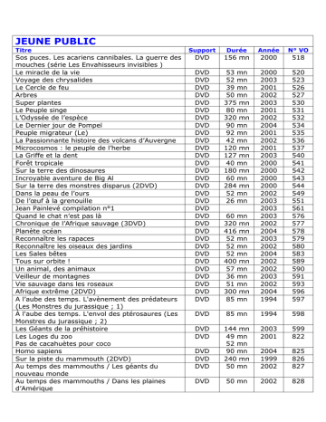JEUNE PUBLIC Titre Sos puces. Les acariens cannibales. La guerre des mouches (série Les Envahisseurs invisibles ) Le miracle de la vie Voyage des chrysalides Le Cercle de feu Arbres Super plantes Le Peuple singe L’Odyssée de l’espèce Le Dernier jour de Pompeï Peuple migrateur (Le) La Passionnante histoire des volcans d’Auvergne Microcosmos : le peuple de l’herbe La Griffe et la dent Forêt tropicale Sur la terre des dinosaures Incroyable aventure de Big Al Sur la terre des monstres disparus (2DVD) Dans la peau de l’ours De l’œuf à la grenouille Jean Painlevé compilation n°1 Quand le chat n’est pas là Chronique de l’Afrique sauvage (3DVD) Planète océan Reconnaître les rapaces Reconnaître les oiseaux des jardins Les Sales bêtes Tous sur orbite ! Un animal, des animaux Veilleur de montagnes Vie sauvage dans les roseaux Afrique extrême (2DVD) A l’aube des temps. L'avènement des prédateurs (Les Monstres du jurassique ; 1) À l'aube des temps. L'envol des ptérosaures (Les Monstres du jurassique ; 2) Les Géants de la préhistoire Les Loges du zoo Pas de cacahuètes pour coco Homo sapiens Sur la piste du mammouth (2DVD) Au temps des mammouths / Les géants du nouveau monde Au temps des mammouths / Dans les plaines d’Amérique Support Durée Année N° VO DVD 156 mn 2000 518 DVD DVD DVD DVD DVD DVD DVD DVD DVD DVD DVD DVD DVD DVD DVD DVD DVD DVD DVD DVD DVD DVD DVD DVD DVD DVD DVD DVD DVD DVD DVD 53 mn 52 mn 39 mn 50 mn 375 mn 80 mn 320 mn 90 mn 92 mn 42 mn 120 mn 127 mn 40 mn 180 mn 60 mn 284 mn 52 mn 26 mn 60 mn 320 mn 416 mn 52 mn 52 mn 52 mn 400 mn 57 mn 36 mn 51 mn 300 mn 85 mn 2000 2003 2001 2002 2003 2001 2002 2004 2001 2002 2001 2003 2000 2000 2000 2000 2002 2003 2003 2003 2002 2004 2003 2002 2004 2002 2002 2003 2002 2004 1994 520 523 526 527 530 531 532 534 535 536 537 540 541 542 543 544 549 551 561 576 577 578 579 580 583 589 590 591 593 596 597 DVD 85 mn 1994 598 DVD DVD 2003 2001 599 822 DVD DVD DVD 144 mn 49 mn 52 mn 90 mn 240 mn 50 mn 2004 1999 2002 825 826 827 DVD 50 mn 2002 828 Titre Au temps des mammouths / La disparition des géants américains La planète bleue Les bêtes Avoir cent ans Sur la terre de nos ancêtres Retour vers le néolithique Apollo en route vers les étoiles DVD1 Apollo 11 Le premier pas sur la lune DVD2 Apollo 17 La dernière mission sur la lune DVD3 Super size me Le relief de l’invisible Un voyage autour de la terre Genesis : et l'homme créa la nature. (3DVD) Animaux du désert – Gazelle, petites créatures, Fennec et Chat des sables. Animaux du désert – Reptiles et cobras. L’aventure spatiale (3DVD) L’aventure des plantes Vol.1 L’aventure des plantes Vol.2 L’aventure des plantes Vol.3 L’aventure des plantes Vol.4 Patagonie, terre du sud . Vol. 1 Patagonie, terre du sud . Vol. 2 Les blés d’or La Mygale de la Soufrière Un géant sous la banquise Grand requin blanc sous surveillance Guépard : la course pour la vie Le royaume de l'ours polaire Hiboux, les tueurs de l'ombre Les armes du crocodile Cobras souverains de l'Inde Anacondas les géants du Venezuela Serpents d'Afrique mortelles rencontres Voyage autour du soleil L'affaire coccinelle La jetée Le magicien d’Oz – Collection cinéma légende C’est pas sorcier : Le corps humain, de la tête aux pieds : Le squelette, Muscles et souplesse, Les sorciers se font la main, La bipédie, c’est le pieds. C’est pas sorcier : Ces bêtes qui nous font peur : Les requins, Les chauves-souris, Les araignées, Les serpents. Support Durée Année N° VO DVD 50 mn 2002 829 DVD DVD DVD DVD DVD DVD DVD DVD DVD DVD DVD DVD DVD 87 mn 66 mn 78 mn 90 mn 90 mn 80 mn 30 mn 30 mn 98 mn 72 mn 52 mn 364 mn 120 mn 830 835 836 841 842 852 852 852 853 854 855 859 860 DVD 120 mn DVD DVD DVD DVD DVD DVD DVD DVD DVD DVD DVD DVD DVD DVD DVD DVD DVD DVD DVD DVD DVD DVD DVD 476 mn 78 mn 72 mn 72 mn 104 mn 75 mn 75 mn 35 mn 26 mn 52 mn 52 mn 52 mn 60 mn 52 mn 52 mn 52 mn 52 mn 52 mn 100 mn 31 mn 29 mn 87 mn 105 mn 2004 2001 2004 2002 2005 2001 2001 2001 2004 2004 2005 2004 1997 2000 1997 2000 2004 2005 2005 2005 2005 2005 2005 2005 2004 2004 2001 2003 1997 2000 2002 1997 1998 2000 2004 2006 1962 2004 2008 862 874 875 876 877 882 883 884 910 934 935 936 937 938 939 940 941 942 951 953 1001 1170 1171 DVD 105 mn 2008 1172 861 Titre Support Durée Année N° VO C’est pas sorcier : Histoires de pierres : Pont du Gard et Arènes de Nîmes, La Cité de Carcassonne, Sous le soleil de Versailles, Les fortifications de Vauban. C’est pas sorcier : Les phénomènes géologiques : Les déserts, L’oasis, Les volcans, l’Etna. DVD 105 mn 2008 1173 DVD 105 mn 2002 1174 C’est pas sorcier : Volcans, séismes et tout le tremblement C’est pas sorcier : Les Solutions techniques appliquées à l’informatique et à Internet C’est pas sorcier : Spécial baleines C’est pas sorcier : Les énergies - Restez au courant : Ca gaz ! Les barrages, L’énergie nucléaire, Que faire des déchets nucléaires ? C’est pas sorcier : Les caprices de la météo : La météo des sorciers, Les orages, Gare aux inondations, Alerte à la sécheresse. C’est pas sorcier : La médecine, à votre santé : Le secourisme, L’anesthésie, Les médicaments, Les antibiotiques. C’est pas sorcier : L’espace : Le système solaire, La lune, Les étoiles, Les comètes et les astéroïdes. C’est pas sorcier : Les quatre saisons : C’est le printemps, La plage, L’automne, Le père noël. C’est pas sorcier : Drôles de plantes : Mystérieuse Mangrove, Le trésor des tourbières, Les cactus, Le bambou. C’est pas sorcier : La conquête des mers : Le Belem, Les phares, Les vaisseaux, Les porteavions. C’est pas sorcier : La conquête spatiale : Ariane 5, Les satellites, La terre vue de l’espace, Vol en impesanteur. C’est pas sorcier : La conquête du ciel : Le vol à voile, Les dirigeables, Les avions de chasse, Les hélicoptères. C’est pas sorcier : Les propriétés des métaux C’est pas s