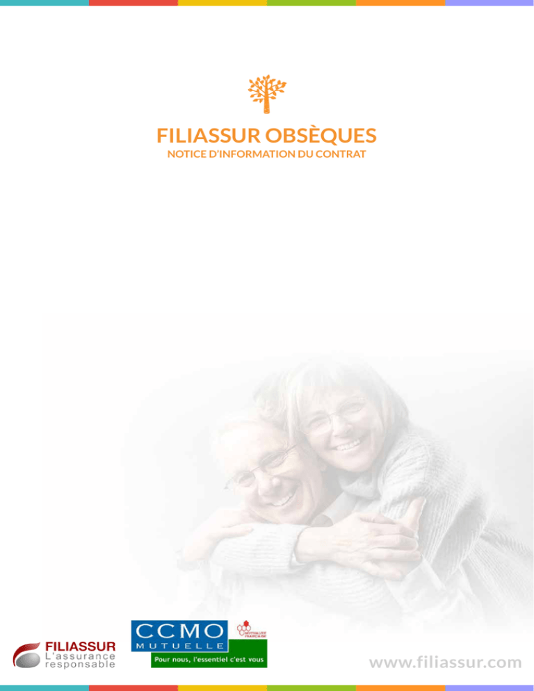 FILIASSUR OBSÈQUES NOTICE D’INFORMATION DU CONTRAT www.filiassur.com FILIASSUR OBSÈQUES NOTICE D’INFORMATION DU CONTRAT Contrat collectif d’assurance « FILIASSUR OBSÈQUES » à adhésion facultative souscrit par l’Association APSE au bénéfice de ses adhérents auprès de CCMO Mutuelle, assureur, et géré et distribué par FILIASSUR (immatriculation au registre des intermédiaires d’assurance n° 07 031 054) en sa qualité de courtier d’assurances. APSE : Association pour la Prévoyance, la Santé et l’Environnement, Association à but non lucratif régie par la loi du 1er juillet 1901, ayant son siège social 61, boulevard Haussmann - 75008 PARIS, ci-après dénommée « Association » et agissant en qualité de Souscripteur. CCMO Mutuelle : Mutuelle soumise aux dispositions du Livre II du Code de la Mutualité, SIREN n° 780 508 073, ayant son siège social 6, avenue du Beauvaisis - PAE du Haut Villé - CS 50993 - 60014 BEAUVAIS Cedex, Agréée par arrêté n° SANS0322862A du 21 juillet 2003 pour pratiquer les opérations relevant des branches ou sous branches mentionnées à l’article R211-2 du Code de la mutualité : n° 1, 2, 20 et 21, ci-après dénommé « CCMO » et agissant en qualité d’assureur. FILIASSUR : Société par action simplifiée au capital de 37 500 €, ayant son siège social 61, boulevard Haussmann - 75008 PARIS, immatriculée au RCS de PARIS sous le n° 498 850 445, société de courtage d’assurances immatriculée auprès de l’ORIAS sous le n° 07 031 054 (vérifiable sur le site internet de l’ORIAS www.orias.fr). Autorité chargée du contrôle de CCMO Mutuelle et de FILIASSUR : Autorité de Contrôle Prudentiel et de Résolution 61, rue Taitbout - 75436 PARIS CEDEX 09. Ce contrat relève de la branche 20 (vie-décès) pour laquelle CCMO Mutuelle a reçu un agrément. Le régime fiscal est celui de l’assurance-vie. L’adhésion à FILIASSUR OBSÈQUES est composée : - De la présente notice d’information, - Du certificat individuel d’adhésion. Le nombre d’adhésion à FILIASSUR OBSÈQUES est limité au nombre de trois par Adhérent/Assuré. DÉFINITIONS Adhérent/Assuré : personne physique désignée sur le certificat individuel d’adhésion, chargée du paiement des cotisations et sur laquelle reposent les risques. L’Adhérent et l’Assuré sont une seule et même personne. Bénéficiaire en cas de décès : personne physique ou morale désignée par l’Adhérent/Assuré, qui percevra le capital garanti en cas de réalisation du risque. Accident : évènement soudain, extérieur à l’Adhérent, non intentionnel de sa part et générateur d’une atteinte corporelle. Ne sont pas considérés comme des accidents les maladies chroniques ou aiguës telles que l’apoplexie, l’infarctus du myocarde, les ruptures d’anévrisme, l’épilepsie et les accidents vasculaires cérébraux ischémiques ou hémorragiques. Délai d’attente : durée à compter de la date d’effet de l’adhésion à FILIASSUR OBSÈQUES pendant laquelle seul le décès accidentel est couvert par l’Assureur. CARACTÉRISTIQUES DE VOTRE ADHÉSION Objet : Le contrat a pour objet le versement au(x) bénéfciaire(s) désigné(s) du montant du capital garanti à la date du décès, en cas de décès de l’Adhérent/Assuré, quel que soit son âge. Le capital décès est : - Le capital choisi, mentionné sur le certificat individuel d’adhésion, - Majoré des participations aux résultats - Minoré en cas d’arrêt de paiement des cotisations. En cas de décès suite à un accident, la garantie est acquise dès la prise d’effet de l’adhésion. En cas de décès non accidentel survenant au cours du délai d’attente de 2 ans, l’Assureur s’engage à rembourser à la succession de l’Adhérent/Assuré le montant des cotisations déjà versées. En cas de décès par suicide au cours des deux premières années, une somme égale à la provision mathématique à la date du décès est versée. Conditions d’adhésion : L’adhérent/Assuré doit être âgé entre 30 ans et 85 ans à la date de demande d’adhésion. Montant des garanties à l’adhésion : Le montant du capital choisi librement par l’Adhérent/Assuré lors de la demande d’adhésion doit être compris entre 1 000 et 6 000 euros au cumul des adhésions. Prise d’effet de l’adhésion : Compte tenu du mode de commercialisation utilisé, l’adhésion au contrat prend effet à la date de l’enregistrement vocal de l’accord verbal de souscription donné par l’Adhérent le jour de la présentation du présent contrat par téléphone. Après enregistrement de son adhésion, l’Adhérent/Assuré recevra un certificat individuel d’adhésion qui matérialisera son adhésion au présent contrat. De convention expresse, il est convenu que le certificat individuel d’adhésion sera présumé reçu à défaut de manifestation de la part de l’Adhérent/Assuré dans un délai de 30 jours suivant la date d’effet de l’adhésion. Prise d’effet des garanties : La garantie prend effet à l’issue d’un délai de carence de 2 ans à compter de la date d’effet de l’adhésion au contrat, en cas de décès non accidentel et immédiatement en cas de décès accidentel. Durée de l’adhésion : Sous réserve des cas de résiliation (cf paragraphe relatif à la résiliation), l’adhésion au Contrat dure un an et se renouvelle d’année en année à la date anniversaire de l’adhésion par tacite reconduction. Cessation de garanties : Les garanties prennent fn à la date de résiliation de l’adhésion au Contrat ou le jour du décès de l’Adhérent/Assuré, ou encore après le versement de la valeur de rachat totale à l’Adhérent/Assuré. TERRITORIALITÉ Les garanties sont acquises en France et dans les autres pays du monde entier lors de séjours à l’étranger de moins de 3 mois. COTISATIONS Détermination du montant des cotisations à l’adhésion : L