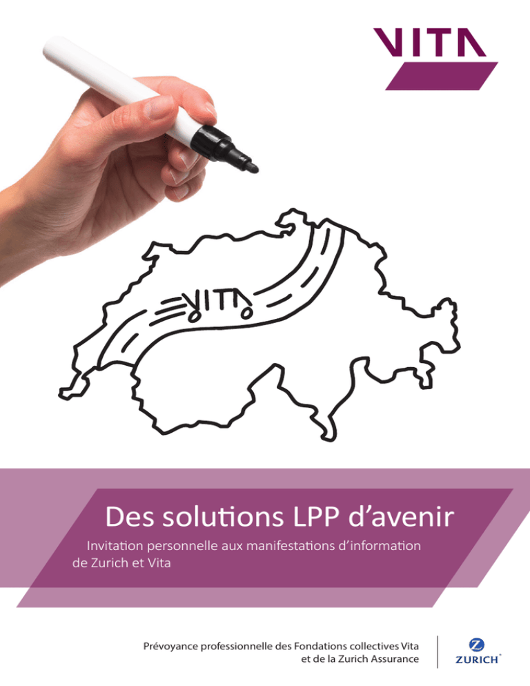 Des solutions LPP d’avenir Invitation personnelle aux manifestations d’information de Zurich et Vita Prévoyance professionnelle des Fondations collectives Vita et de la Zurich Assurance Nous répondons à vos demandes. Car nous sommes là où vous êtes. Sous la marque Vita, les Fondations collectives Vita et Zurich proposent aux entreprises de toutes tailles des solutions de prévoyance professionnelle conformes à la LPP. Les caisses de pension et les investisseurs institutionnels bénéficient chez Zurich de solutions de placement et de gestion des risques modulaires ainsi que d’un excellent service à la clientèle. Zurich et les Fondations collectives Vita vous présentent les solutions LPP et stratégies de placement qui vous permettront d’assurer l’avenir de vos clients. Les manifestations d’information se tiennent tout près de chez vous: Zurich, Park Hyatt Lundi 4 avril 2016 9h30–14h00 Lausanne, Hôtel Beau Rivage Palace Lundi 18 avril 2016 9h30–14h00 Bâle, Ramada Plaza Mardi 5 avril 2016 9h30–14h00 Genève, Mandarin Oriental Mardi 19 avril 2016 9h30–14h00 Berne, Hôtel Schweizerhof Jeudi 7 avril 2016 9h30–14h00 Lugano, Lugano Arte e Cultura Jeudi 21 avril 2016 9h30–14h00 Lucerne, Hôtel Palace Vendredi 22 avril 2016 9h30–14h00 Programme du 4 au 22 avril 2016 09h30 Café de bienvenue 10h00 Mot d’accueil Vita – prévoyance professionnelle Marc Olivier Delévaux Sous la marque Vita, les Fondations collectives Vita et Zurich proposent des solutions de prévoyance professionnelle aux entreprises opérant sur le marché suisse. Des conseils de fondation engagés défendent activement les intérêts des assurés et des entreprises affiliées tandis que des experts de Zurich assurent un service clientèle hautement qualitatif et se chargent de l’assurance des risques «longévité», «invalidité» et «décès». Venez découvrir comment la marque Vita applique le modèle de partenariat et quels en sont les avantages pour les assurés et les entreprises affiliées. Situation tendue entre longévité et phase de taux d’intérêts bas Philippe Rivière La phase de taux d’intérêts bas se poursuit tandis que nous continuons à prendre de l’âge. Quels sont les problèmes rencontrés par les caisses de pension et quelles sont les solutions pour y remédier? Pourquoi nos bons résultats ne sont-ils pas dus au hasard: exemples concrets Juan Martini La Zurich fondation de placement propose une gamme complète de solutions de placement attrayantes. Grâce à nos processus de sélection et de contrôle éprouvés, nous offrons aux Fondations collectives Vita et à d’autres institutions de prévoyance les meilleures conditions pour obtenir de bons résultats. À l’aide de trois exemples concrets, nous vous démontrons en quoi nos bons résultats ne sont pas le fruit du hasard et vous présentons nos solutions. 11h30 Discussion, questions et réponses 11h45 Déjeuner (buffet) Qui vous y attend Marc Olivier Delévaux Responsable Distribution Clientèle Entreprises, Zurich Compagnie d'Assurances sur la Vie SA Philippe Rivière Consultant en Prévoyance Professionnelle, Zurich Compagnie d’Assurances sur la Vie SA Juan Martini Institutional Clients, Zurich Invest SA Ce qui vous attend De par les sujets abordés, ces manifestations s’adressent avant tout aux décideurs des institutions de prévoyance du personnel ainsi qu’aux courtiers en assurance, aux agents et aux conseillers des caisses de pension. Inscrivez-vous sans tarder Le nombre de places est limité. Nous vous prions donc de vous inscrire à la manifestation de votre choix au plus tard d’ici le 15 mars 2016 à l’aide du bulletin-réponse. Vous recevrez de notre part une confirmation de participation avec des informations détaillées. Fondations collectives Vita Hagenholzstrasse 60 | 8050 Zurich www.vita.ch FM71621f Inscription Envoyez-nous ce bulletin-réponse le 15 mars 2016 au plus tard: par courrier, par fax au 044 623 38 93 ou par e-mail à [email protected]. Madame Monsieur Nom de l‘entreprise Nom, prénom Adresse NPA, localité TéléphoneE-mail Oui, je souhaite participer à la manifestation Je serai accompagné(e) de Je ne peux malheureusement pas participer Nom, prénom E-mail Je souhaite participer à la manifestation suivante (merci de cocher la case correspondante): Zurich, Park Hyatt Lundi 4 avril 2016 9h30–14h00 Lausanne, Hôtel Beau Rivage Palace Lundi 18 avril 2016 9h30–14h00 Bâle, Ramada Plaza Mardi 5 avril 2016 9h30–14h00 Genève, Mandarin Oriental Mardi 19 avril 2016 9h30–14h00 Berne, Hôtel Schweizerhof Jeudi 7 avril 2016 9h30–14h00 Lugano, Lugano Arte e Cultura Jeudi 21 avril 2016 9h30–14h00 Lucerne, Hôtel Palace Vendredi 22 avril 2016 9h30–14h00 Zurich Compagnie d‘Assurances SA HB 246 – Madame Petra Osterwald Case Postale 8085 Zurich