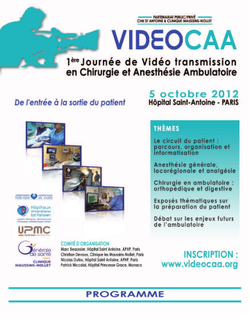 PROGRAMME THÈMES Le circuit du patient : parcours, organisation et informatisation Anesthésie générale, locorégionale et analgésie Chirurgie en ambulatoire : orthopédique et digestive Exposés thématiques sur la préparation du patient Débat sur les enjeux futurs de l’ambulatoire A L’ATTENTION DES Médecins Anesthésistes Réanimateurs Chirurgiens Directeurs d’établissements Responsables d’Unité de Chirurgie Ambulatoire Cadres de Santé, Cadres Administratifs Personnel de bloc : IADE, IBODE Internes en anesthésie et en chirurgie COMITÉ D’ORGANISATION Marc Beaussier, Hôpital Saint Antoine, APHP, Paris Christian Devaux, Clinique les Maussins-Nollet, Paris Nicolas Dufeu, Hôpital Saint Antoine, APHP, Paris Patrick Niccolai, Hôpital Princesse Grace, Monaco Sous l’égide de : Accréditation en cours : CFCOT et CFAR PROGRAMME 8H30 8H40 9H15 - 12H45 PRESENTATION DE LA JOURNÉE Pr. Marc Beaussier (Saint Antoine, APHP Paris) Dr. Christian Devaux (Clinique Maussins-Nollet, GDS Paris) OUVERTURE DE LA JOURNÉE Mme Mireille Faugère, Directrice Générale de l’APHP Paris Mr Pascal Roché, Directeur Général de la Générale de Santé SESSION AVEC PAUSE CAFÉ ET VISITE DES STANDS À 10H45 VIDÉO TRANSMISSION EN DIRECT DE L’UCA SAINT ANTOINE : DISCUSSION INTERACTIVE AVEC LA SALLE en alternance avec DES COMMUNICATIONS EN AMPHITHÉÂTRE Modérateurs 1ère partie : Dr Patrick Niccolai (Hôpital Princesse Grace, Monaco), Dr Laurent Jouffroy (Clinique des Diaconesses, Strasbourg) Modérateurs 2ème partie : Pr Jean-Pierre Triboulet (CHRU Lille, AFCA), Dr Christian Devaux (Clinique Maussins-Nollet, Paris) n VIDÉO TRANSMISSION DU BLOC UCA SAINT ANTOINE avec les équipes chirurgicales et anesthésiques de Saint Antoine APHP Paris Animation : Pr Marc Beaussier (Saint Antoine, APHP Paris), Dr Nicolas Dufeu (Saint Antoine, APHP Paris) Accueil des patients - Préparation - Anesthésie - Chirurgie Chirurgie de l’épaule. Pr Levon Doursounian, Dr Florence Marchand-Maillet Chirurgie du genou. Pr Alain Sautet, Dr Didier Milan Chirurgie de la Hernie Inguinale. Dr Magalie Lefrançois, Dr Mourad Aissou Chirurgie complexe de la main. Dr Nicolas Robert, Dr Bertrand Favre PROGRAMME n COMMUNICATIONS EN AMPHITHÉÂTRE • Actualités institutionnelles en ambulatoire : Pour la Haute Autorité de Santé. Pr René Amalberti Pour la Direction Générale de l’offre des soins. Dr Dominique Martin Pour la Caisse Nationale d’assurance Maladie. Dr Bernard Schmitt Pour l’Agence Régionale de Santé d’Ile de France. Dr Maxime Cauterman • Préparation cutanée du patient ambulatoire Règles - Objectifs - Choix des produits 12H45 14H00 Dr Ludovic Richard (Clinique Maussins-Nollet ,Paris) PAUSE DÉJEUNER ET VISITE DES STANDS VIDÉO TRANSMISSION EN DIFFÉRÉ DE L’UCA DE LA CLINIQUE LES MAUSSINS-NOLLET EN ALTERNANCE AVEC LE DIRECT DE L’UCA DE SAINT ANTOINE Modérateurs 1ère partie : Dr Christian Devaux (Clinique Maussins-Nollet, Paris), Dr Emmanuel Gagneux (CNAM) Modérateurs 2ème partie : Pr Corinne Vons (Jean Verdier, APHP Paris, AFCA), Dr Gilles Bontemps (ANAP) n VIDÉO TRANSMISSON EN DIFFÉRÉ DE L’UCA DE LA CLINIQUE LES MAUSSINS-NOLLET avec les équipes chirurgicales et anesthésiques de la clinique les Maussins-Nollet Accueil des patients - Préparation - Anesthésie - Chirurgie - Validation de sortie • Chirurgie de l’épaule. Dr Geoffroy Nourissat et Dr Gérard Quenet • Chirurgie de la hanche (arthroscopie). Dr Alexis Nogier, Dr Clement Arbouet • Chirurgie du genou. Dr Nicolas Lefèvre, Dr Christian Devaux n VIDÉO TRANSMISSON EN DIRECT DE L’UCA DE SAINT ANTOINE & DISCUSSION INTERACTIVE AVEC LA SALLE Animation : Pr Marc Beaussier (Saint Antoine, APHP Paris), Dr Nicolas Dufeu (Saint Antoine, APHP Paris) Que sont devenus les patients pris en charge dans la matinée ? Le parcours patient de l’entrée à la sortie de l’UCA 16H30 PAUSE CAFÉ ET VISITE DES STANDS PROGRAMME 17H00 n COMMUNICATIONS EN AMPHITHÉÂTRE Modérateurs : Pr Alain Sautet (Saint Antoine, APHP Paris), Dr Gérard Quenet (Clinique Maussins-Nollet, Paris ) • Le patient cardiaque en ambulatoire : Quels médicaments ne pas arrêter ? Pr Vincent Piriou (Lyon) • Gestion des anti-coagulants en ambulatoire : Anti-coagulant oraux - Règles de prescription - Relais Pr. M. Samana (Cochin Port Royal- APHP Paris) 17H30 TABLE RONDE : L’ANALGÉSIE POST OPÉRATOIRE EN AMBULATOIRE Modérateurs : Pr Levon Doursounian (Saint Antoine, APHP Paris), Dr Elisabeth Gaertner (Saint Louis- Lariboisière, APHP Paris) Les besoins et l’offre - Surveillance - Bénéfices et risques Avec la participation des Prs / Drs : Marc Beaussier, Nicolas Dufeu (Saint Antoine, APHP Paris); Goeffroy Nourrissat , Alexis Nogier, Christian Devaux (Clinique Maussins-Nollet, Paris); Corinne Vons (Jean Verdier, APHP Paris) ; Jean Pierre Triboulet (CHRU, Lille); Patrick Niccolai (Hôpital Princesse Grace, Monaco). 18H00 18H10 CONCLUSIONS Pr Marc Beaussier (Saint Antoine, APHP Paris) Dr. Christian Devaux (Clinique Maussins-Nollet, GdS Paris) Fin de la Journée VIDEOCAA INFORMATIONS GÉNÉRALES Comment se rendre à l’Hôpital Saint Antoine LIEU DU CONGRÈS : GRAND AMPHITHÉÂTRE de la Faculté de Médecine - CHU Saint-Antoine 27, rue Chaligny - 75012 Paris Le stationnement n’est pas autorisé dans l’hôpital, merci d’utiliser les parkings à proximité indiqués sur le plan ci-dessus. Accès Train - Gare de Lyon : 10 min à pied ou prendre métro ligne 1, arrêt Reuilly Diderot Accès Métro : Ligne 8 : Faidherbe Chaligny Sortie rue Chaligny Ligne 1 : Reuilly Diderot Sortie rue Chaligny Accès RER : Ligne A : station Gare de Lyon Accès Bus : 86, 46, 57 Accès Voiture : Boulevard Périphérique, sortie Porte de Vincennes, Avenue de la Porte de Vincennes, Cours de Vincennes, Place de la Nation, Rue du Faubourg Saint Antoine. ENTRÉE FACULTÉ Grand Amphi Transfert Aéroport Roissy : Train et Métro : la ligne B du RER dessert Châtelet les Hall