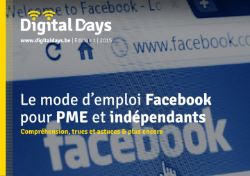 www.digitaldays.be | Edition 1 | 2015 Le mode d’emploi Facebook pour PME et indépendants Compréhension, trucs et astuces & plus encore Ce mode d’emploi vous apprendra : 1. Pourquoi vous devez être présent sur Facebook en tant qu’entreprise Le mode d’emploi Facebook pour PME et indépendants Près d’un Belge sur deux, soit quelque 5,5 millions d’habitants, dispose d’un profil Facebook personnel. Et ce chiffre augmente encore chaque jour. Facebook est assez facile à utiliser dans un contexte personnel, mais lorsqu’il s’agit d’exploiter cette plateforme en tant que canal de communication pour votre entreprise, certains conseils sont indispensables. 2. Comment construire votre page Facebook professionnelle 3. La stratégie de contenu à adopter sur Facebook 4. Comment utiliser Facebook en tant que canal publicitaire 02 PARTIE 1 Introduction & tendances De nombreuses entreprises belges, en particulier les PME, n’exploitent pas encore le potentiel que Facebook peut représenter pour elles, avec ses 5,5 millions d’utilisateurs belges. Elles disposent souvent de trop peu de temps pour s’y intéresser ou elles ont une perception faussée du réseau social. C’est pourquoi nous aimerions vous faire part de quelques informations. Lisez-en plus sur digitaldays.be Quelques statistiques belges concernant Facebook : 5,5 million de comptes Facebook en Belgique 8 sur 10 8 utilisateurs sur 10 se connectent au moins 1x/jour sur Facebook 18 - 64 ans Toutes les catégories d’âge sont bien représentées sur Facebook 20 minutes Facebook, ce n’est pas pour les indépendants et les PME... si ? En tant qu’entrepreneur, indépendant ou PME, vous vous demandez sans doute si Facebook est la plateforme qu’il vous faut. Nous allons donc démystifier pour vous certains aspects. Facebook ? C’est pour les jeunes ! Facebook attire peut-être les jeunes, mais de manière plus générale, les Belges de tous âges sont actifs sur cette plateforme. Sur Facebook, la moyenne d’âge est de 3545 ans et en 2014, la proportion des plus de 55 ans a augmenté de 80 % tandis que celle des jeunes de 13-17 ans a diminué de 25 %. En moyenne, chaque utilisateur passe 20 minutes sur Facebook Important ! Il est donc extrêmement important que vous connectiez votre marque ou votre entreprise au groupe toujours plus important d’utilisateurs Facebook belges. 25% 25% 18-24 25-34 Source : Facebook 2015 Facebook ? C’est dépassé ! Les mauvaises langues prétendent que Facebook est en déclin. Facebook reste pourtant le plus grand réseau social à l’heure actuelle. Et ce n’est pas tout : il s’élargit chaque mois, en Belgique également. Trois quarts des Belges ayant un profil sur Facebook le consultent quotidiennement. Facebook n’a donc pas perdu en popularité. Les chiffres le concernant se situent clairement au-delà de ceux de LinkedIn et Twitter, comptant chacun 1 million d’utilisateurs. D’ailleurs, saviezvous que nous consacrons 20 % de notre temps sur Internet à Facebook ? le plus grand réseau social au monde 35% 15% 35-54 55+ 20 % de notre temps sur Internet est consacré à Facebook 04 PARTIE 2 Créez et promouvez votre propre page Facebook Lisez-en plus sur digitaldays.be PARTIE 2 Créez et promouvez votre propre page Facebook Convaincu(e) par les tendances et les perspectives détaillées dans la première partie ? Grand temps donc de vous mettre à Facebook vous-mêmes ! Nous vous aidons à créer votre propre page Facebook professionnelle. Créer sa propre page Facebook ? C’est simple et rapide ! En quelques clics seulement, vous avez la possibilité de créer une page pour votre entreprise. C’est simple et votre entreprise bénéficiera ainsi de nombreux avantages. Les personnes qui vous chercheront sur Facebook seront donc en mesure de vous y trouver, vous pourrez communiquer avec les clients qui liront vos posts, les partageront avec des amis ou visiteront votre page après s’être rendus dans votre commerce. Et tout ça gratuitement ! Utiliser en tant que: Digital Days Créer un groupe Créer une Page 5+ Étape 1 : Créer une page depuis votre propre compte Pour pouvoir créer une page, vous devez disposer d’un compte personnel sur Facebook et vous être identifié. Cliquez ensuite sur la petite flèche au-dessus et sélectionnez : « Créer une page » 06 Étape 2 : Sélectionnez une catégorie pour votre page Sélectionnez le type de page que vous souhaitez créer. Pour la plupart des PME et des indépendants, il s’agira de « Lieu ou commerce local ». Grâce à cette option, Facebook va faire automatiquement de votre page un lieu que les utilisateurs pourront visiter. Vous pourrez ensuite également ajouter vos heures d’ouverture. Si vous ne le souhaitez pas ou si votre entreprise n’a pas d’emplacement physique, choisissez dans ce cas une autre option comme « Entreprise, organisation ou institution ». Étape 3 : Choisissez votre activité Sélectionnez l’activité correspondant à votre entreprise. Remplissez ensuite quelques informations de base concernant votre entreprise. Cliquez ensuite sur « Démarrer ». Lieu ou commerce local Choisissez une catégorie Nom de lʼentreprise ou du lieu Adresse Ville Lieu ou commerce local Entreprise, organisme ou institution Marque ou produit Code postal Téléphone En cliquant sur Démarrer, vous acceptez les Conditions dʼutilisation des Pages Facebook. Artiste, groupe ou personnalité publique Divertissement Cause ou communauté Démarrer 07 Étape 4 : Complétez les données de votre entreprise Ajoutez une brève description de votre entreprise. Celle-ci figurera sur votre page. Soignez donc votre style et soyez concis. N’oubliez également pas de mentionner l’URL de votre site Internet. Vous avez encore la possibilité de choisir un nom de domaine Facebook unique pour votre page Facebook. Choisissez un nom simple et facile à retenir et à retrouver. Pour Digital Days, il s’agit par exemple d